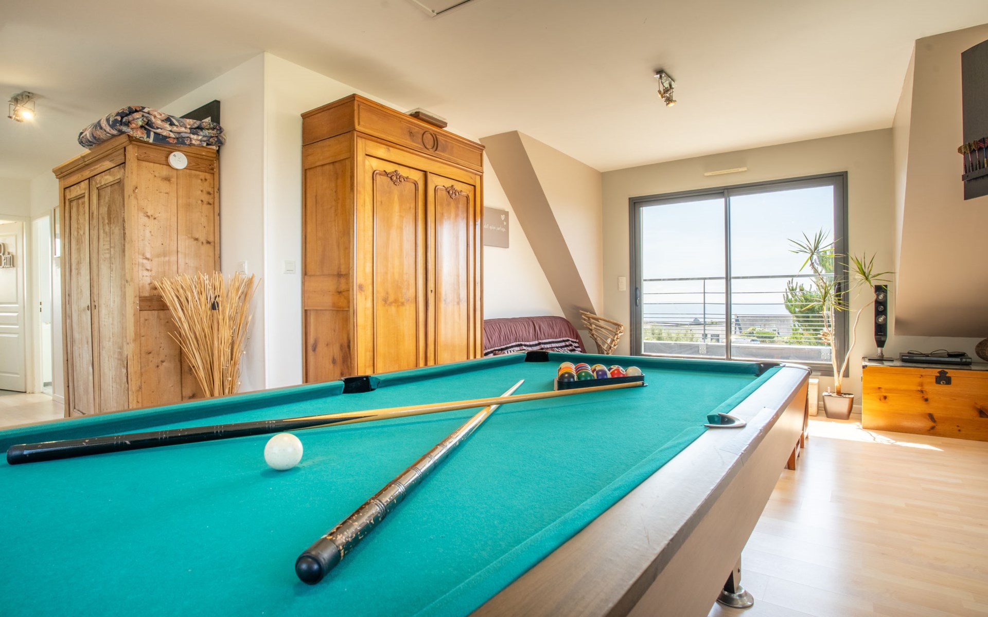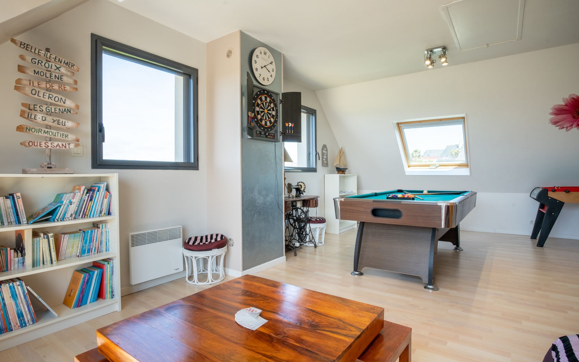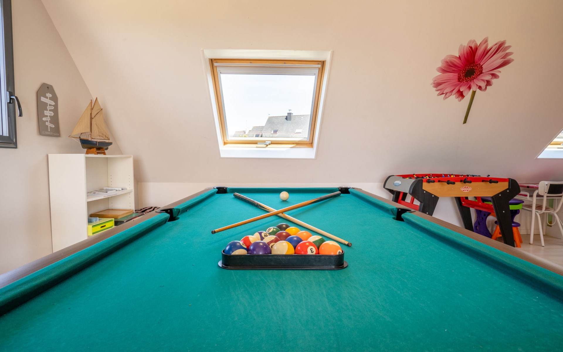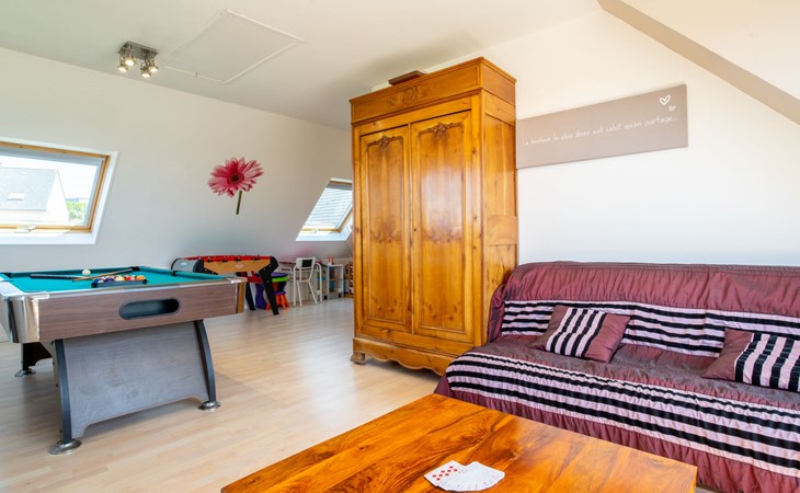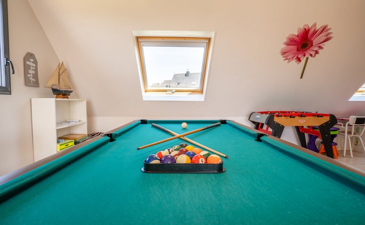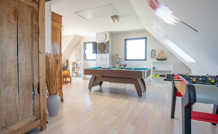 Large, beautiful single-family house "Hidel". In the district of Ruscumunoc 4.5 km from the centre of Plouarzel, 4 km from the centre of Lampaul-Plouarzel, 14 km from the centre of St. Renan, in a quiet position residential area (villas), 300 m from the sea, 300 m from the beach, in a cul-de-sac. Private: property 1'000 m2 (fenced), garden with lawn and wildlife garden. In the house: billiard table, table football. Parking (for 3 cars) on the premises. Shop 4 km, supermarket 4.5 km, bakery 4.5 km, bus stop "Plouarzel Centre" 4.8 km, sandy beach "Plage de Ruscumunoc" 300 m. Sports harbour 15 km, golf course (18 hole) 8 km, indoor tennis centre 4.5 km, walking paths from the house 300 m. Nearby attractions: Aber Ildut 15 km, Parc d'attraction La Récré des 3 Curés 25 km. The owner does not accept any groups.