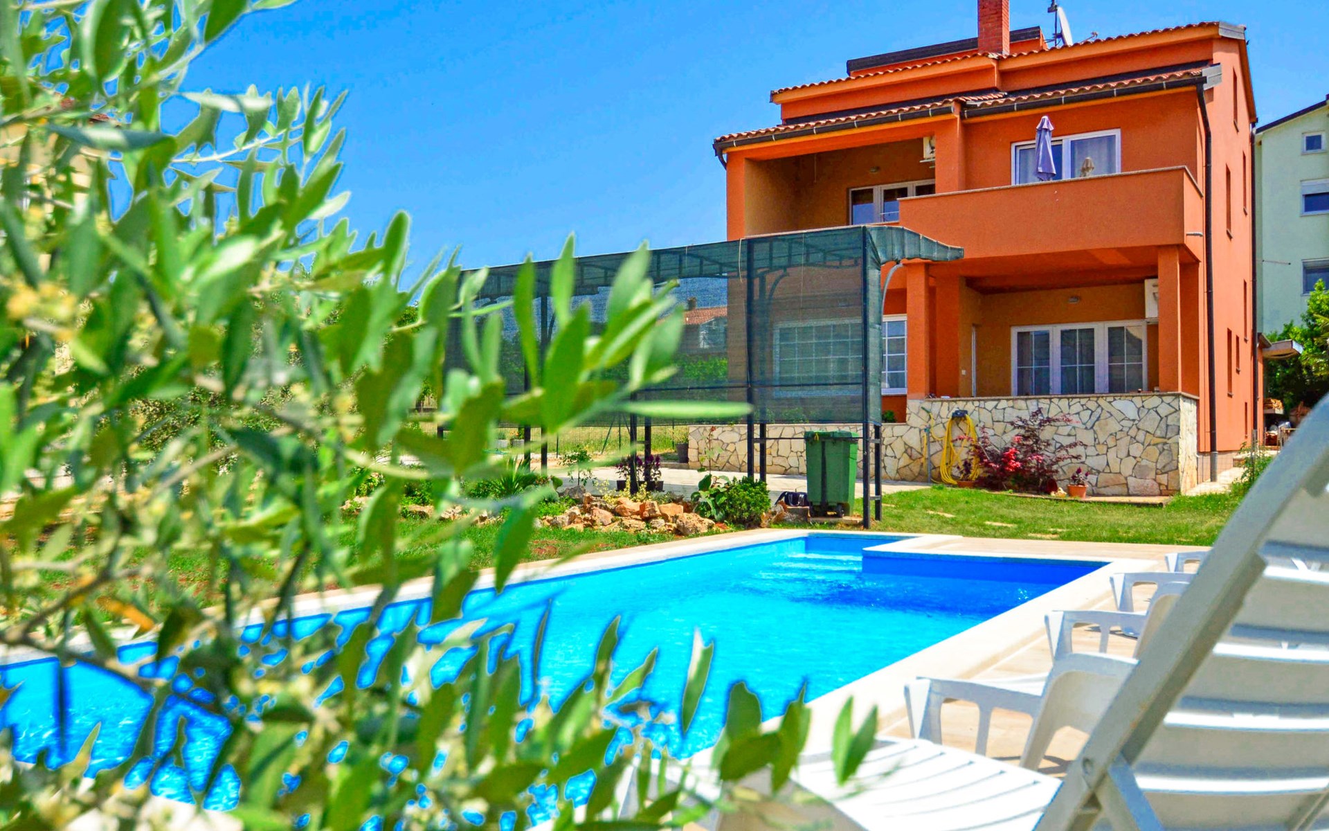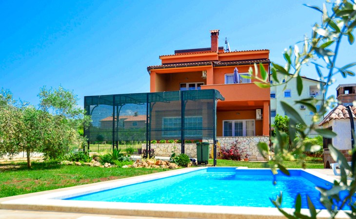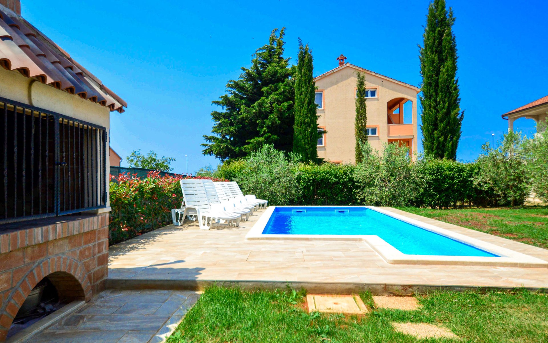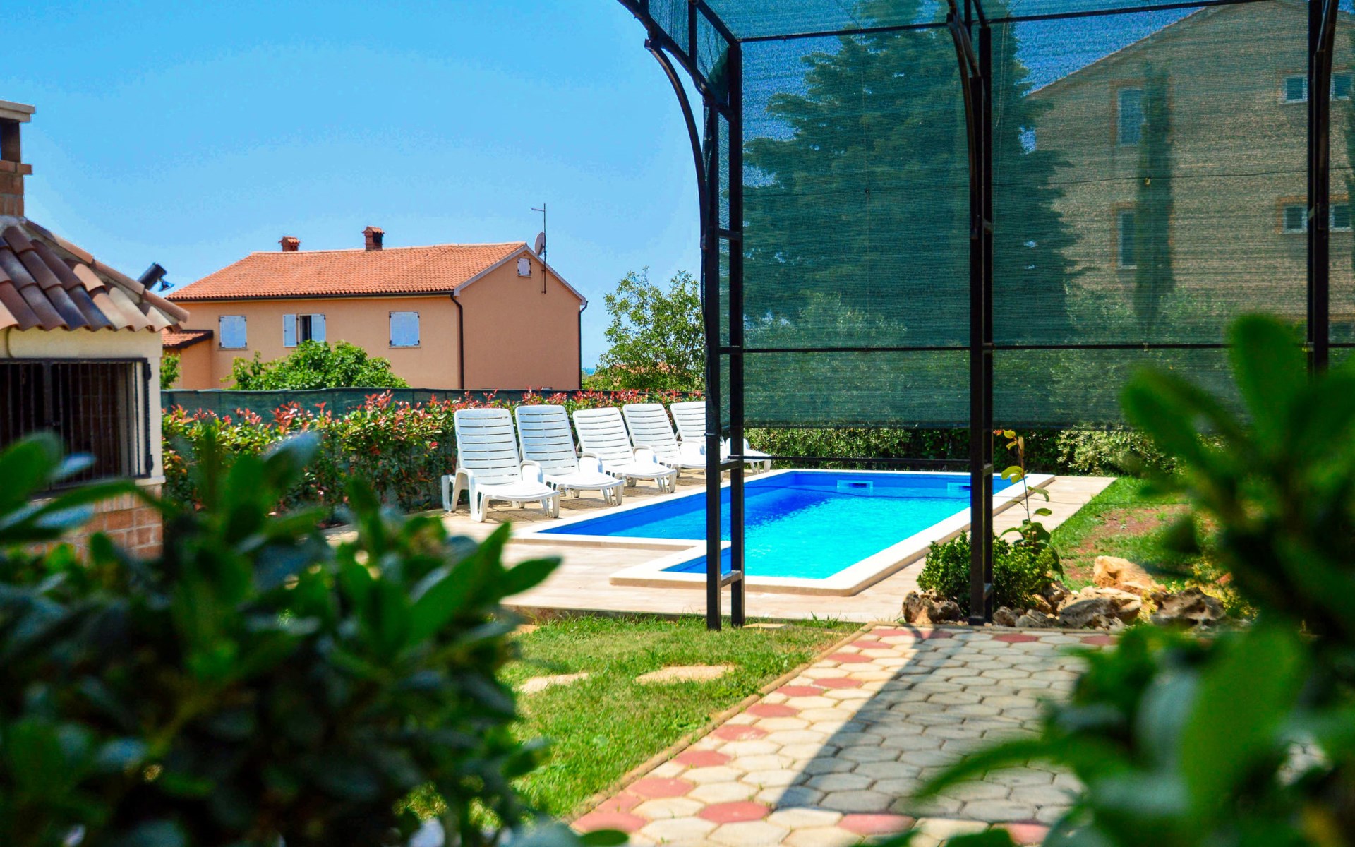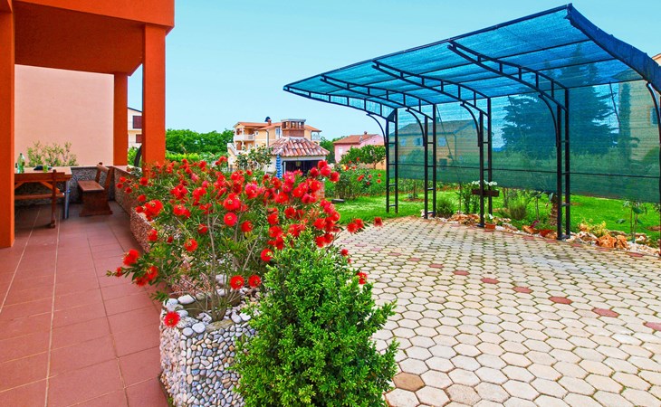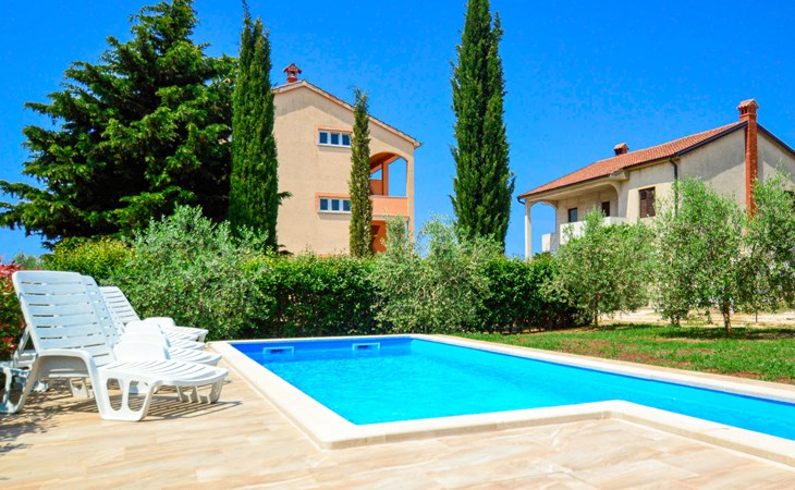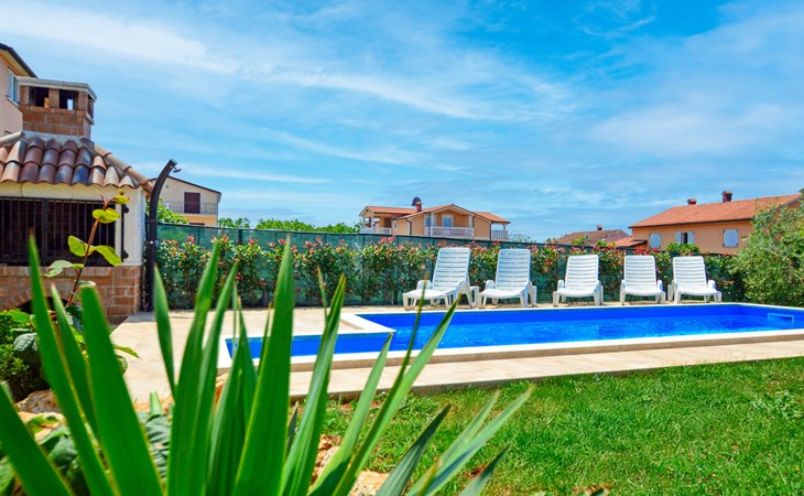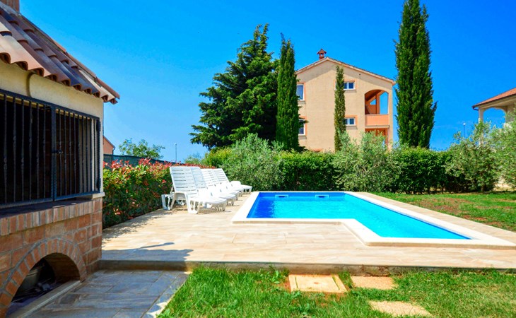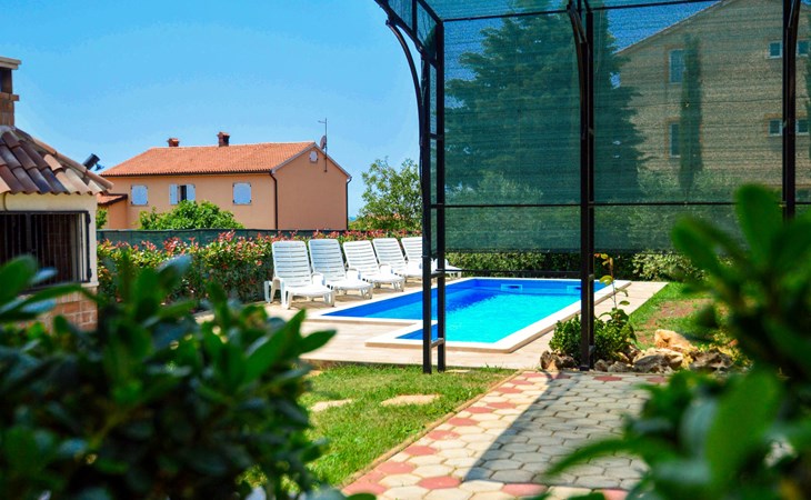 Semi-detached house "Marko", 3 storeys. 2 km from the centre of Novigrad, in a sunny position, 2.5 km from the sea, 2.5 km from the beach. Private: property 400 m2, garden with wildlife garden and trees, swimming pool angular (21 m2, depth 140 cm, seasonal availability: 30.Apr. - 15.Oct.) with internal staircase. Outdoor shower, barbecue (swing). In the house: internet access, washing machine. Parking (for 3 cars) at the house on the premises. Supermarket 2 km, restaurant 2 km, bus stop 2.3 km, pebble beach 2.5 km, rocky beach 2.5 km. Golf course (18 hole) 25 km, tennis 2 km. The owner does not accept any youth groups.