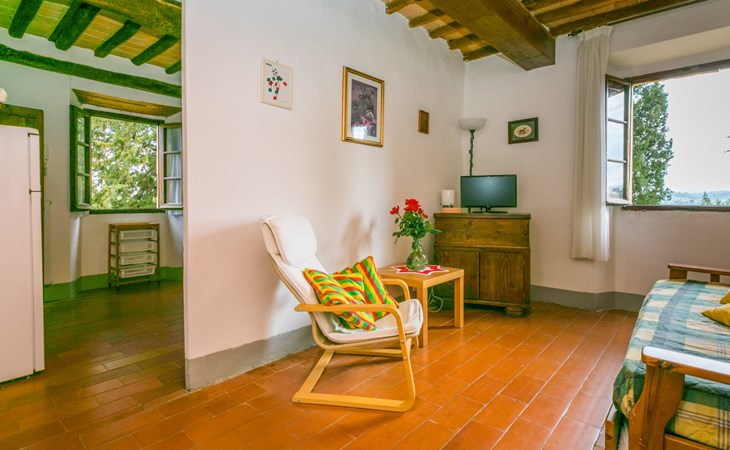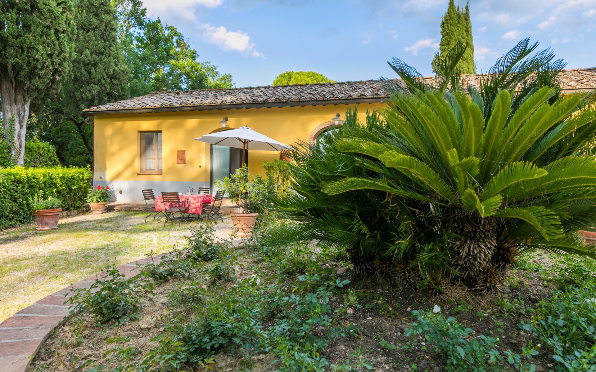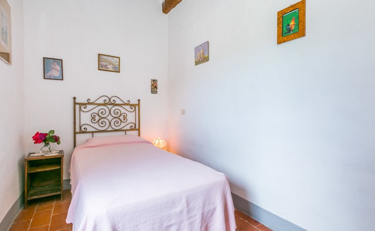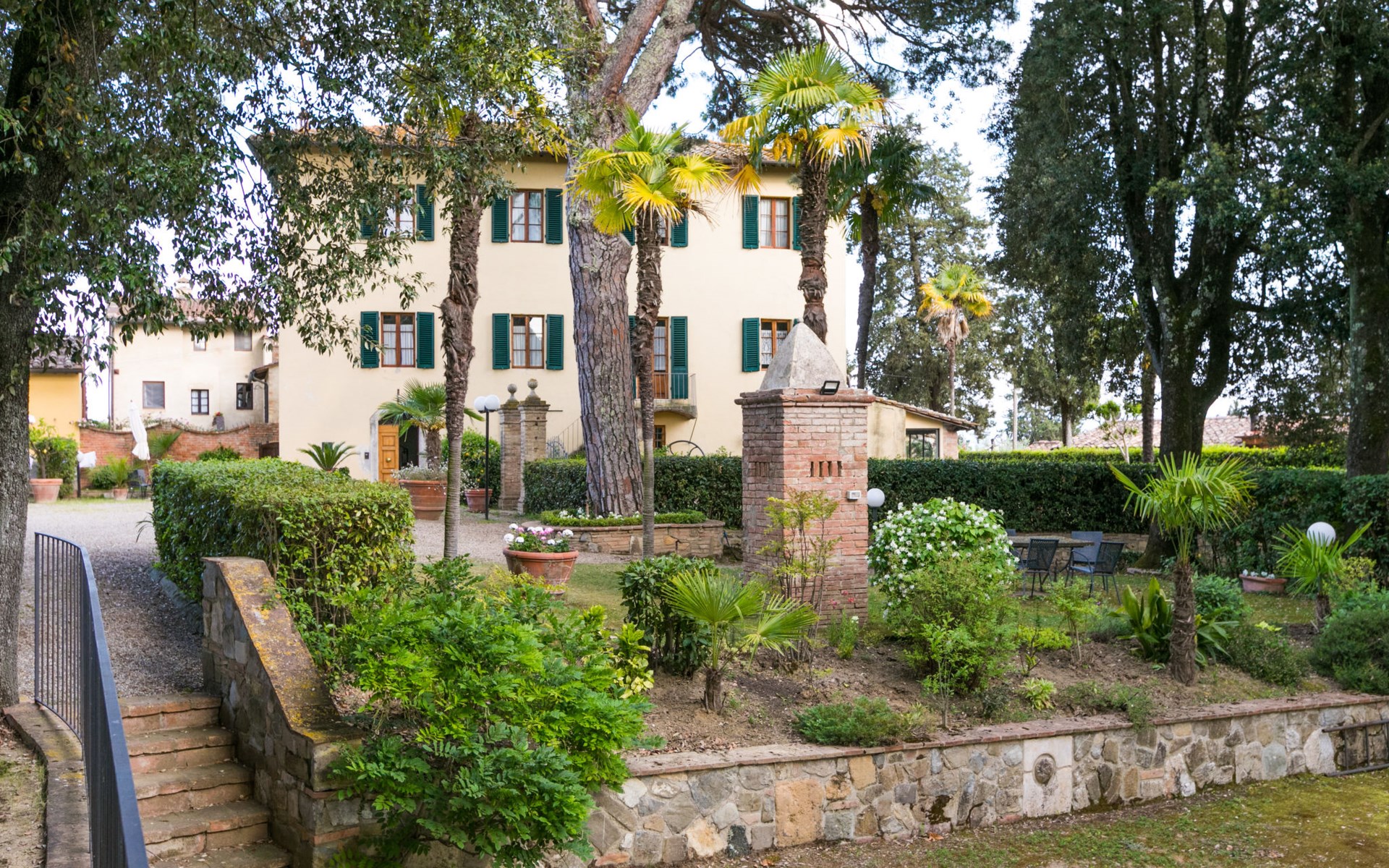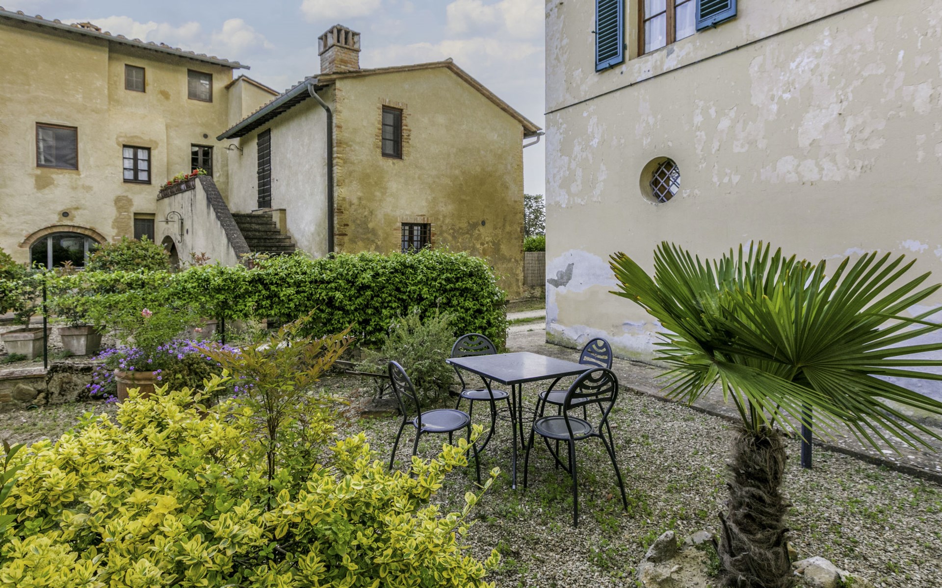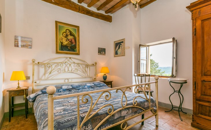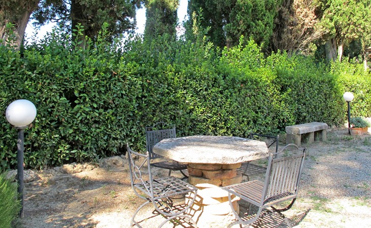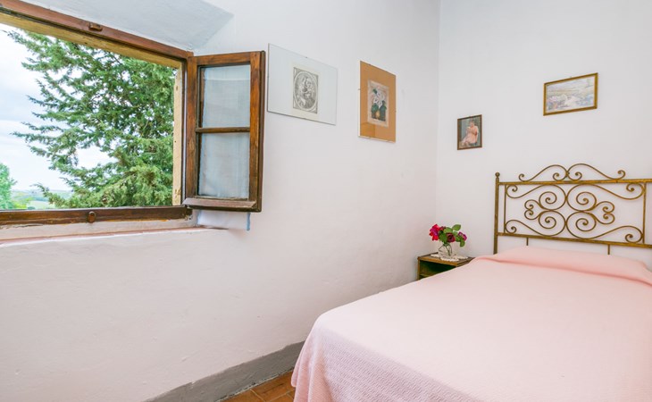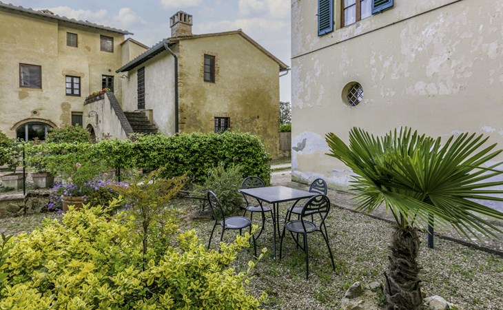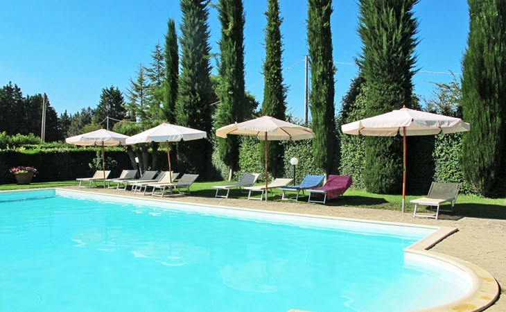 Cosy country house "Giuggiolo", surrounded by trees and vineyards. 3 houses in the residence. 4 apartments in the residence. In the hamlet Casaglia 4 km from the centre of Poggibonsi, 11 km from the centre of San Gimignano, 30 km from the centre of Siena, in a sunny position, in the countryside. For shared use: large, beautiful garden 5'000 m2 (fenced) with plants and trees, meadow, swimming pool (14 x 7 m, depth 120 - 160 cm, seasonal availability: 02.May. - 03.Oct.). Terrace, pool maintenance by the owner/gardener. Heating to be paid on the spot (01.Nov. - 31.Mar.). 800 m long motor access to the grounds (via unmade road). Parking on the premises. Supermarket 2 km, railway station "Poggibonsi" 4 km. Please note: residence with electric gates. The owner lives in the same residence. Wine tasting in a wine cellar near San Gimignano 17 km away 1x per stay included (on request).