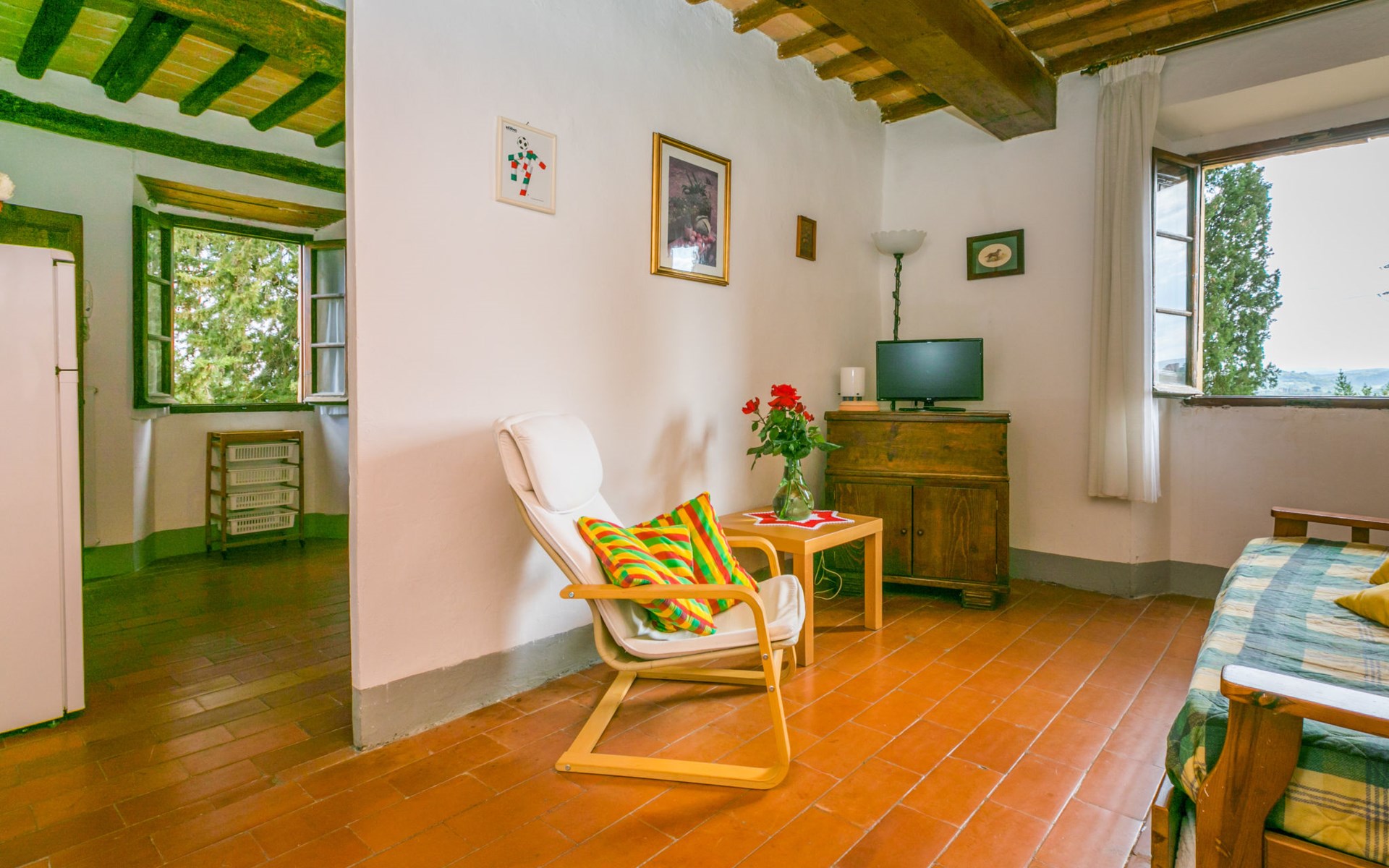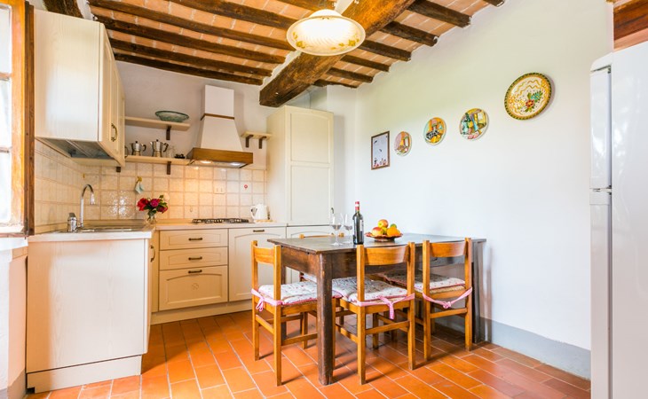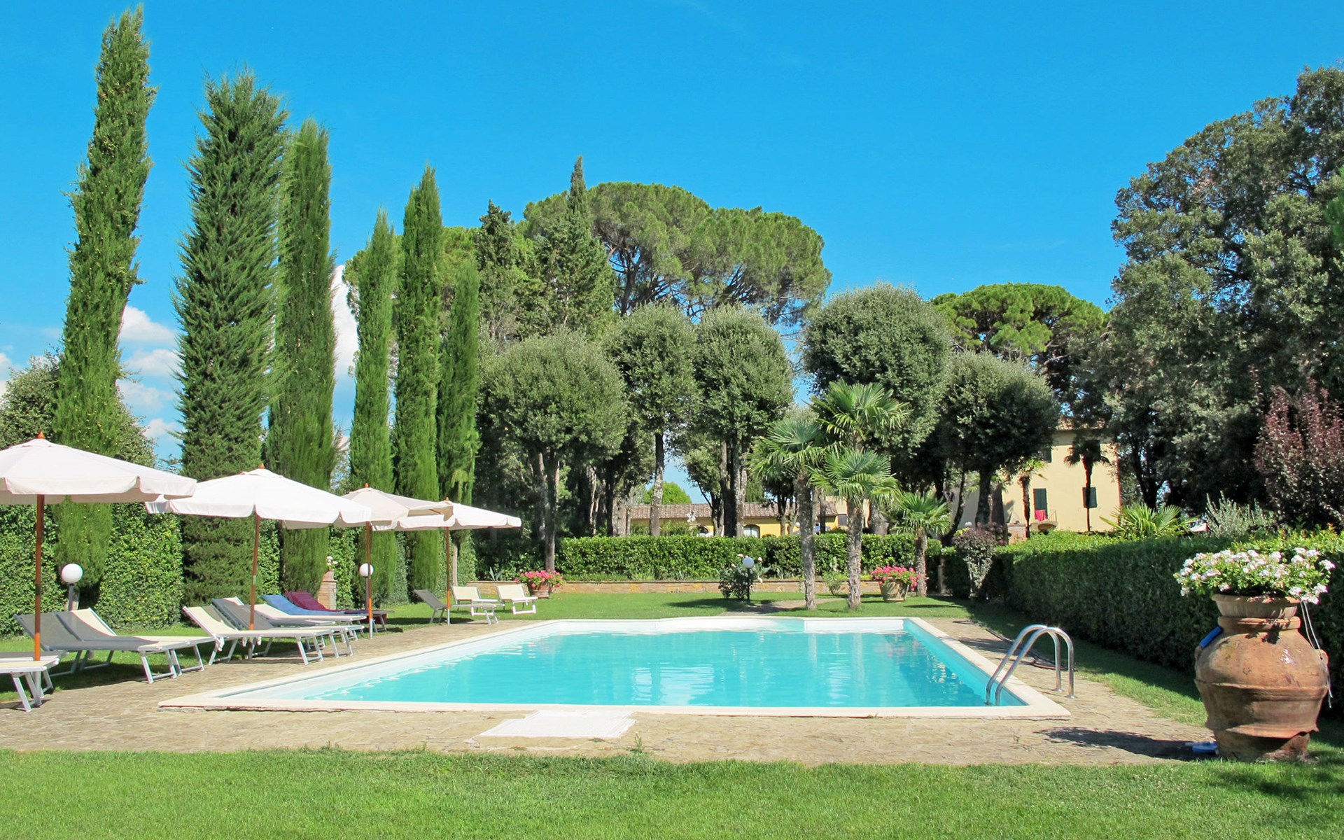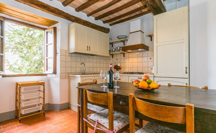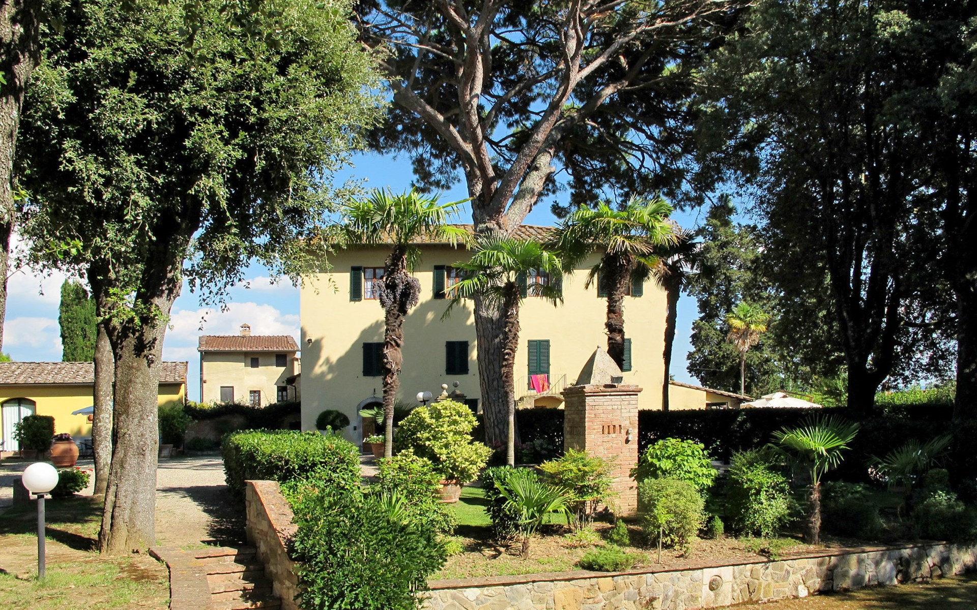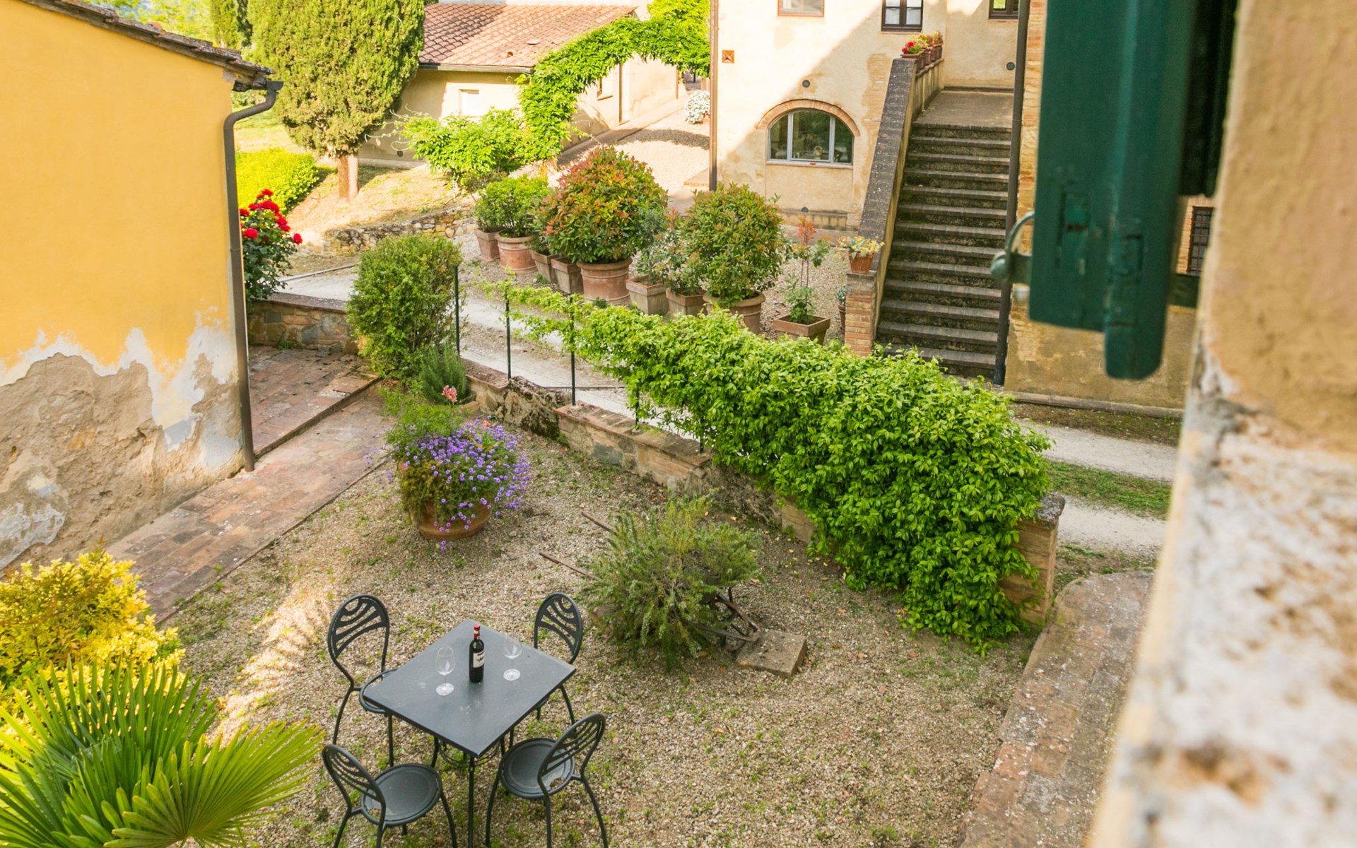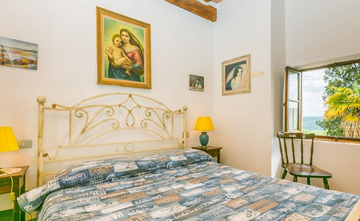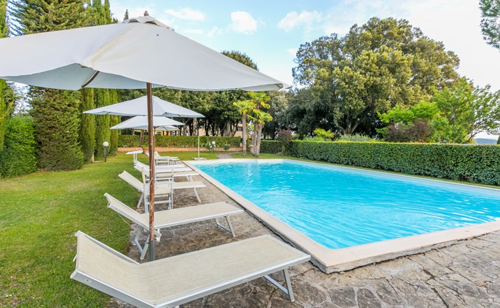 Cosy country house "Giuggiolo", surrounded by trees and vineyards. 3 houses in the residence. 4 apartments in the residence. In the hamlet Casaglia 4 km from the centre of Poggibonsi, 11 km from the centre of San Gimignano, 30 km from the centre of Siena, in a sunny position, in the countryside. For shared use: large, beautiful garden 5'000 m2 (fenced) with plants and trees, meadow, swimming pool (14 x 7 m, depth 120 - 160 cm, seasonal availability: 02.May. - 03.Oct.). Terrace, pool maintenance by the owner/gardener. Heating to be paid on the spot (01.Nov. - 31.Mar.). 800 m long motor access to the grounds (via unmade road). Parking on the premises. Supermarket 2 km, railway station "Poggibonsi" 4 km. Please note: residence with electric gates. The owner lives in the same residence. Wine tasting in a wine cellar near San Gimignano 17 km away 1x per stay included (on request).