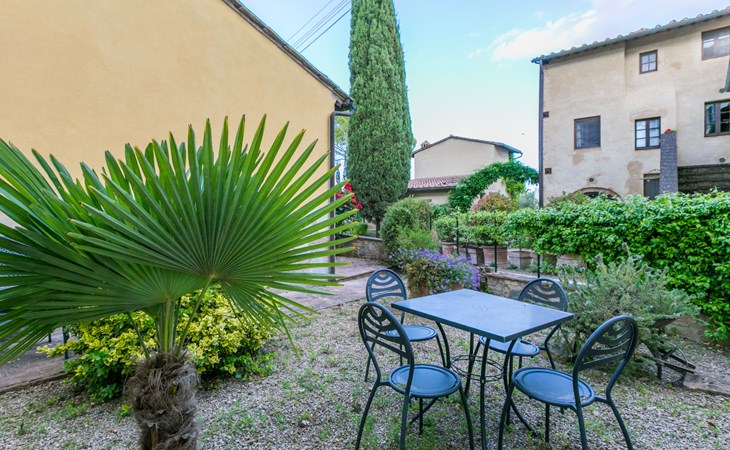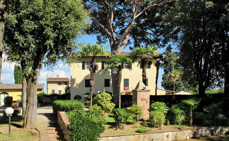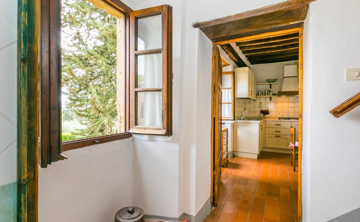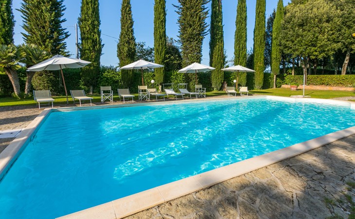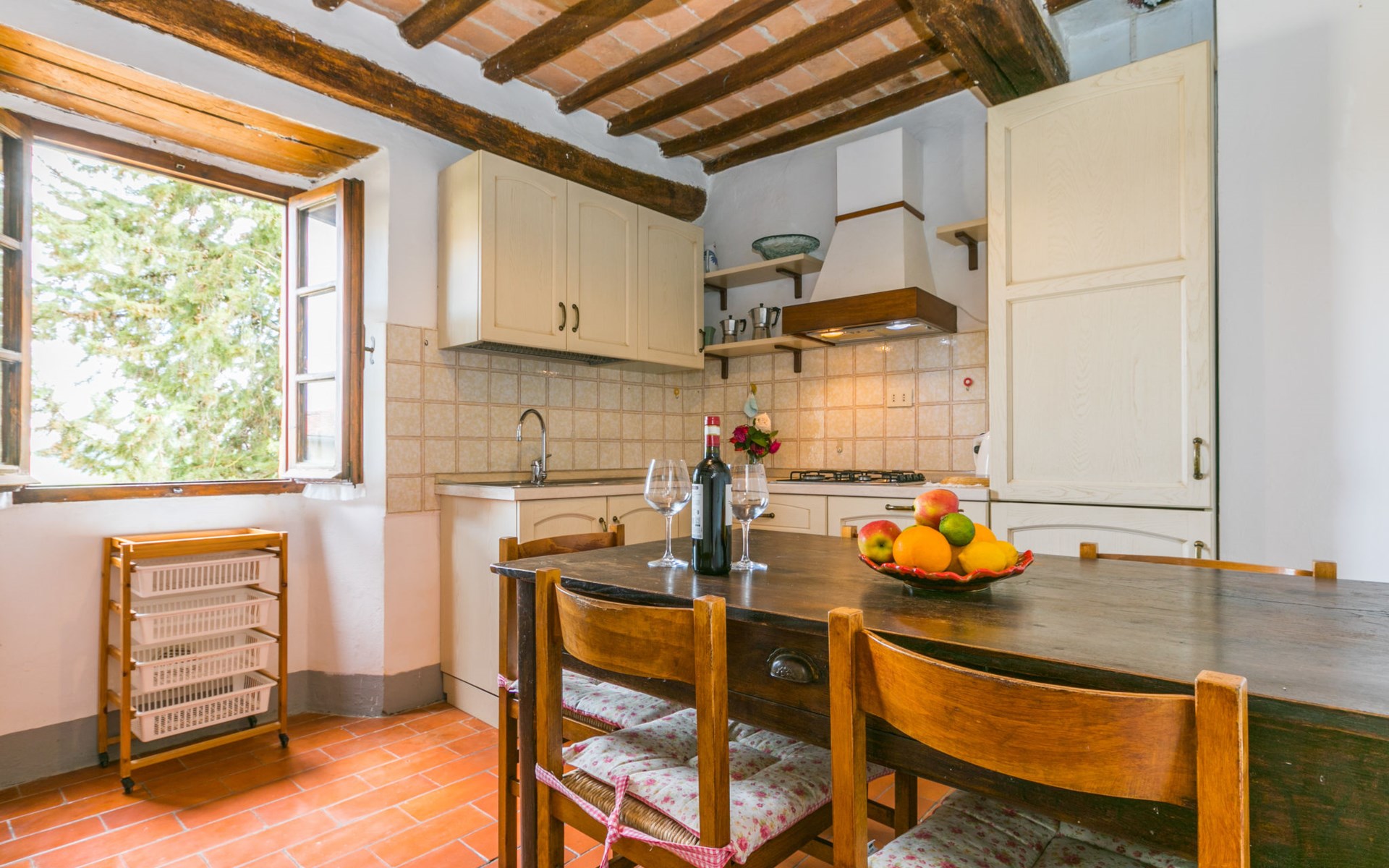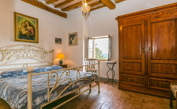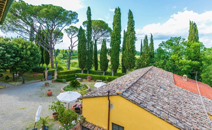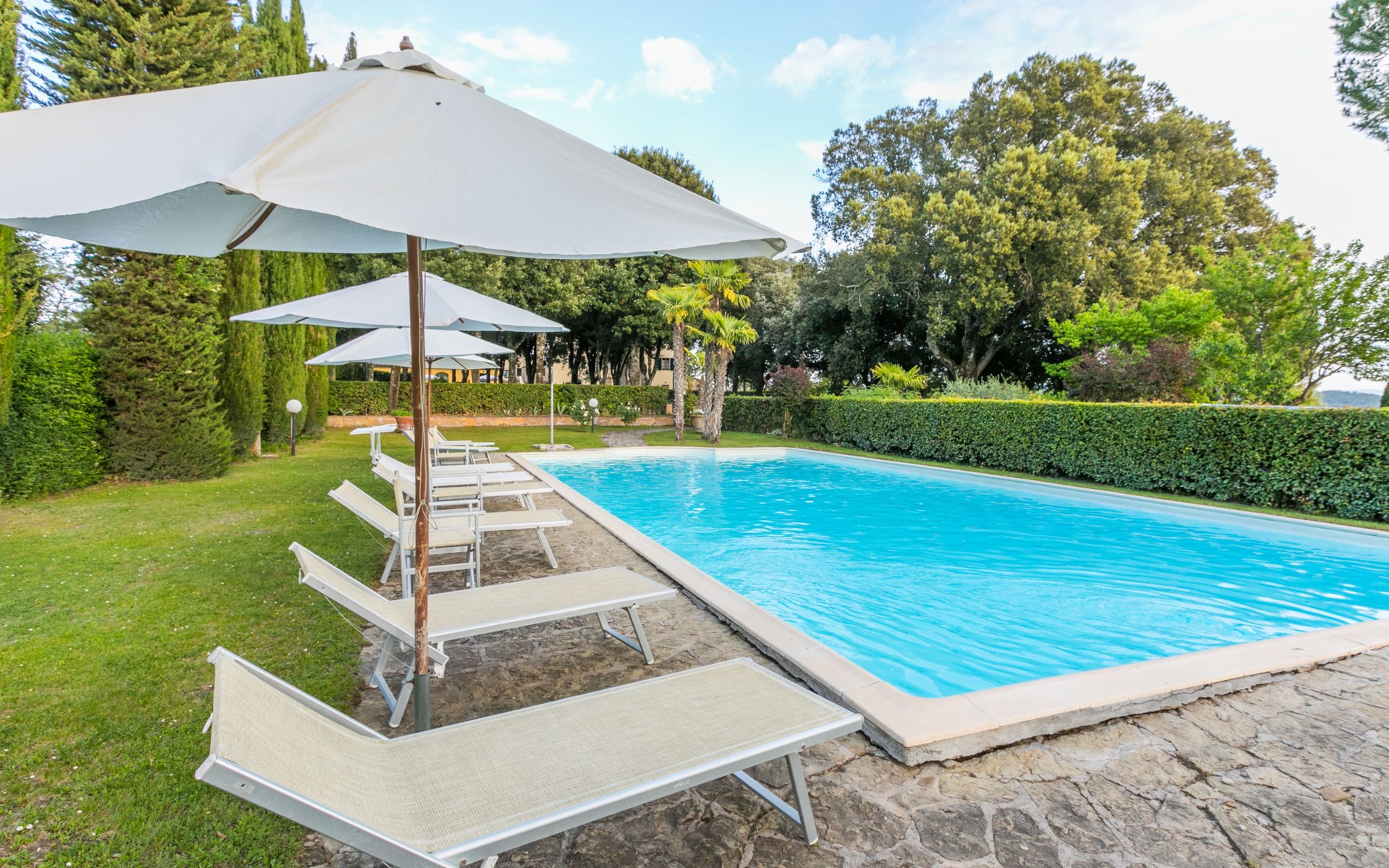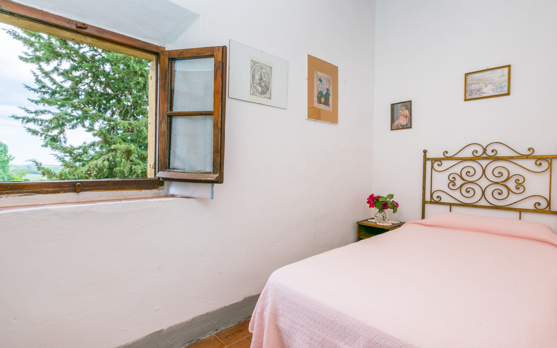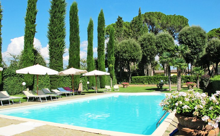 Cosy country house "Giuggiolo", surrounded by trees and vineyards. 3 houses in the residence. 4 apartments in the residence. In the hamlet Casaglia 4 km from the centre of Poggibonsi, 11 km from the centre of San Gimignano, 30 km from the centre of Siena, in a sunny position, in the countryside. For shared use: large, beautiful garden 5'000 m2 (fenced) with plants and trees, meadow, swimming pool (14 x 7 m, depth 120 - 160 cm, seasonal availability: 02.May. - 03.Oct.). Terrace, pool maintenance by the owner/gardener. Heating to be paid on the spot (01.Nov. - 31.Mar.). 800 m long motor access to the grounds (via unmade road). Parking on the premises. Supermarket 2 km, railway station "Poggibonsi" 4 km. Please note: residence with electric gates. The owner lives in the same residence. Wine tasting in a wine cellar near San Gimignano 17 km away 1x per stay included (on request).