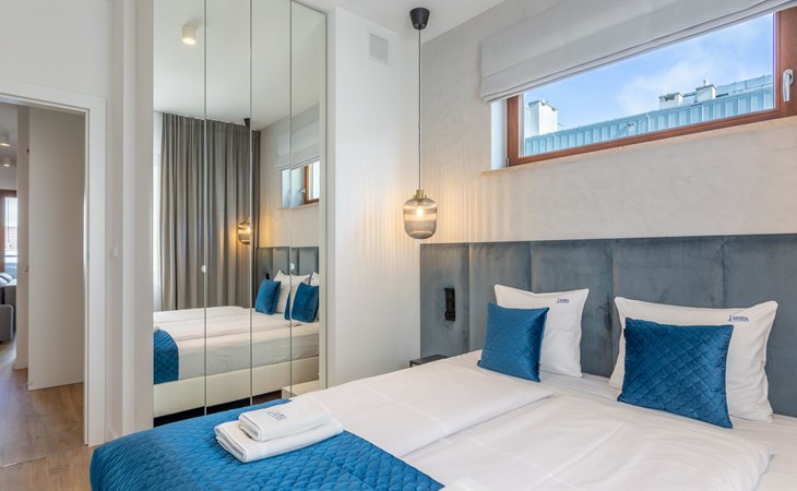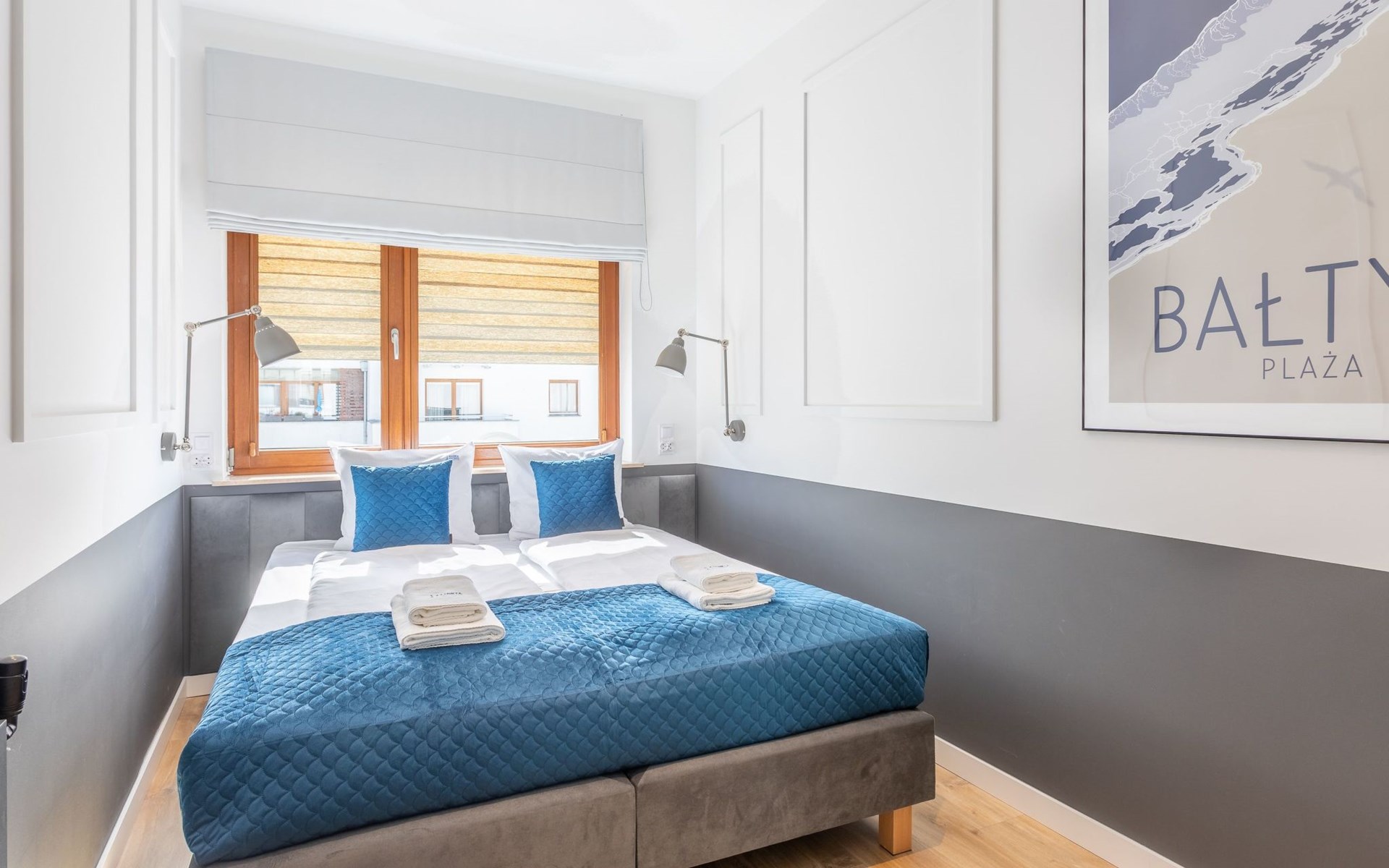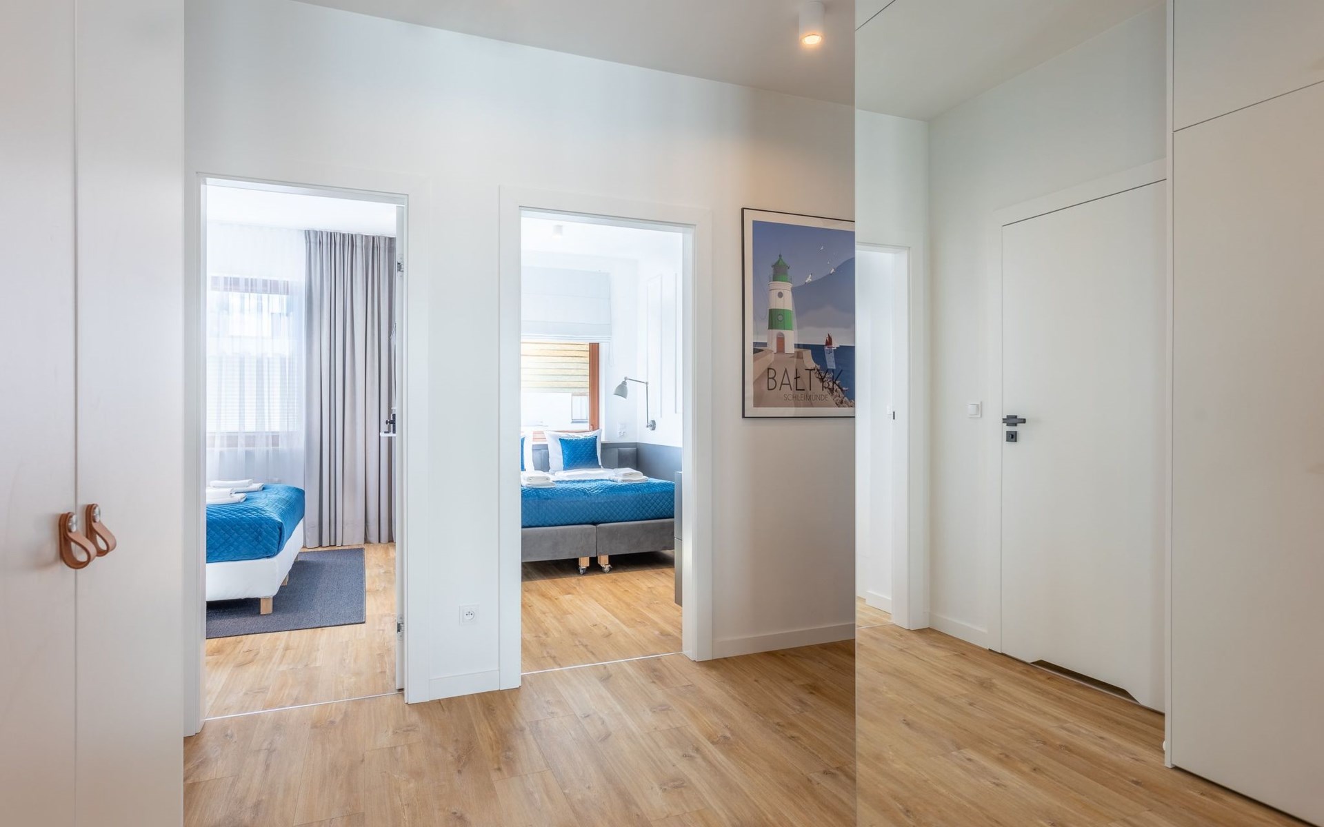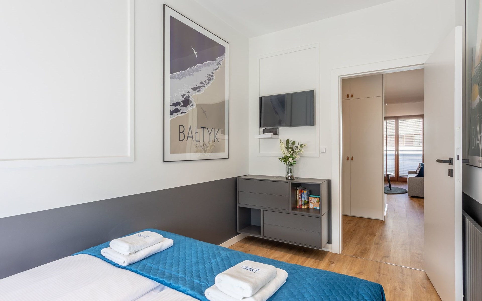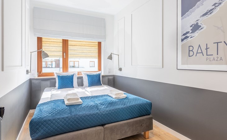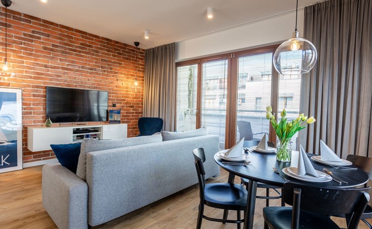 It is an extremely elegant and fully equipped flat with two bedrooms, a living room with a kitchenette and a bathroom with a total area of 56 m2. It is a modern interior with character, designed for the comfort of the residents, where functionality and originality play a significant role, as simplicity is broken by sophisticated accessories and intense but natural colours. As a result, the interior pulsates with energy, encourages coastal activities and prolongs anchoring in Świnoujście.