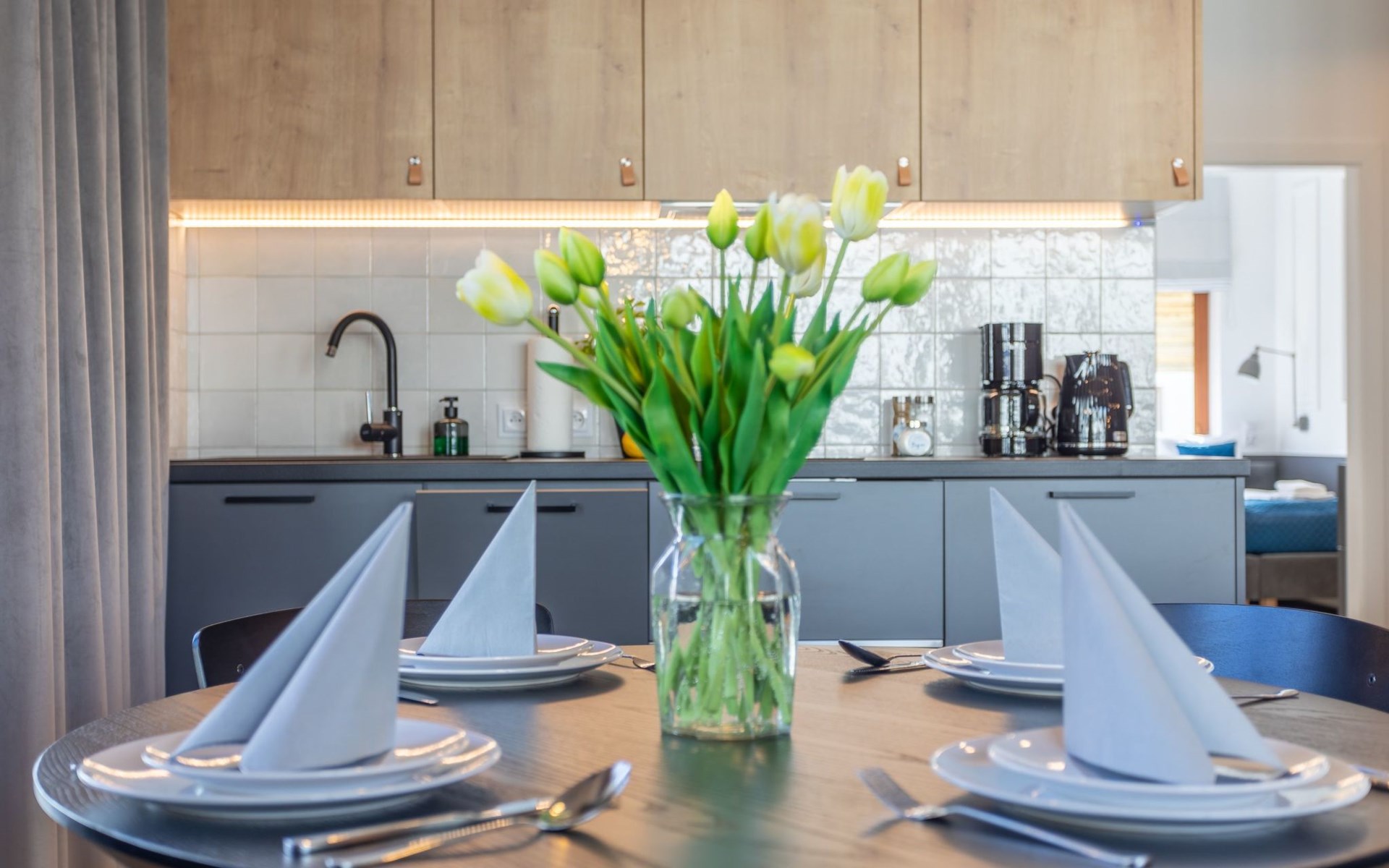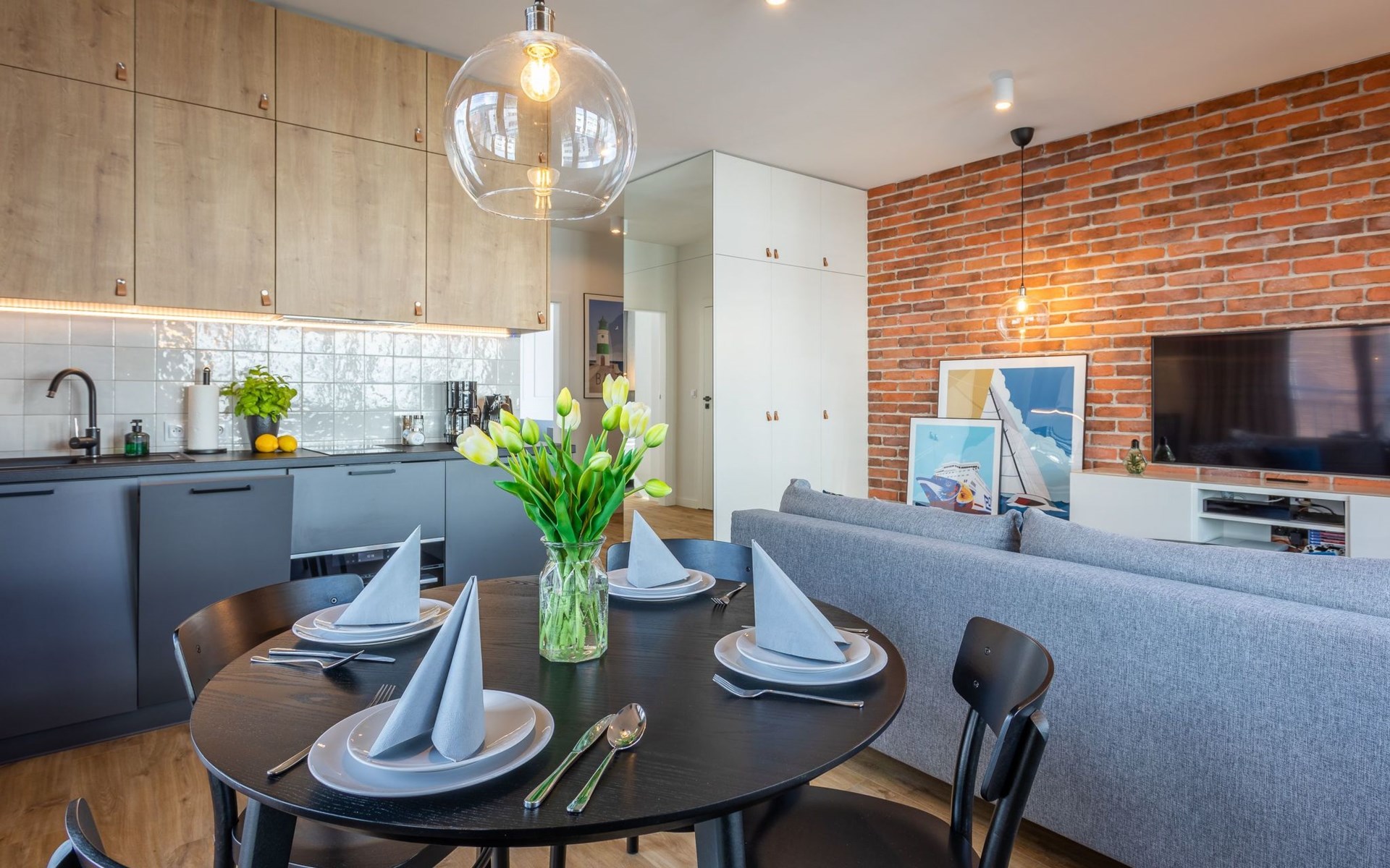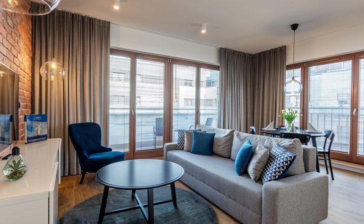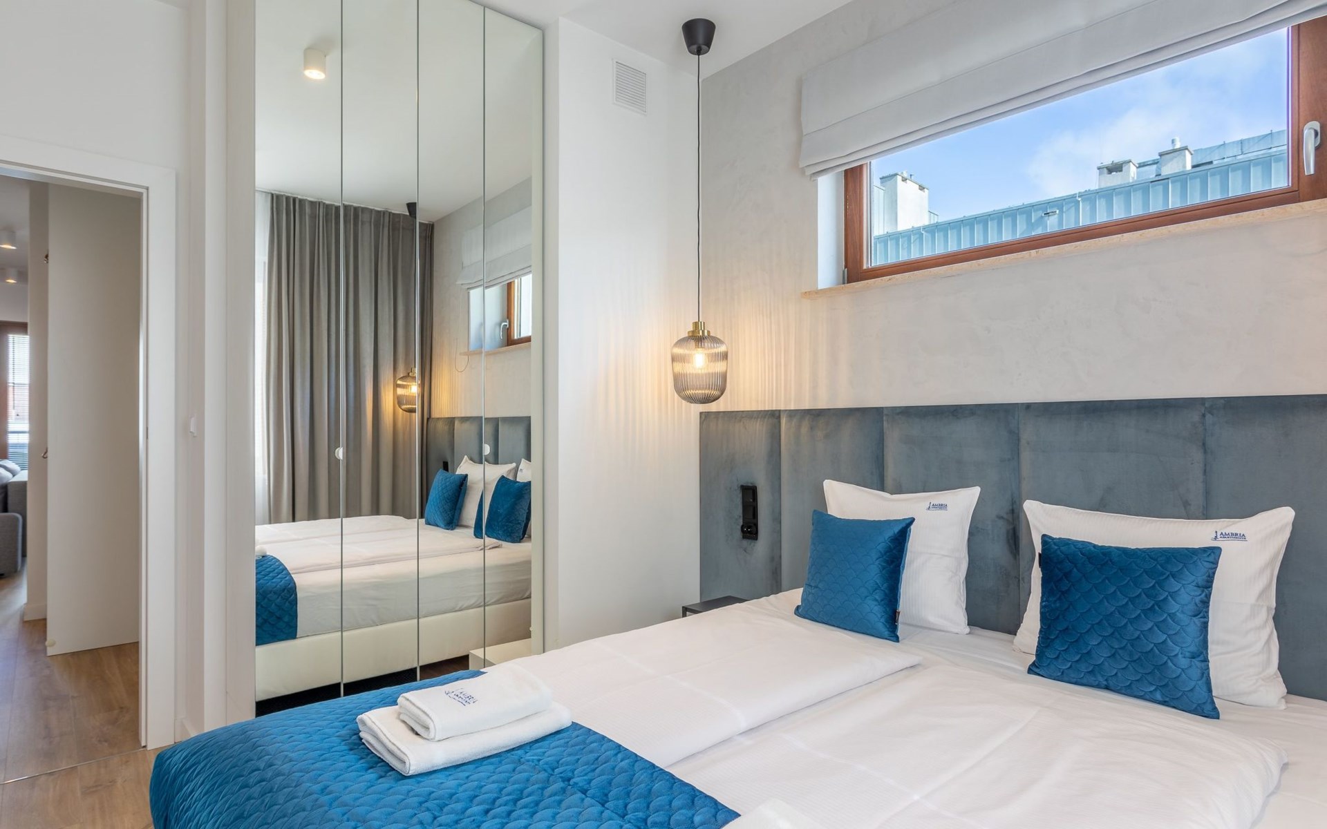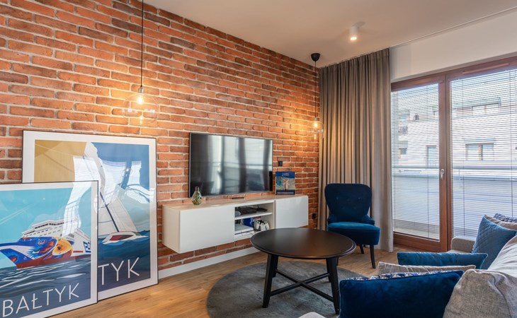It is an extremely elegant and fully equipped flat with two bedrooms, a living room with a kitchenette and a bathroom with a total area of 56 m2. It is a modern interior with character, designed for the comfort of the residents, where functionality and originality play a significant role, as simplicity is broken by sophisticated accessories and intense but natural colours. As a result, the interior pulsates with energy, encourages coastal activities and prolongs anchoring in Świnoujście.