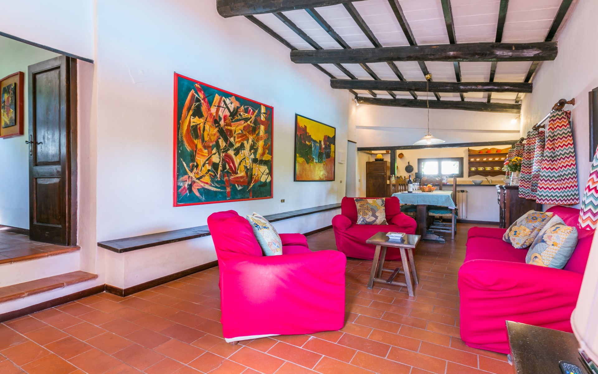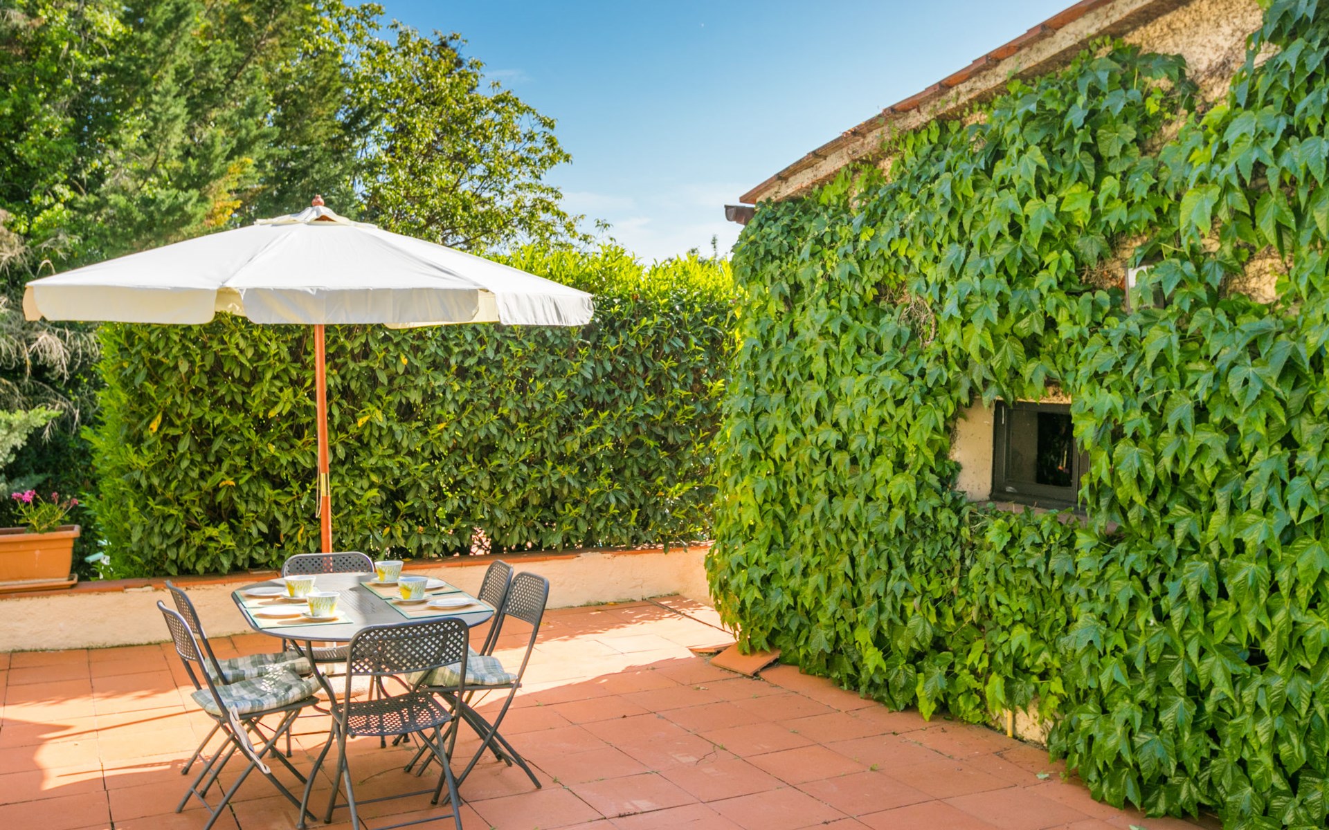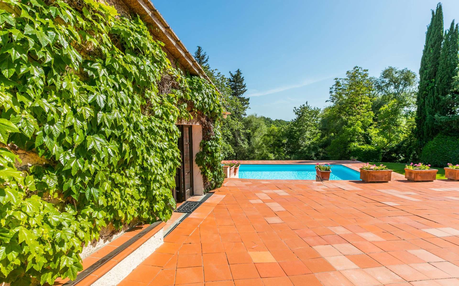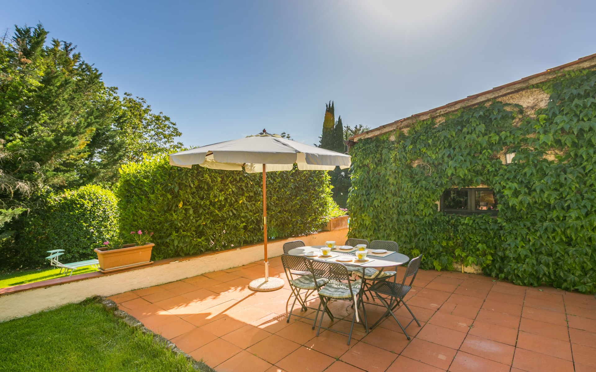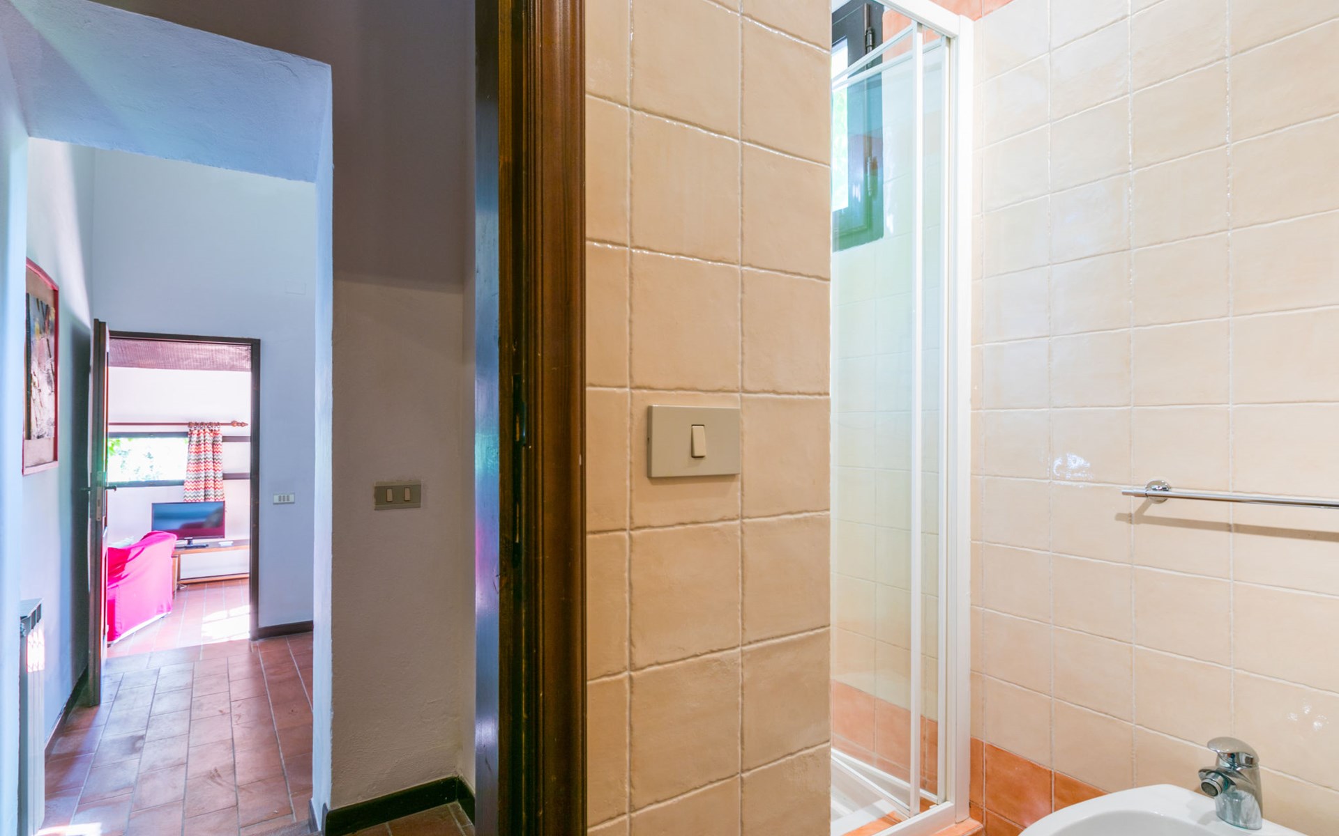 Agriturismo "Bardeggiano", 2 storeys, surrounded by trees and fields. 5 houses in the residence. 9 apartments in the residence. 4 km from the centre of Colle di Val d'Elsa, 8.5 km from the centre of Monteriggioni, 26 km from the centre of Siena, in a central, secluded position, 70 km from the sea, in the countryside. For shared use: well-kept garden 12 ha (fenced) with plants and trees, swimming pool (15 x 6 m, depth 150 cm, seasonal availability: 13.May. - 04.Nov.). Outdoor shower, terrace, barbecue, pool maintenance by the owner/gardener. In the complex: WiFi, washing machine (for shared use, extra). Linen change (suppl. charge extra). Towel change (suppl. charge extra). Roofed, parking on the premises. Grocery 1 km, supermarket 4 km, restaurant 4 km, bakery 1 km, bus stop 2 km, railway station "Colle di Val d'Elsa" 4 km, sandy beach "Follonica" 88 km. Nearby attractions: San Gimignano 20 km, Firenze 52 km, Volterra 55 km. Please note: baby equipment (included). Residence with electric gates. The owner lives on the same property. All houses/apartments are individually designed/furnished.