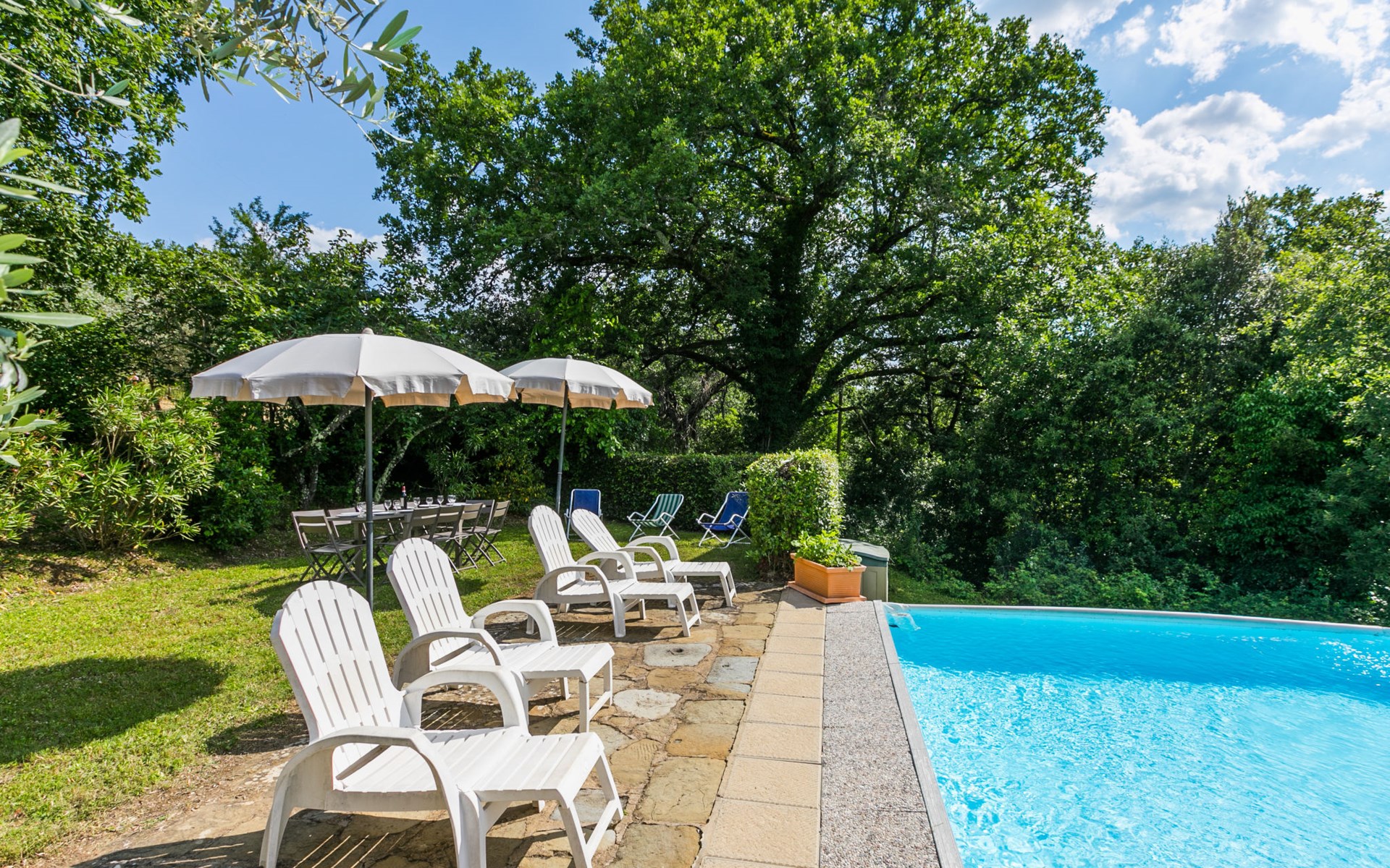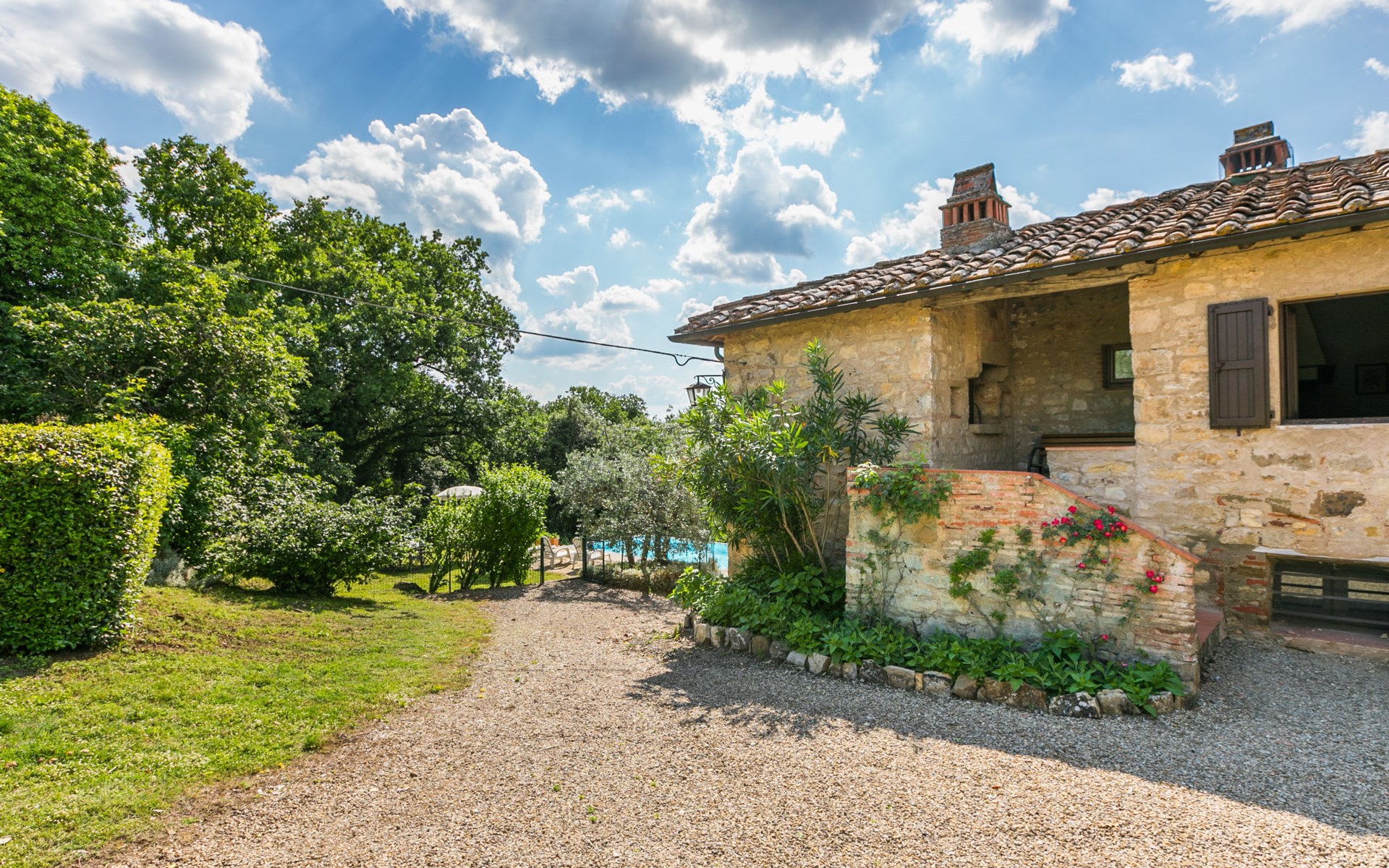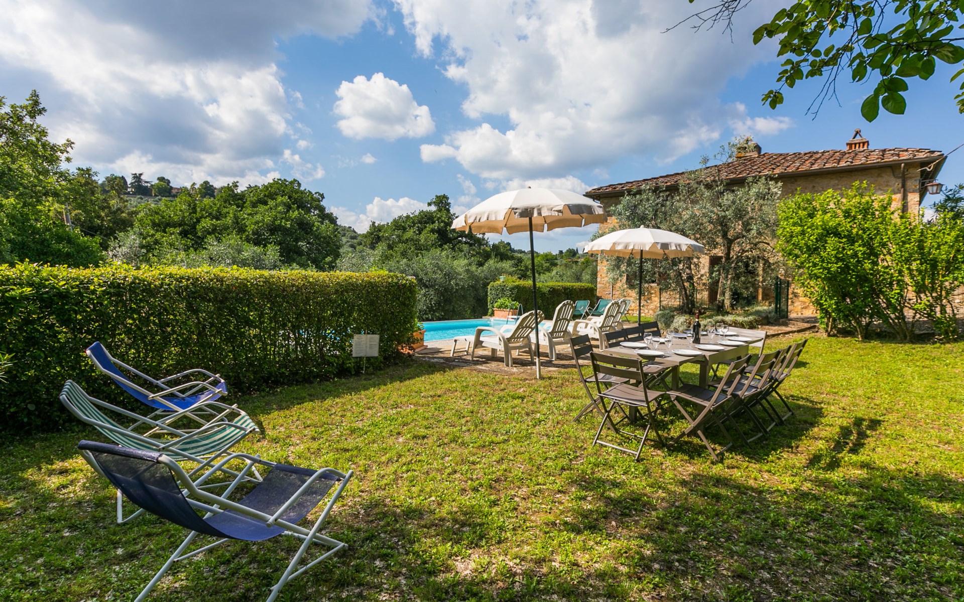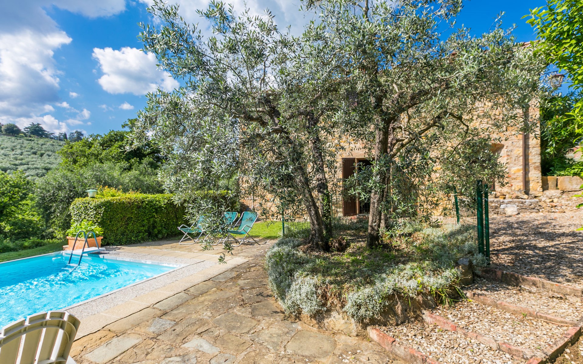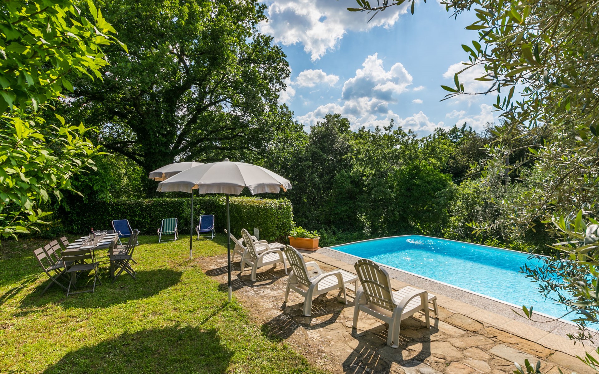 "rustico" cottage "Il Laghetto". 4 km from the centre of Pergine Valdarno, 25 km from the centre of Arezzo, 35 km from the centre of Siena, in a quiet position. Private: property, trees, natural garden, meadow, swimming pool (above ground) (8 x 4 m, seasonal availability: 15.May. - 01.Oct.). Table tennis. Motor access (2.9 km via unmade road). Parking on the premises. Shop 4 km, supermarket 5 km, railway station "Laterina" 3 km. Nearby attractions: Castello di Montozzi reception 1.8 km. Local sale of farm products.
