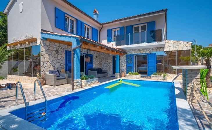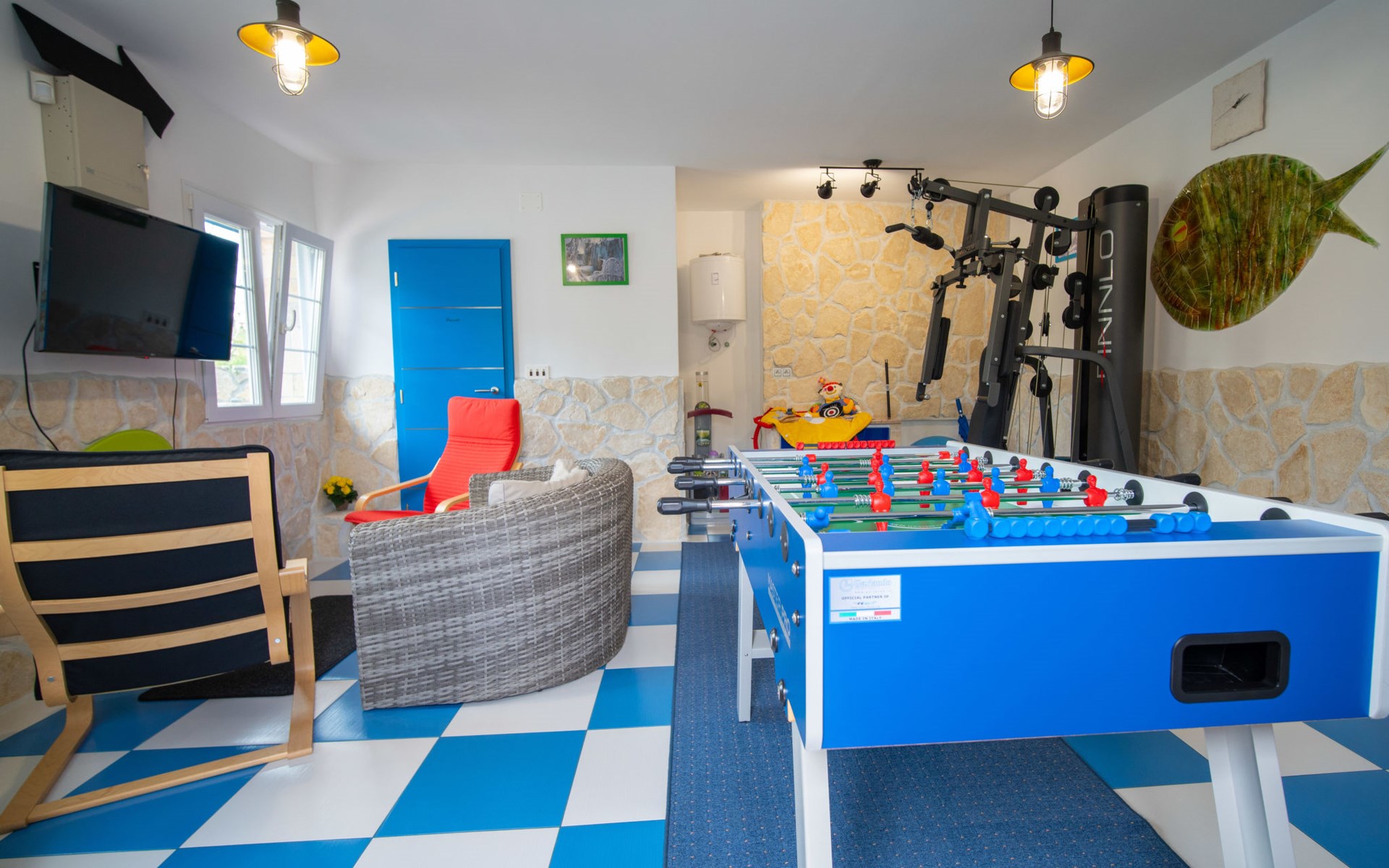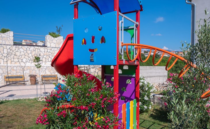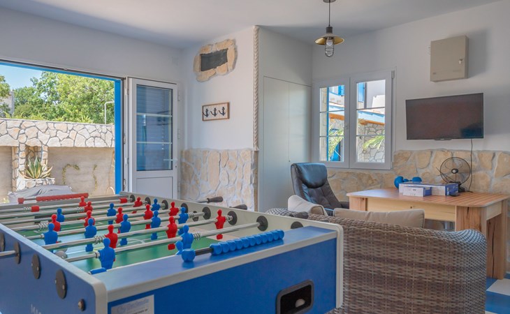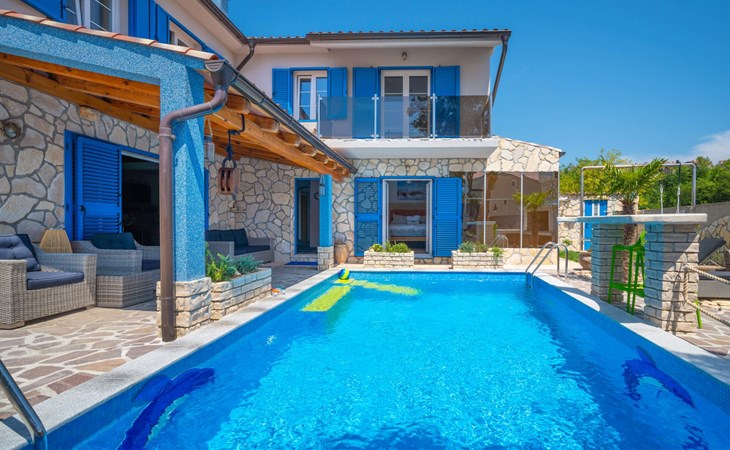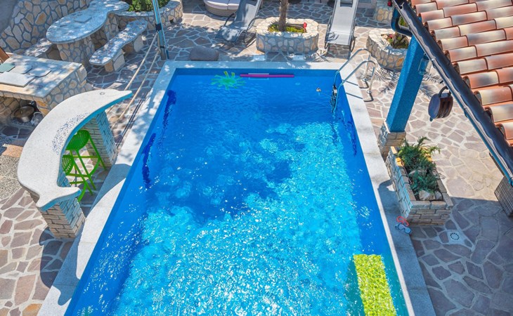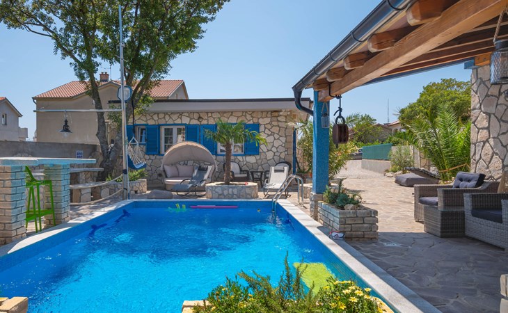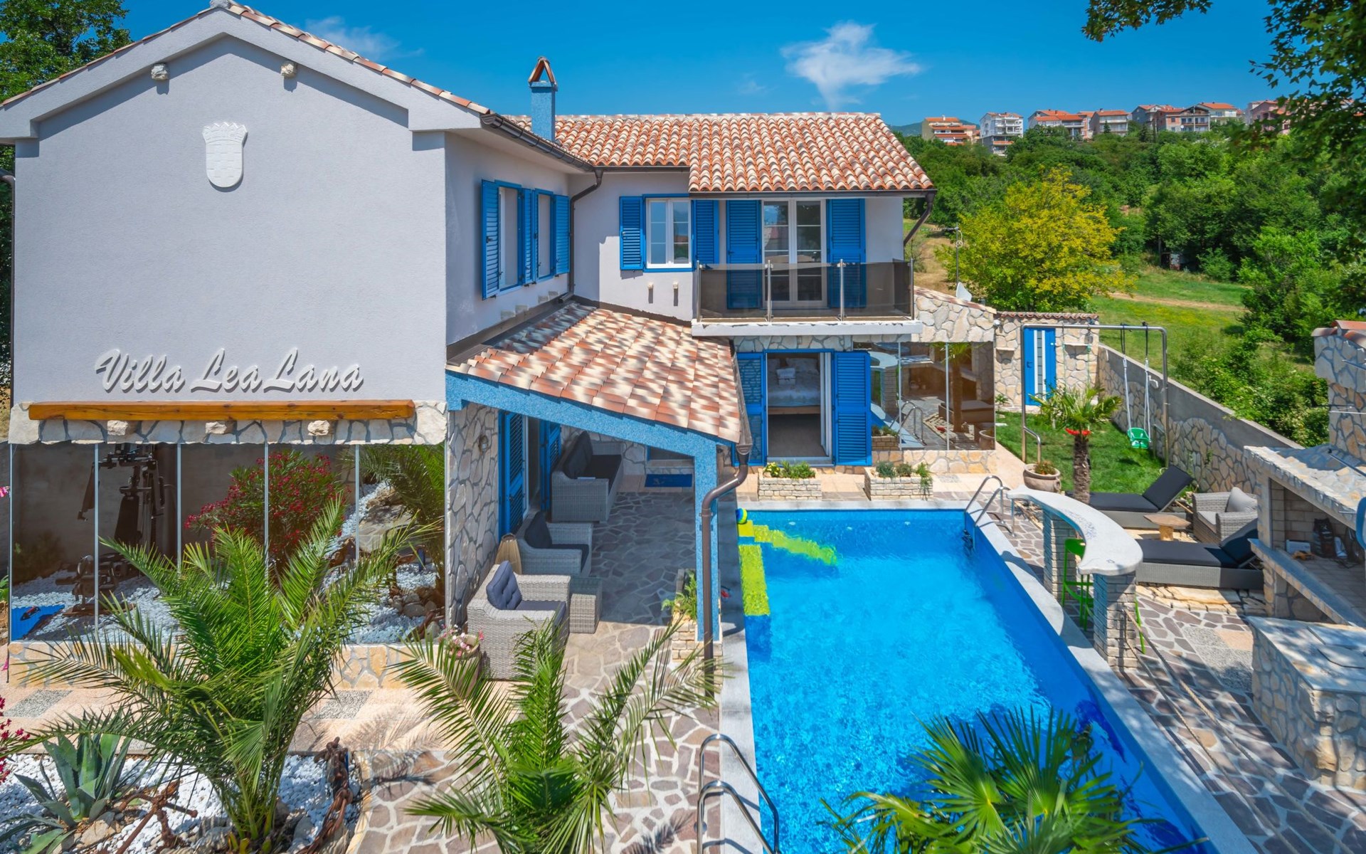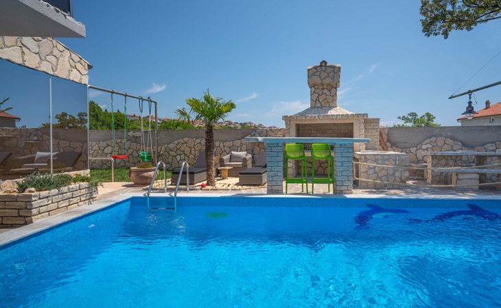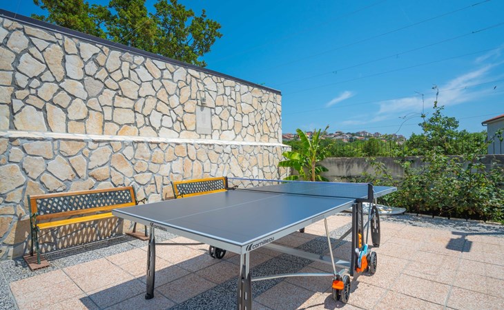Villa "Lea Lana", 2 storeys. 500 m from the centre of Novi Vinodolski, in a quiet, sunny position, 700 m from the sea, 900 m from the beach. Private: property 1'000 m2 (fenced) with wildlife garden, swimming pool angular (7 x 4 m, depth 150 cm, seasonal availability: 01.May. - 15.Oct.) with internal staircase. WC in the pool area, outdoor shower, hot tub, pool house, table tennis, terrace (50 m2), garden furniture, barbecue, children's playground (slide, swing). In the house: internet access, table football, burglar alarm system, washing machine. Parking (for 3 cars) at the house on the premises. Shop, supermarket, restaurant 500 m, bus stop 1.4 km, pebble beach, public bathing area, concrete beach 900 m. Please note: suitable for families. Groups of teenagers on request only. By groups of young people double deposit is requested on arrival. Organizing a party is not allowed. Pool house arranged as a playroom (table football, darts, play station). Available: multifunctional exercise machine. Welcome drink and snack upon arrival.