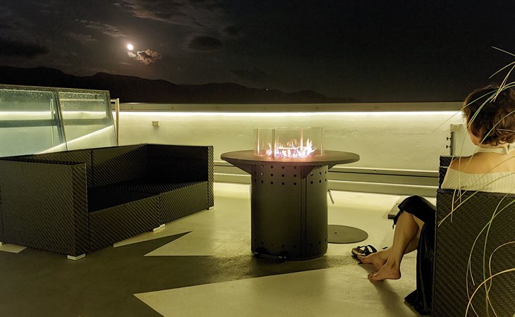On the second floor are two bedrooms, a full bathroom and a walk-in wardrobe. The master bedroom has a king-size bed, a chaise longue and complementary accessories, while the second bedroom offers a comfortable double bed. The bathroom is equipped with modern amenities and fine finishes, offering guests comfort and convenience. A motorised skylight provides access to the roof terrace, which features a lounge area with propane brazier, parasol and 360-degree panoramic views of the region.