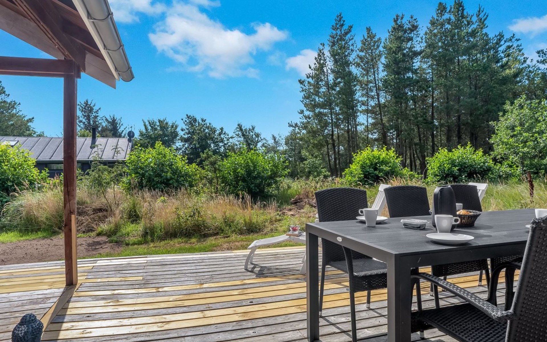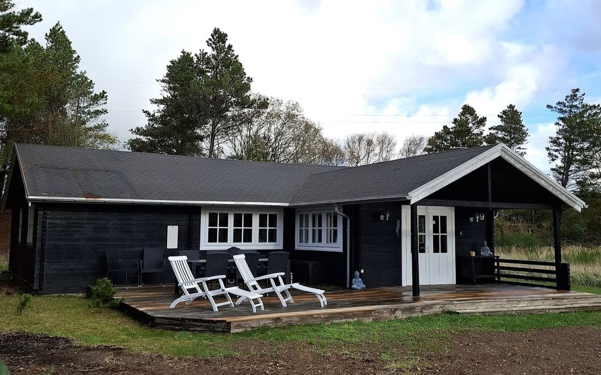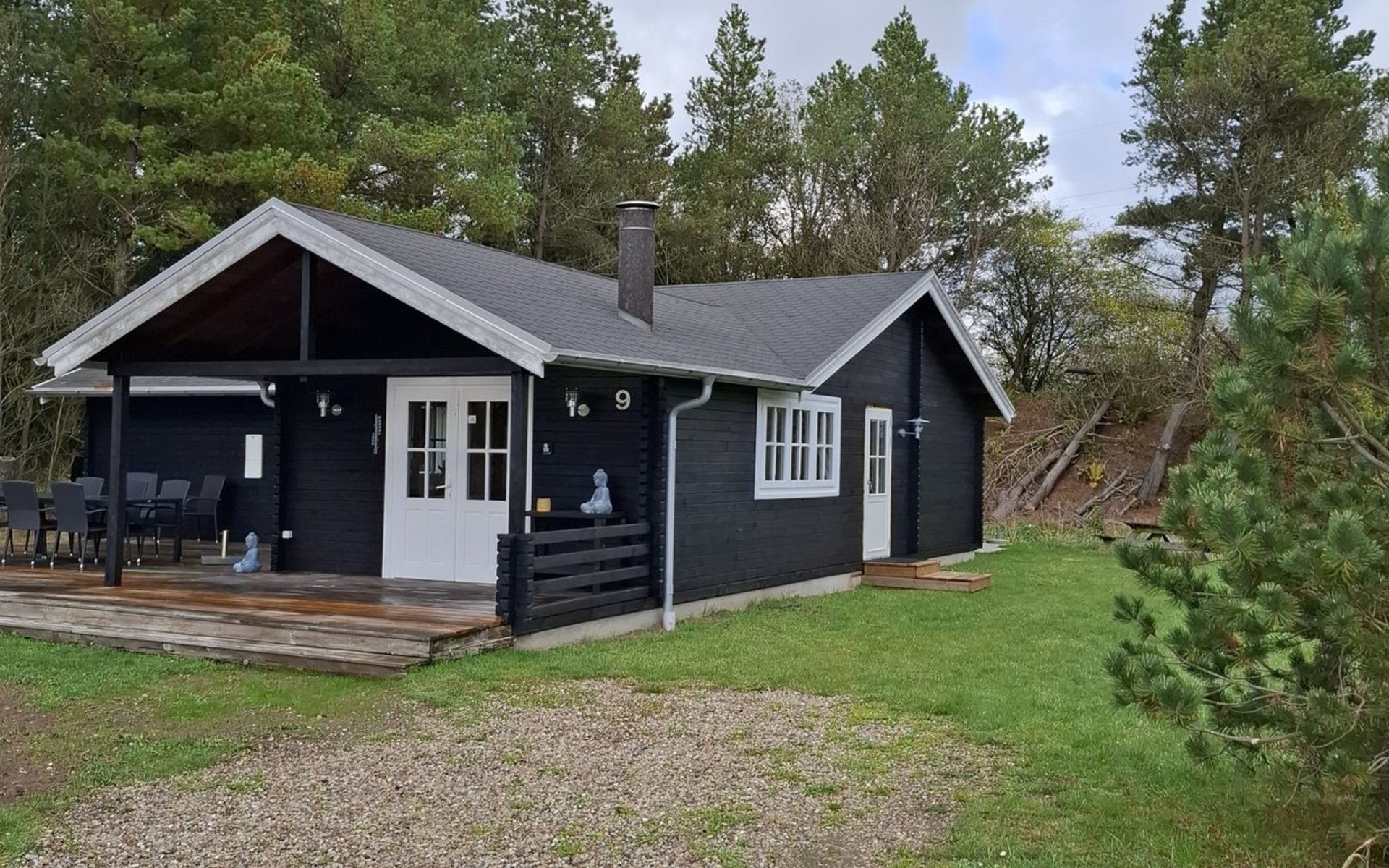 Single-family house, built in 2005. 8 km from the sea. Private: natural state property 1'203 m2. Outdoor shower. In the house: washing machine. Parking at the house. Grocery 9 km. Golf course 7 km. The owner does not accept any youth groups.