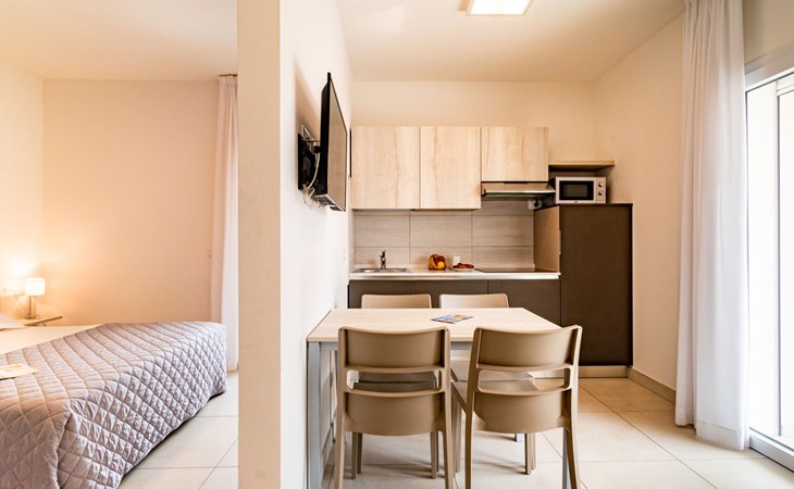 Comfortable residence "Iris Suite", 5 storeys, built in 2021. 16 apartments in the residence. In the district of Bibione Spiaggia 100 m from the centre of Bibione, 13 km from the centre of Lignano, 100 km from the centre of Venezia, 450 m from the sea, 450 m from the beach. For shared use: property (fenced), swimming pool (6 x 6 m, seasonal availability: 15.May. - 15.Sep.). In the complex: lift, sun terrace. Supermarket 230 m, bus stop 450 m, railway station "Latisana" 21 km. Nearby attractions: Oasi Naturalistica Val Grande - Bibione. The photo is just an example. On the 4th floor solarium of approx. 120 m² with swimming pool, sun loungers and corner with armchairs for common use.