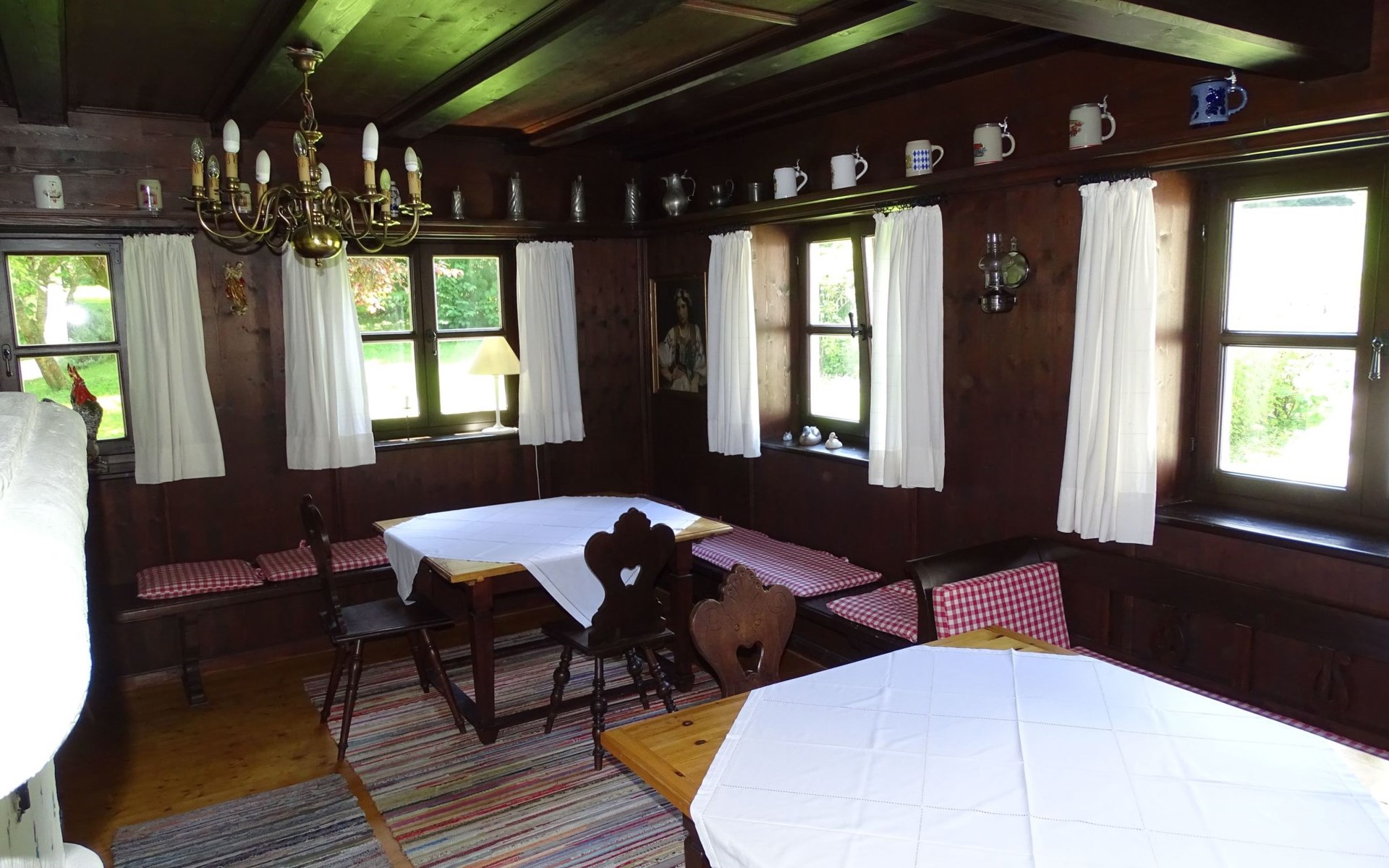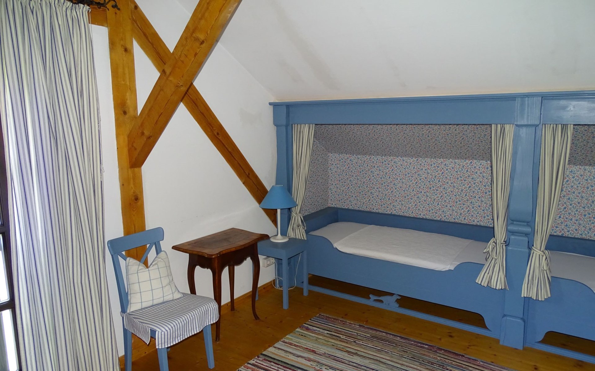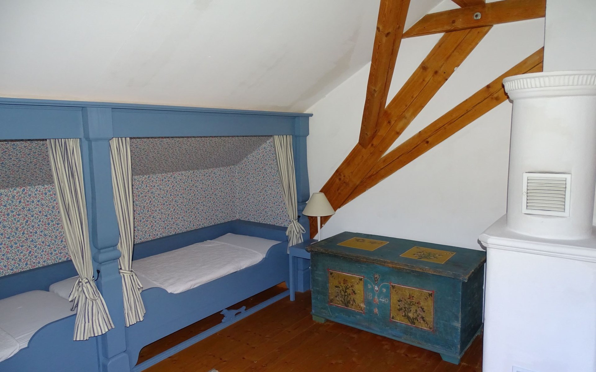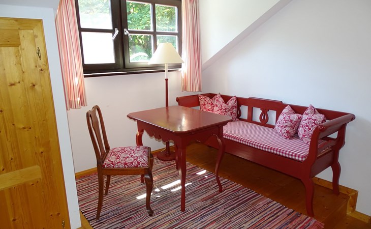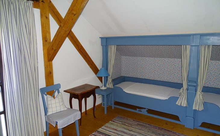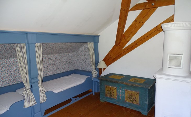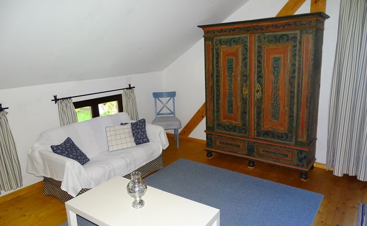 The holiday home Victoria is divided into two floors. On the ground floor is the large hallway, the guest WC and the large, rustic kitchen-cum-living room with a large tiled stove. The kitchen-living room has dark panelling, just as it used to look in Bavarian taverns. The kitchen has a kitchenette with cooker, dishwasher and fridge. The beautiful large tiled stove is heated from the hallway. The large, wide wooden staircase takes you to the upper floor. There you will find the bathroom with shower, WC and washbasin. In the first bedroom there is a living area with two sofas, writing facilities, a farmhouse wardrobe with TV and two bunk beds. In the second bedroom there is a large double bed and a seating area. All floors in the house are made of wood. There are spacious built-in wardrobes in the second bedroom and in the hallway.