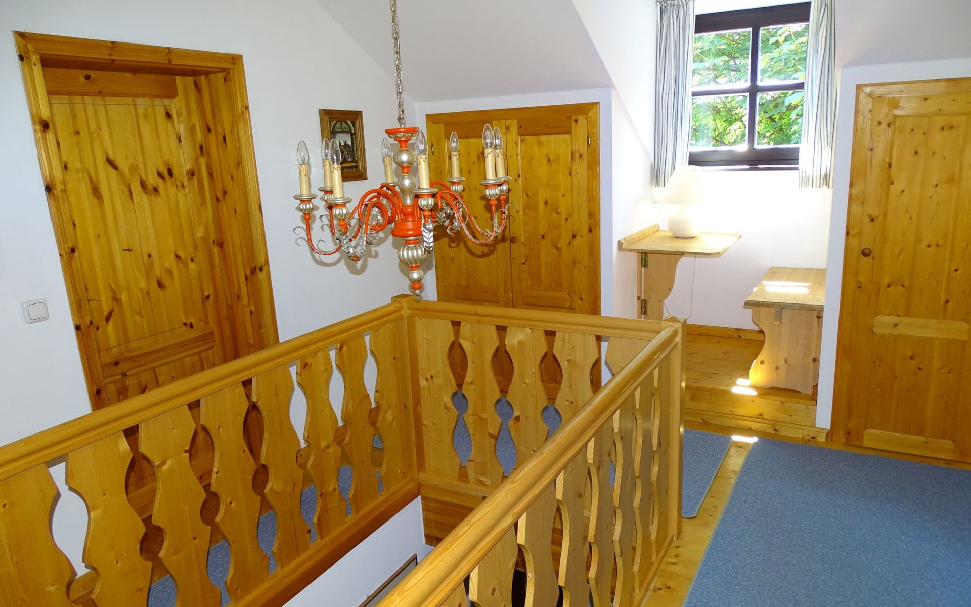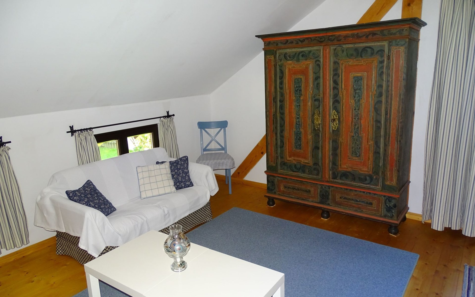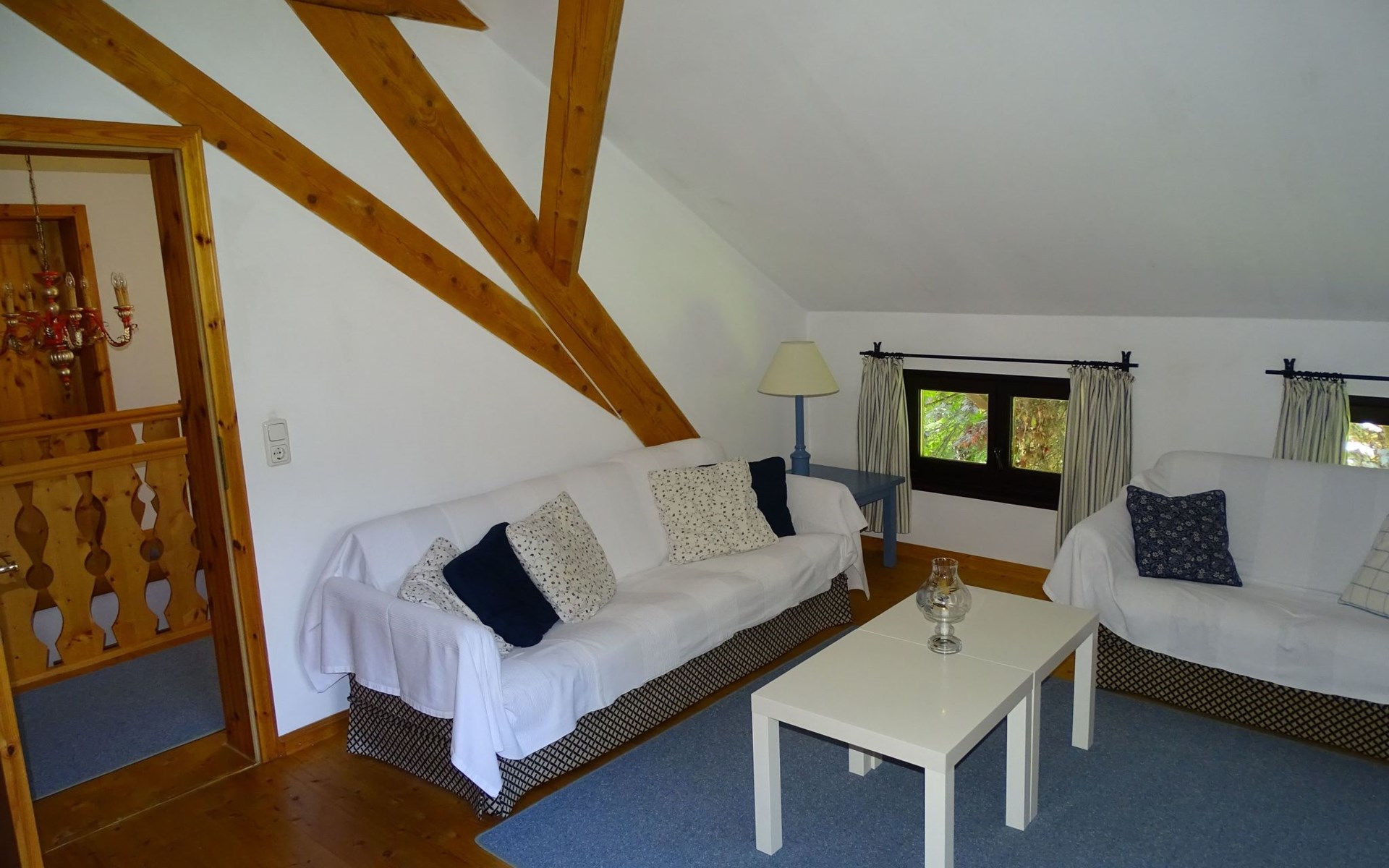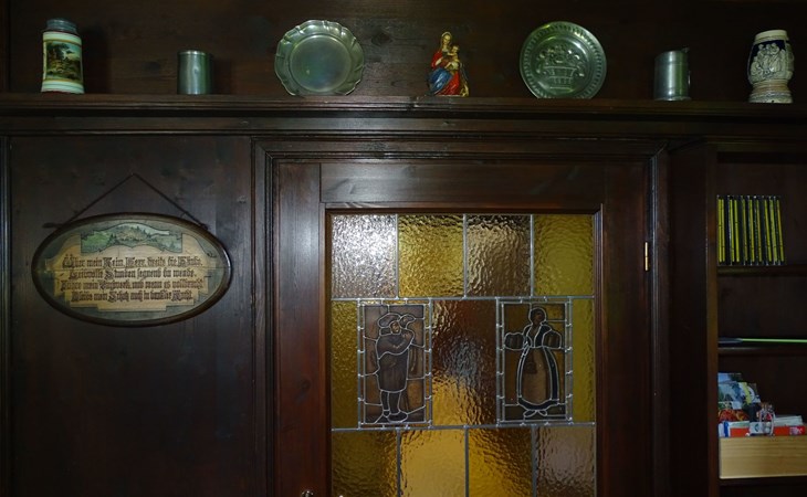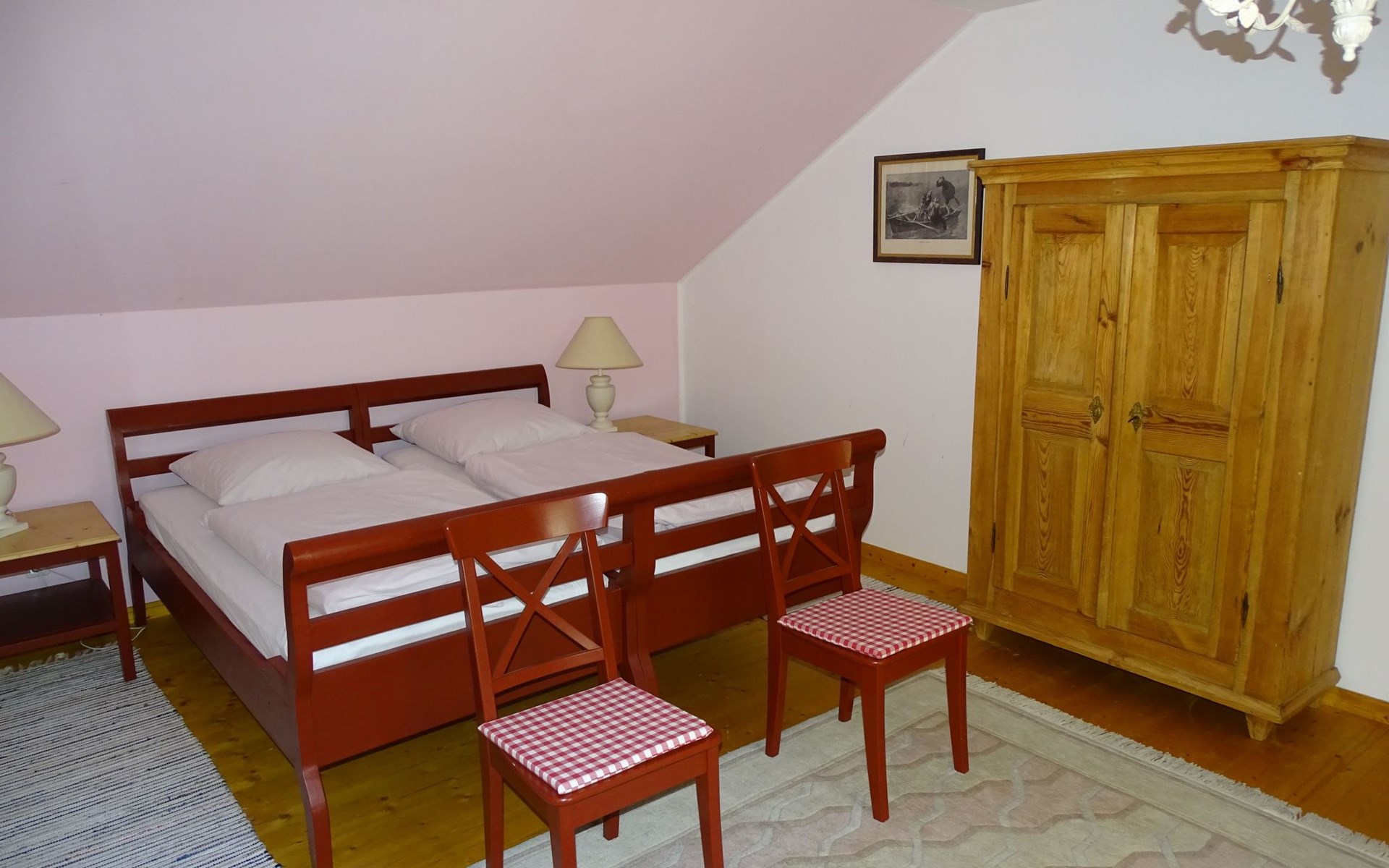The holiday home Victoria is divided into two floors. On the ground floor is the large hallway, the guest WC and the large, rustic kitchen-cum-living room with a large tiled stove. The kitchen-living room has dark panelling, just as it used to look in Bavarian taverns. The kitchen has a kitchenette with cooker, dishwasher and fridge. The beautiful large tiled stove is heated from the hallway. The large, wide wooden staircase takes you to the upper floor. There you will find the bathroom with shower, WC and washbasin. In the first bedroom there is a living area with two sofas, writing facilities, a farmhouse wardrobe with TV and two bunk beds. In the second bedroom there is a large double bed and a seating area. All floors in the house are made of wood. There are spacious built-in wardrobes in the second bedroom and in the hallway.
