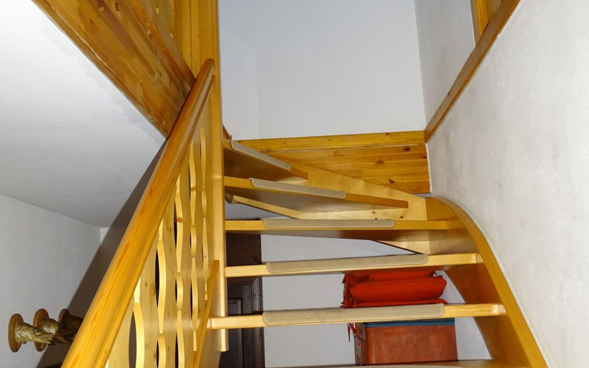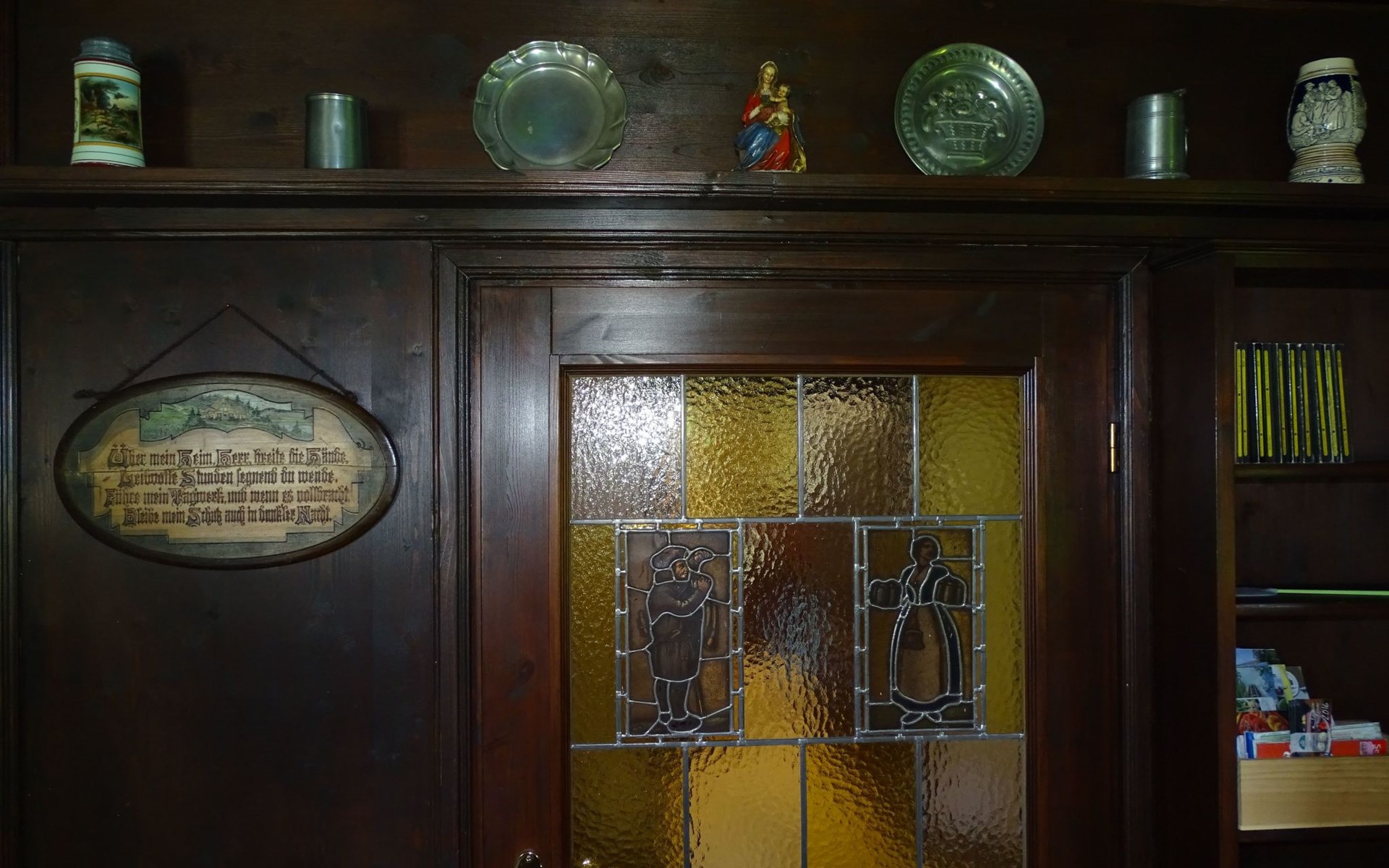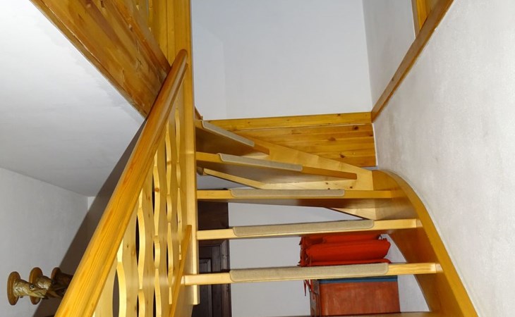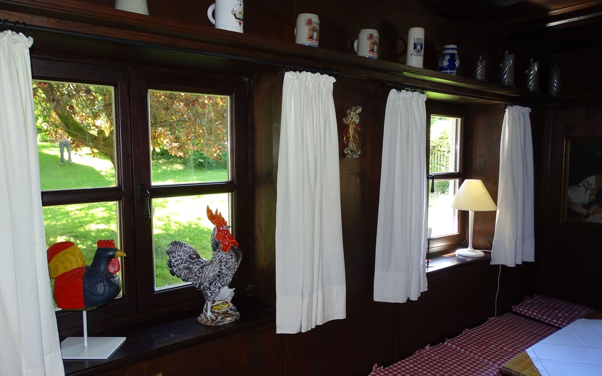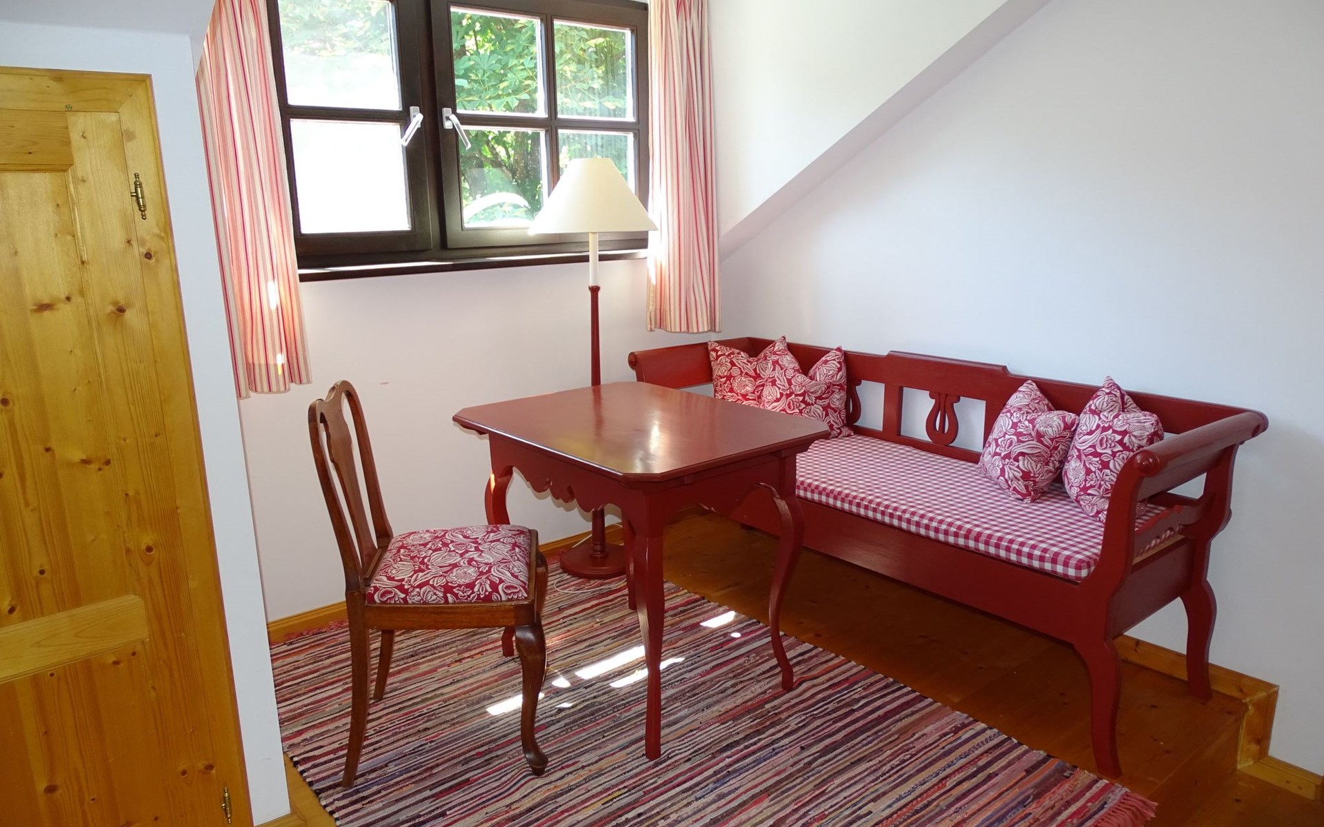 The holiday home Victoria is divided into two floors. On the ground floor is the large hallway, the guest WC and the large, rustic kitchen-cum-living room with a large tiled stove. The kitchen-living room has dark panelling, just as it used to look in Bavarian taverns. The kitchen has a kitchenette with cooker, dishwasher and fridge. The beautiful large tiled stove is heated from the hallway. The large, wide wooden staircase takes you to the upper floor. There you will find the bathroom with shower, WC and washbasin. In the first bedroom there is a living area with two sofas, writing facilities, a farmhouse wardrobe with TV and two bunk beds. In the second bedroom there is a large double bed and a seating area. All floors in the house are made of wood. There are spacious built-in wardrobes in the second bedroom and in the hallway.