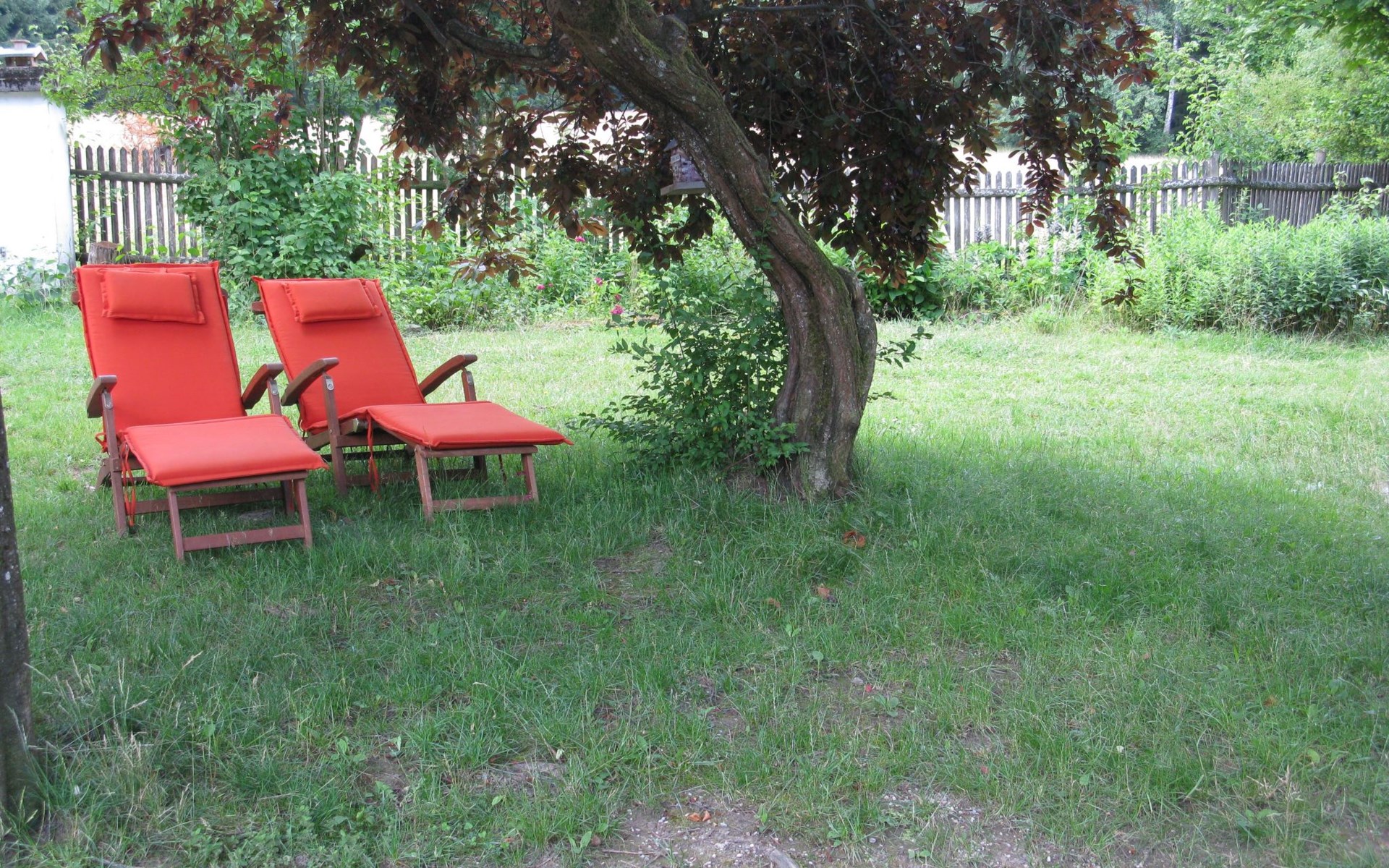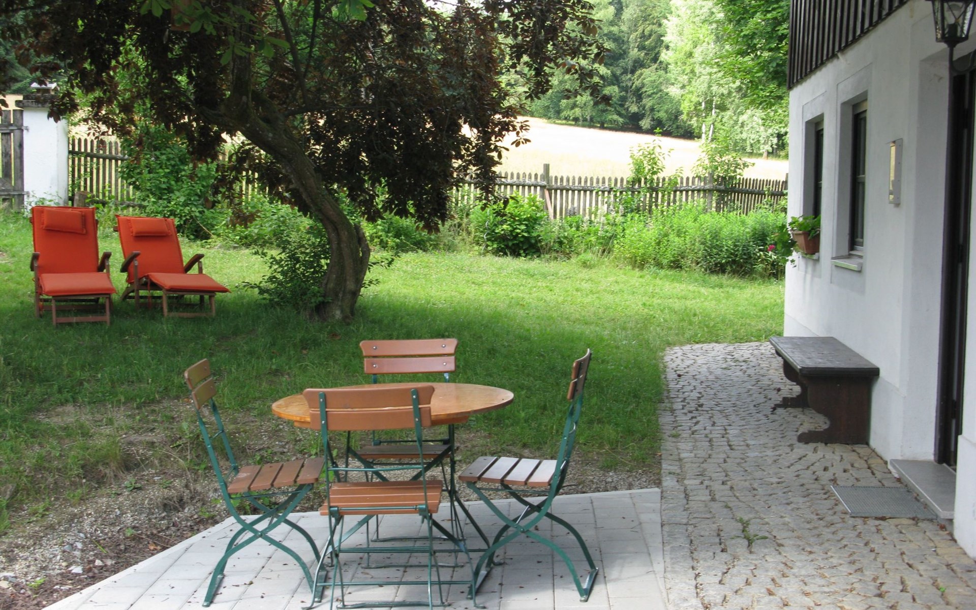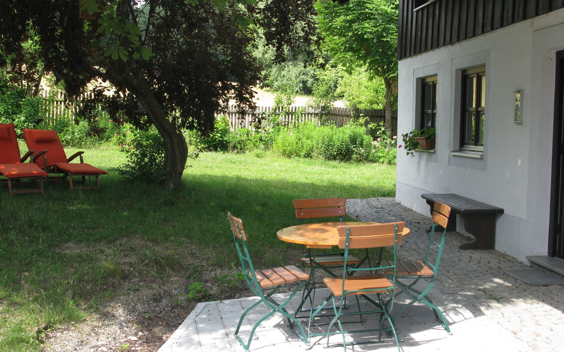 There is a small bench in front of the house where you can relax. There is also a seat and a parasol.