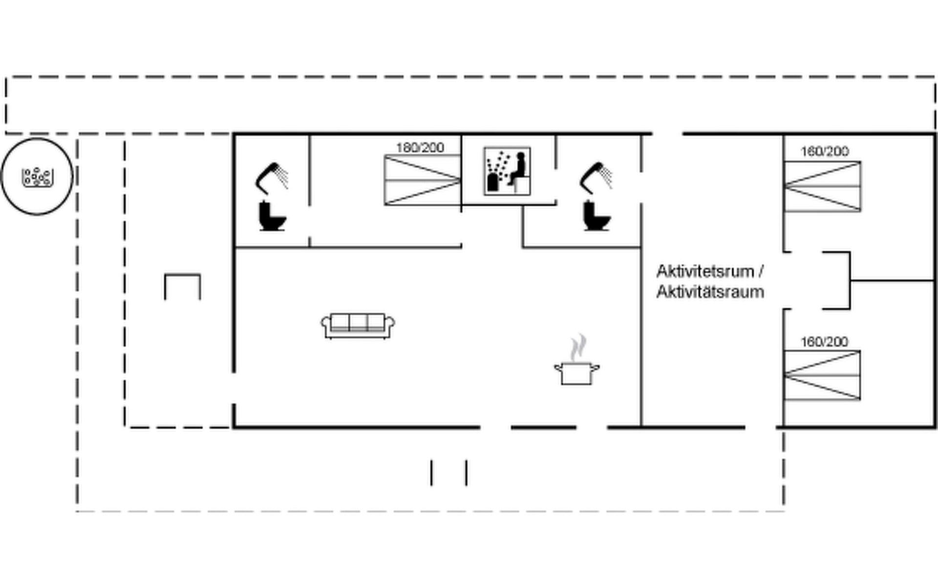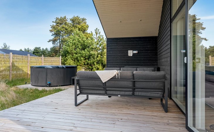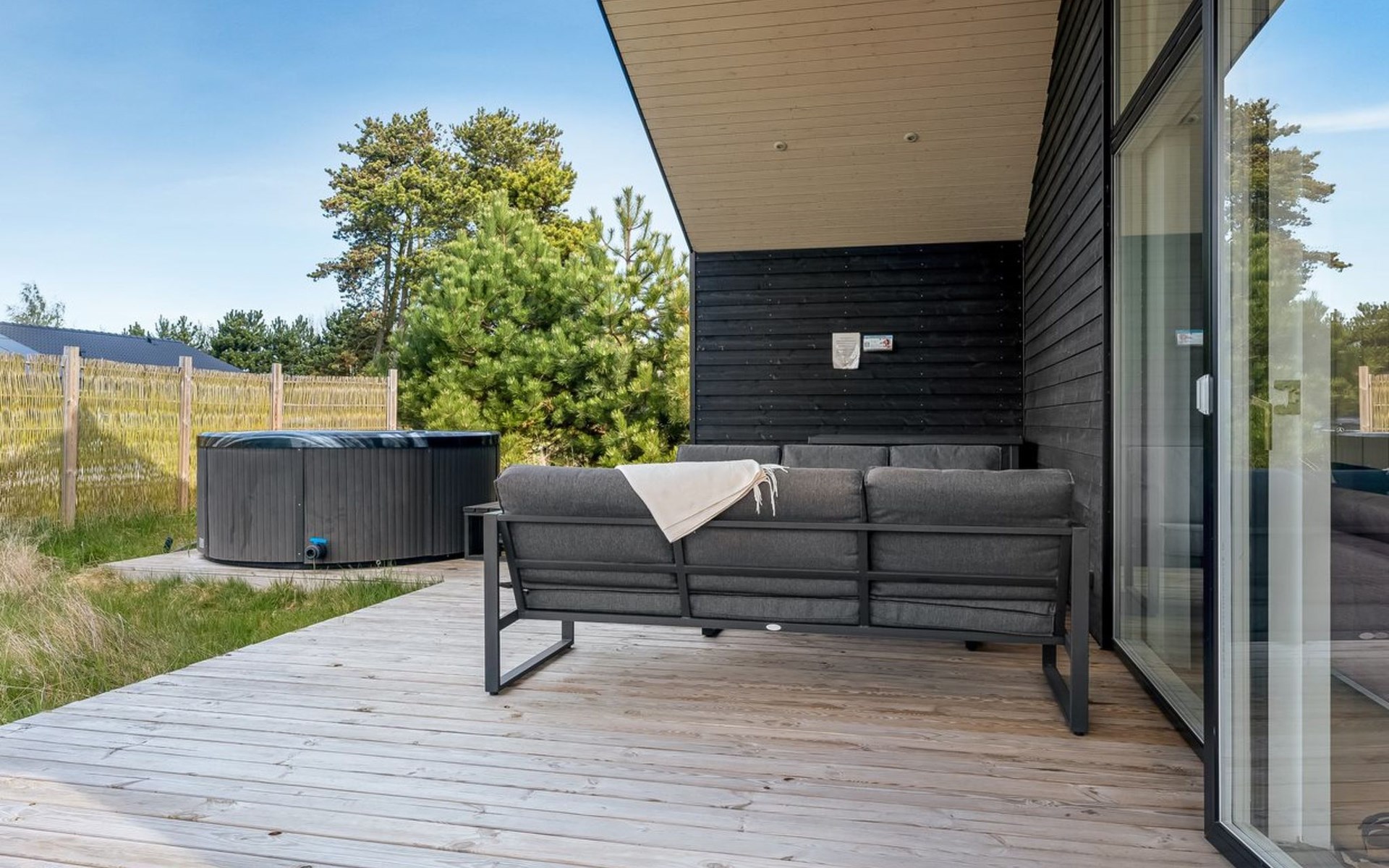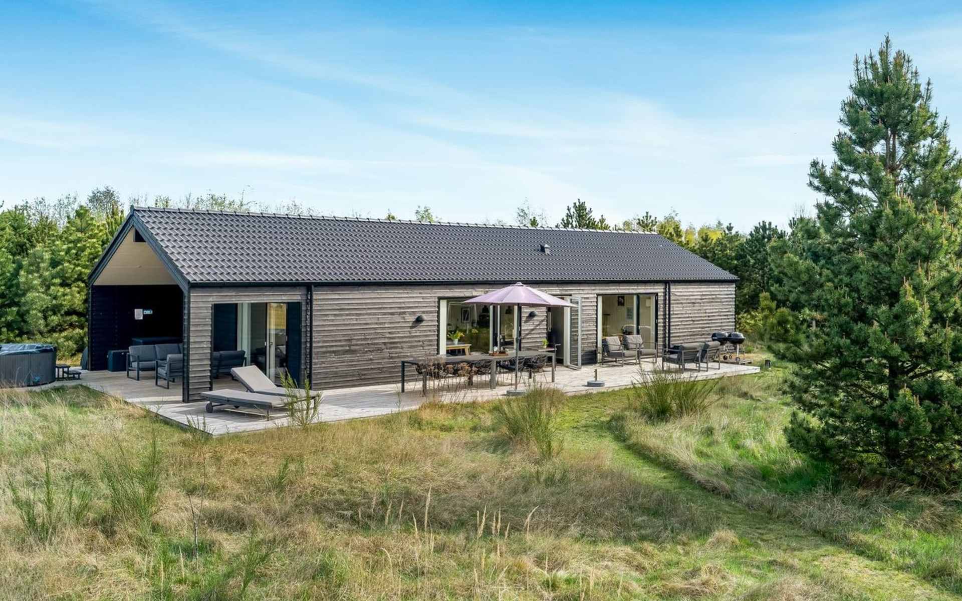 Single-family house, built in 2022. 900 m from the sea. Private: natural state property 1'398 m2. Outdoor shower, barbecue, children's playground. In the house: sauna, trampoline, washing machine, tumble dryer. Parking at the house. E-charging station. Grocery 1 km. Golf course 2 km. The owner does not accept any youth groups.
