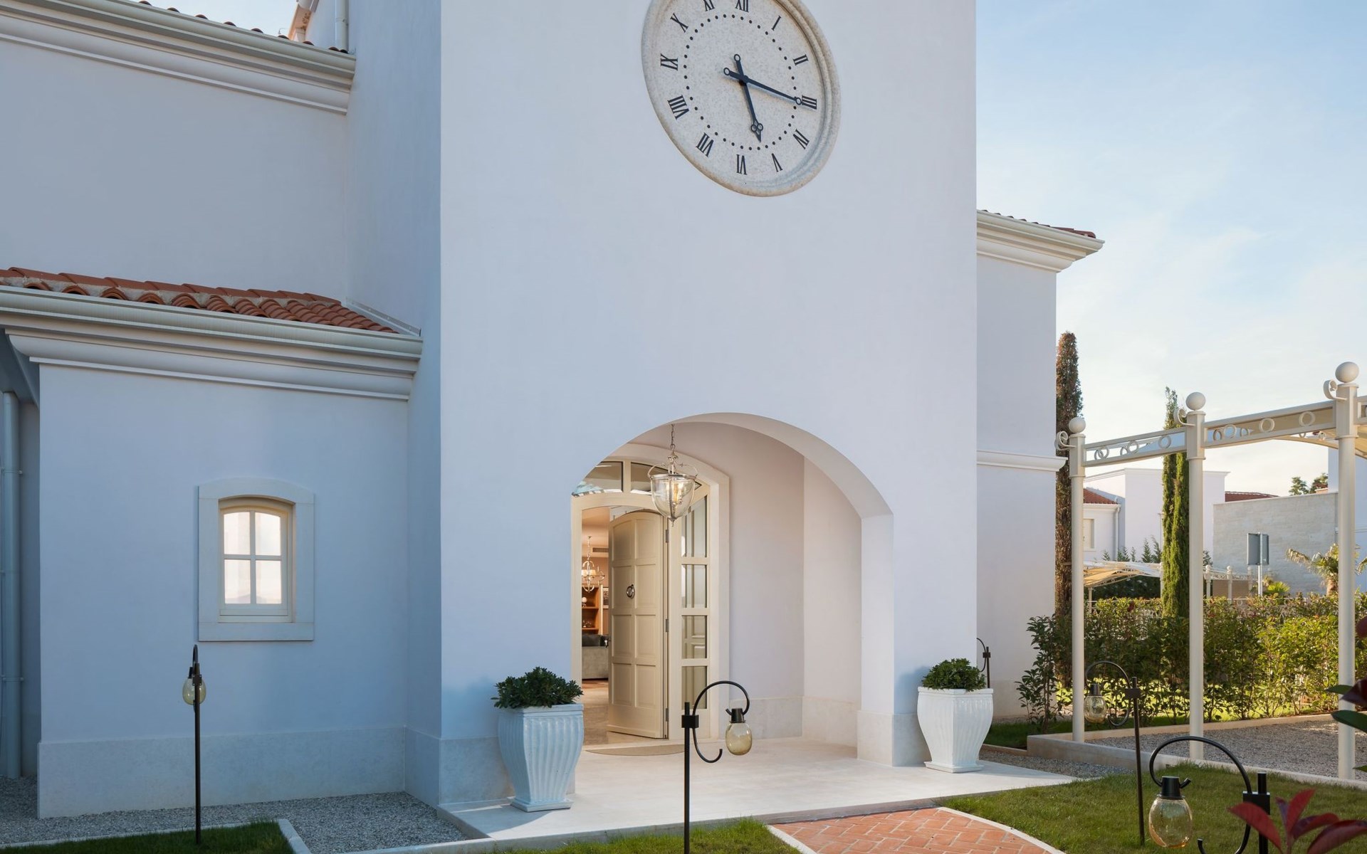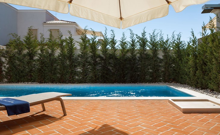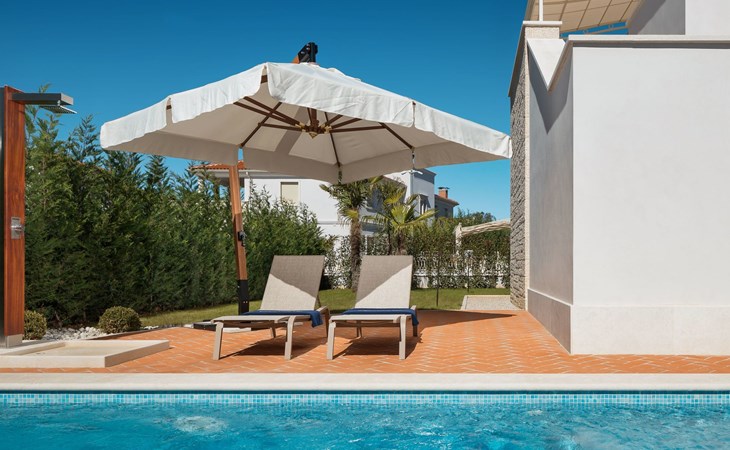 Tar 7 km from Poreč: Beautiful villa "Adele", 2 storeys. In the hamlet Vabriga 1 km from the centre of Tar, 9 km from the centre of Novigrad, in a sunny position, 2 km from the sea, 2 km from the beach. Private: property 600 m2 (fenced), swimming pool angular, heated (7 x 7 m, depth 130 cm, seasonal availability: 01.May. - 01.Nov.) with internal staircase. Outdoor shower, terrace, garden furniture, barbecue. In the house: internet access, washing machine. Available: bicycles (2). Roofed, parking (for 2 cars) at the house on the premises. Shop 600 m, supermarket 800 m, restaurant 500 m, bus stop 600 m, pebble beach 2 km, rocky beach 2 km. Please note: airfield 60 km from the property. Swimming pool heated (extra).