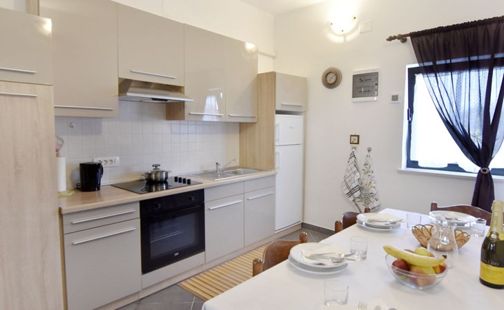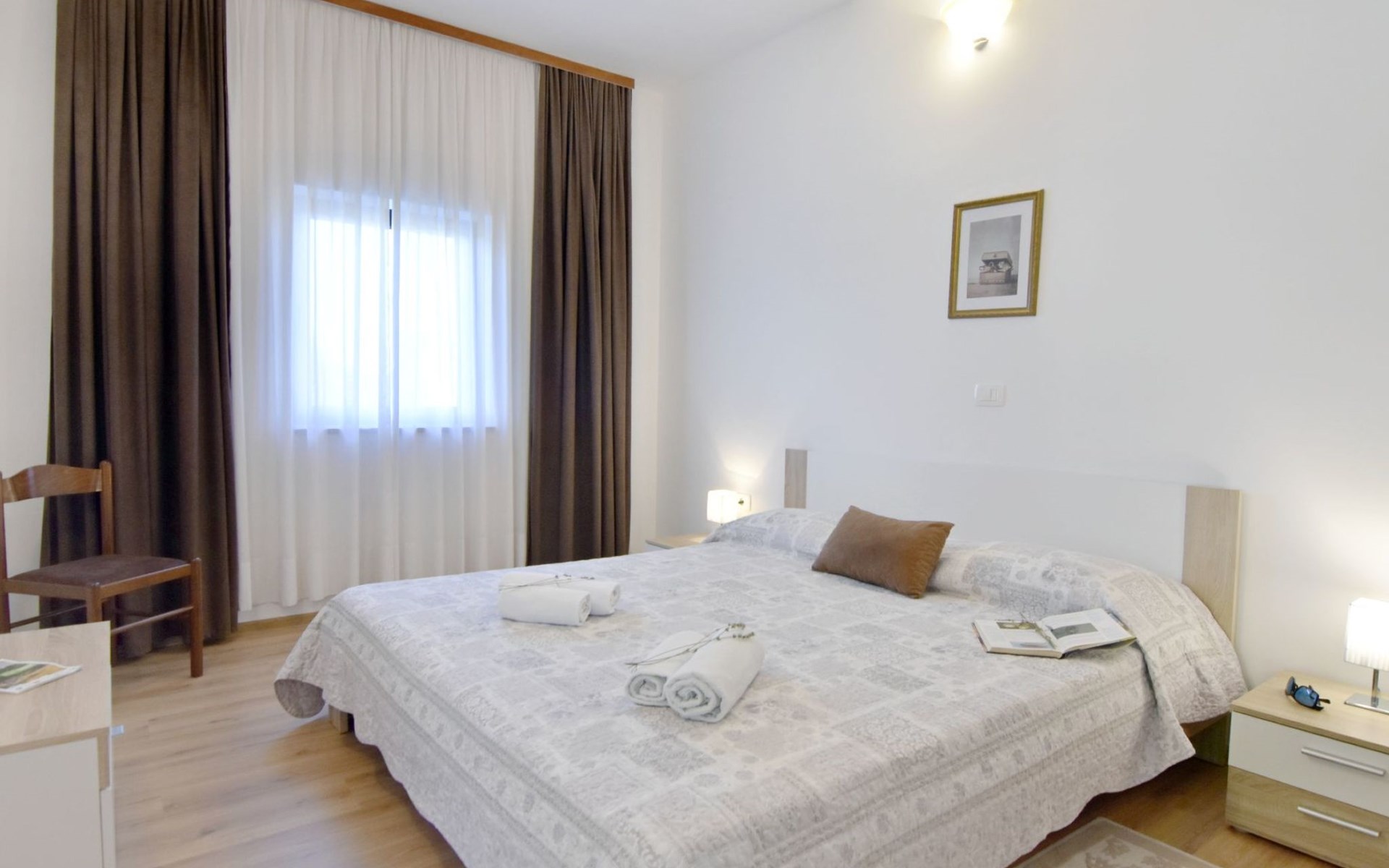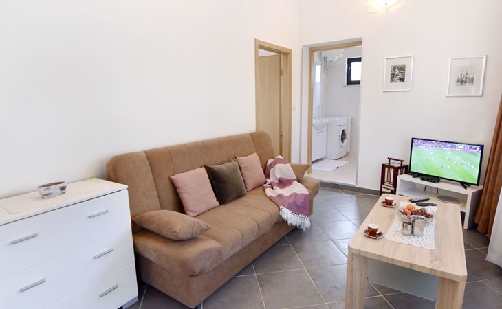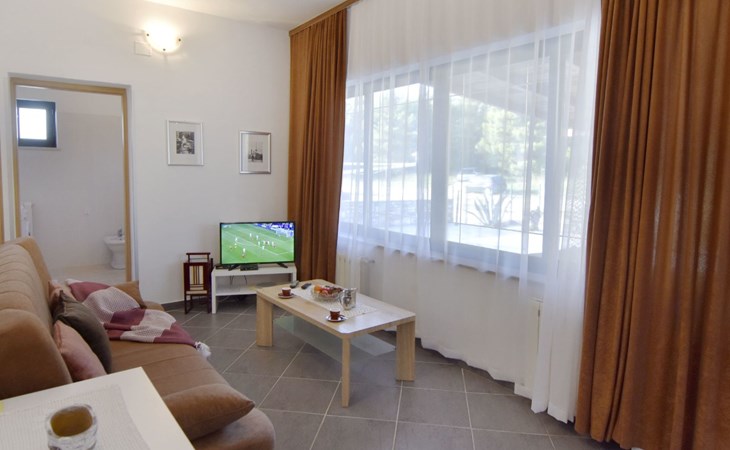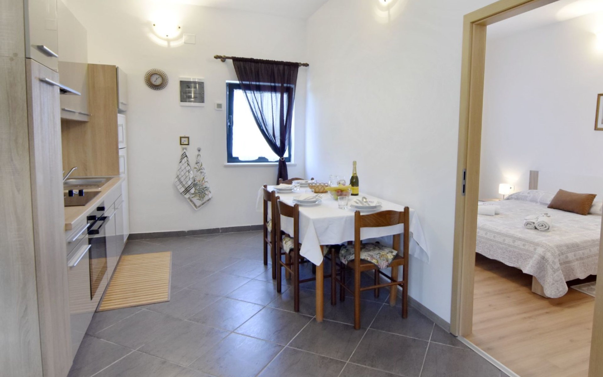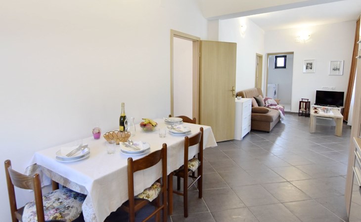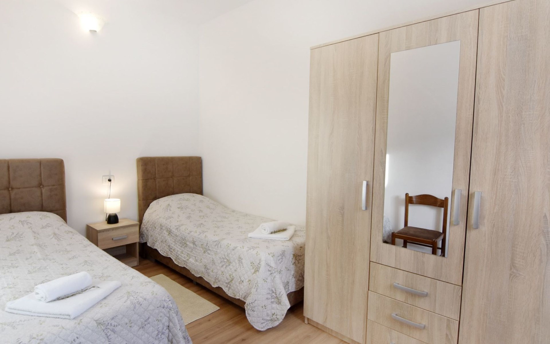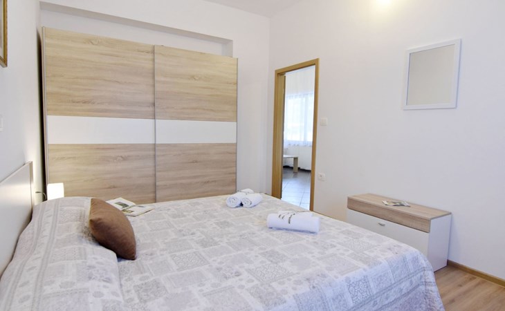 The 54 m² apartment in Grupija, Crveni Vrh, is located on the ground floor of a family house and has two bedrooms: one with a double bed and the other with two single beds. The apartment offers a large private covered terrace equipped with a table and chairs, ideal for evening gatherings or morning breakfasts. The kitchen is fully equipped with a refrigerator, stove, oven, kettle, coffee machine, and a table with four chairs. The living room is furnished with a sofa, coffee table, satellite TV, Wi-Fi internet, and air conditioning. The bathroom with a window features a shower cabin, bidet, toilet, sink with a cabinet, and a washing machine.