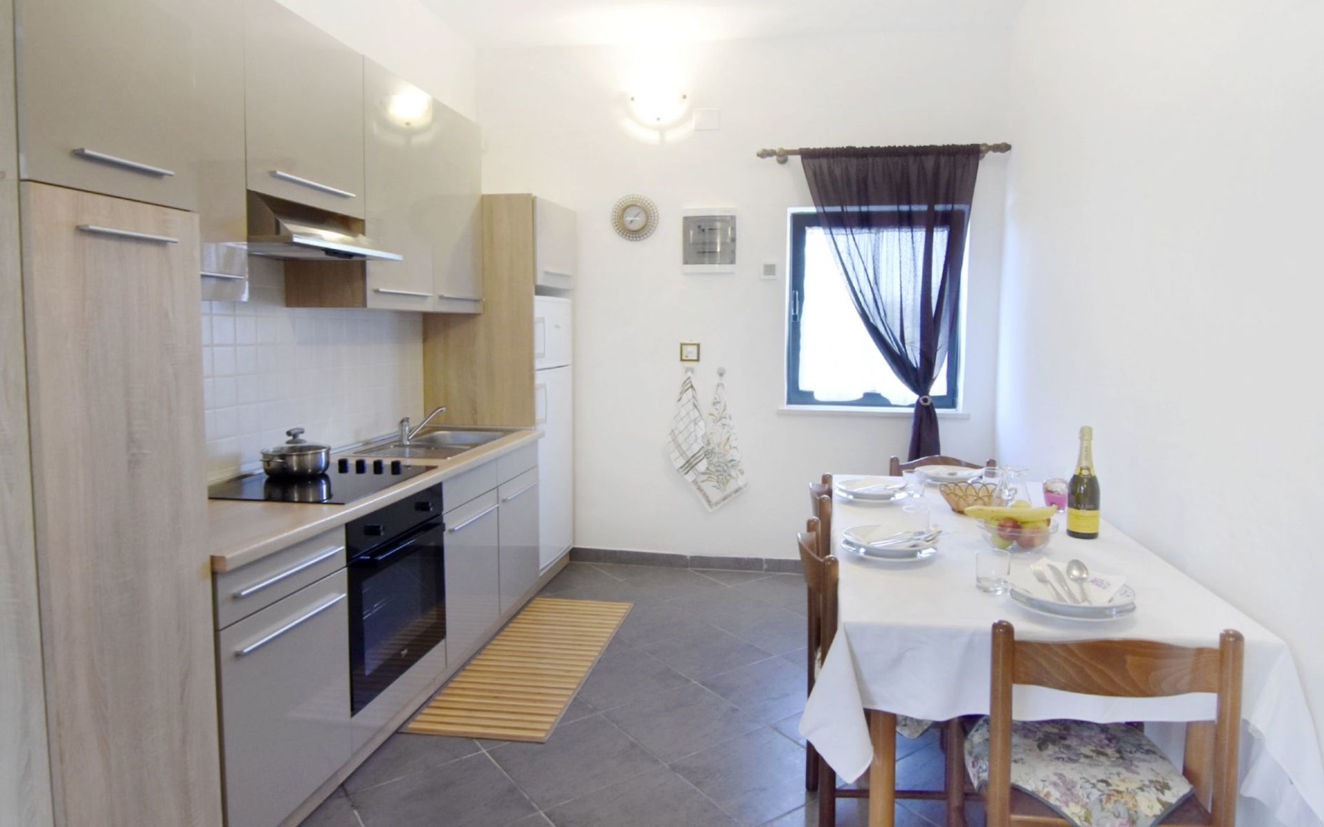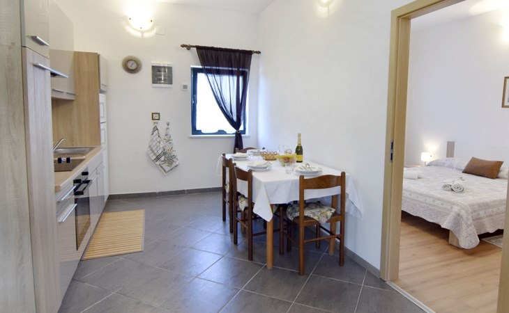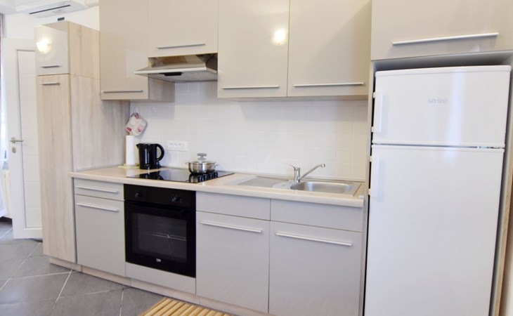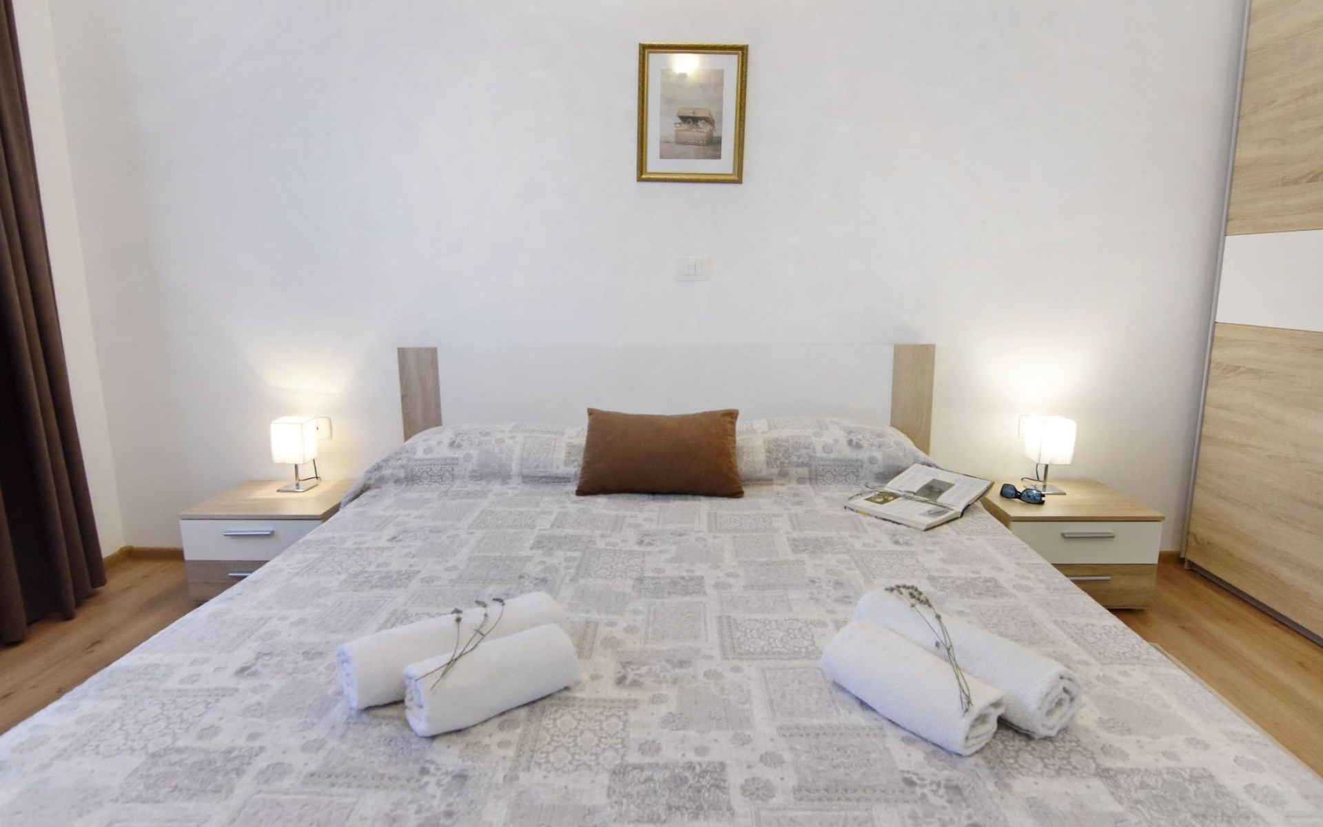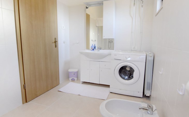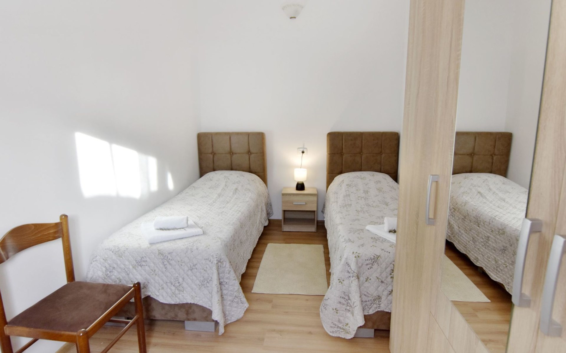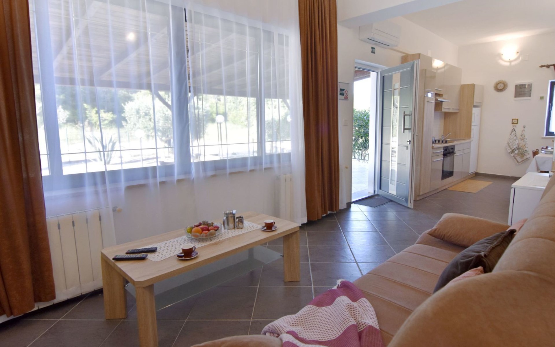 The 54 m² apartment in Grupija, Crveni Vrh, is located on the ground floor of a family house and has two bedrooms: one with a double bed and the other with two single beds. The apartment offers a large private covered terrace equipped with a table and chairs, ideal for evening gatherings or morning breakfasts. The kitchen is fully equipped with a refrigerator, stove, oven, kettle, coffee machine, and a table with four chairs. The living room is furnished with a sofa, coffee table, satellite TV, Wi-Fi internet, and air conditioning. The bathroom with a window features a shower cabin, bidet, toilet, sink with a cabinet, and a washing machine.