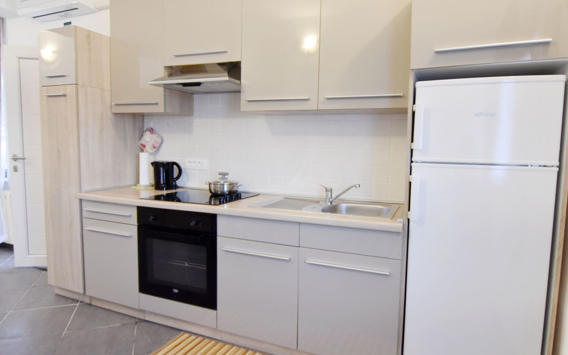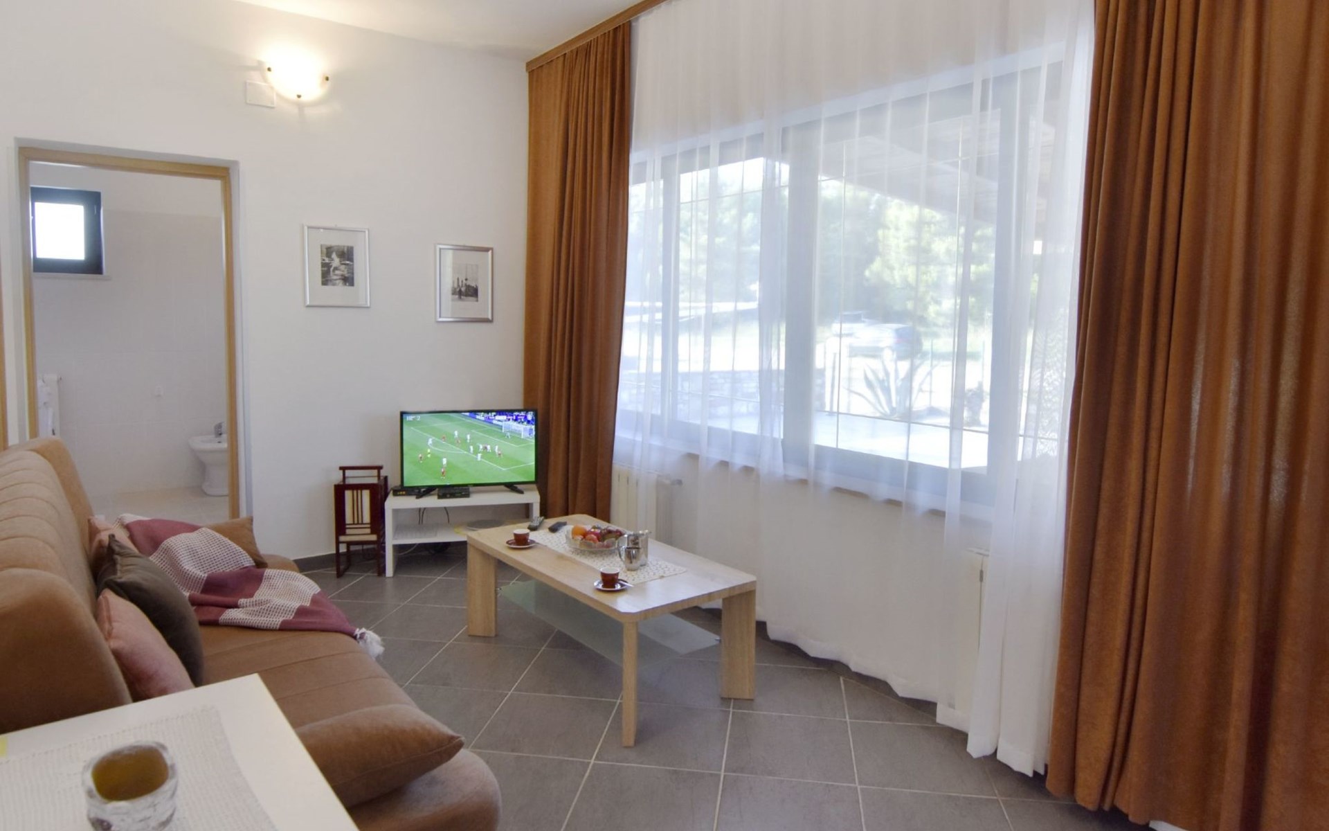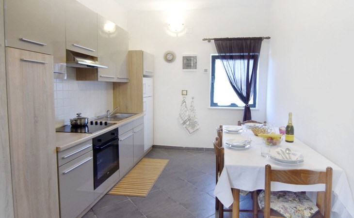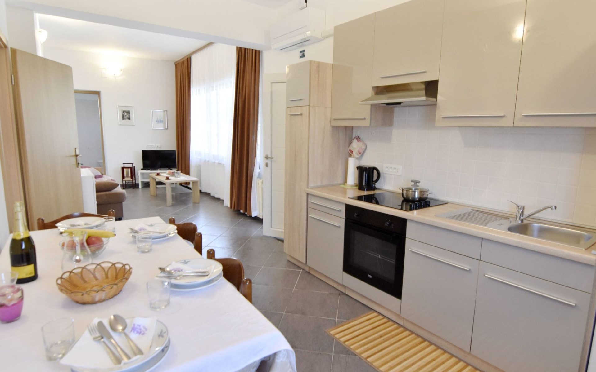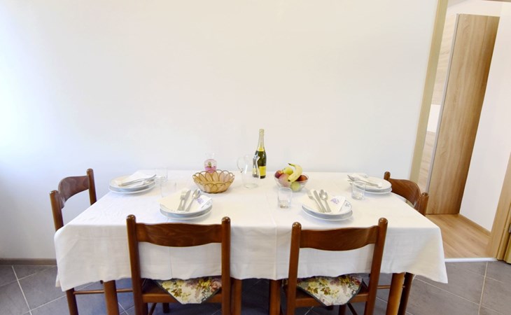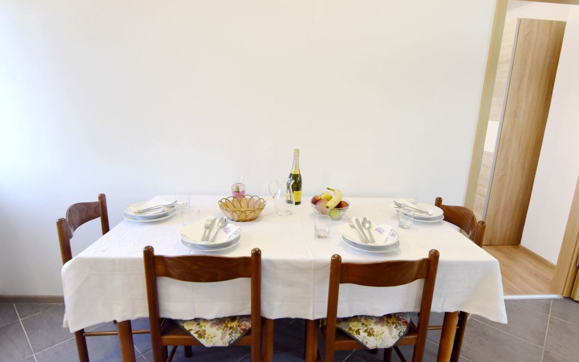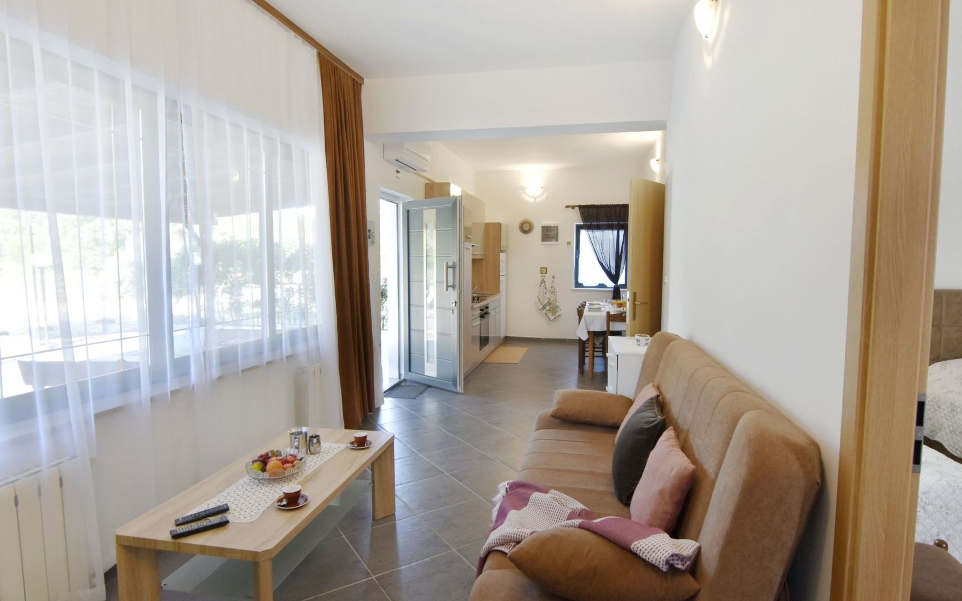 The 54 m² apartment in Grupija, Crveni Vrh, is located on the ground floor of a family house and has two bedrooms: one with a double bed and the other with two single beds. The apartment offers a large private covered terrace equipped with a table and chairs, ideal for evening gatherings or morning breakfasts. The kitchen is fully equipped with a refrigerator, stove, oven, kettle, coffee machine, and a table with four chairs. The living room is furnished with a sofa, coffee table, satellite TV, Wi-Fi internet, and air conditioning. The bathroom with a window features a shower cabin, bidet, toilet, sink with a cabinet, and a washing machine.
