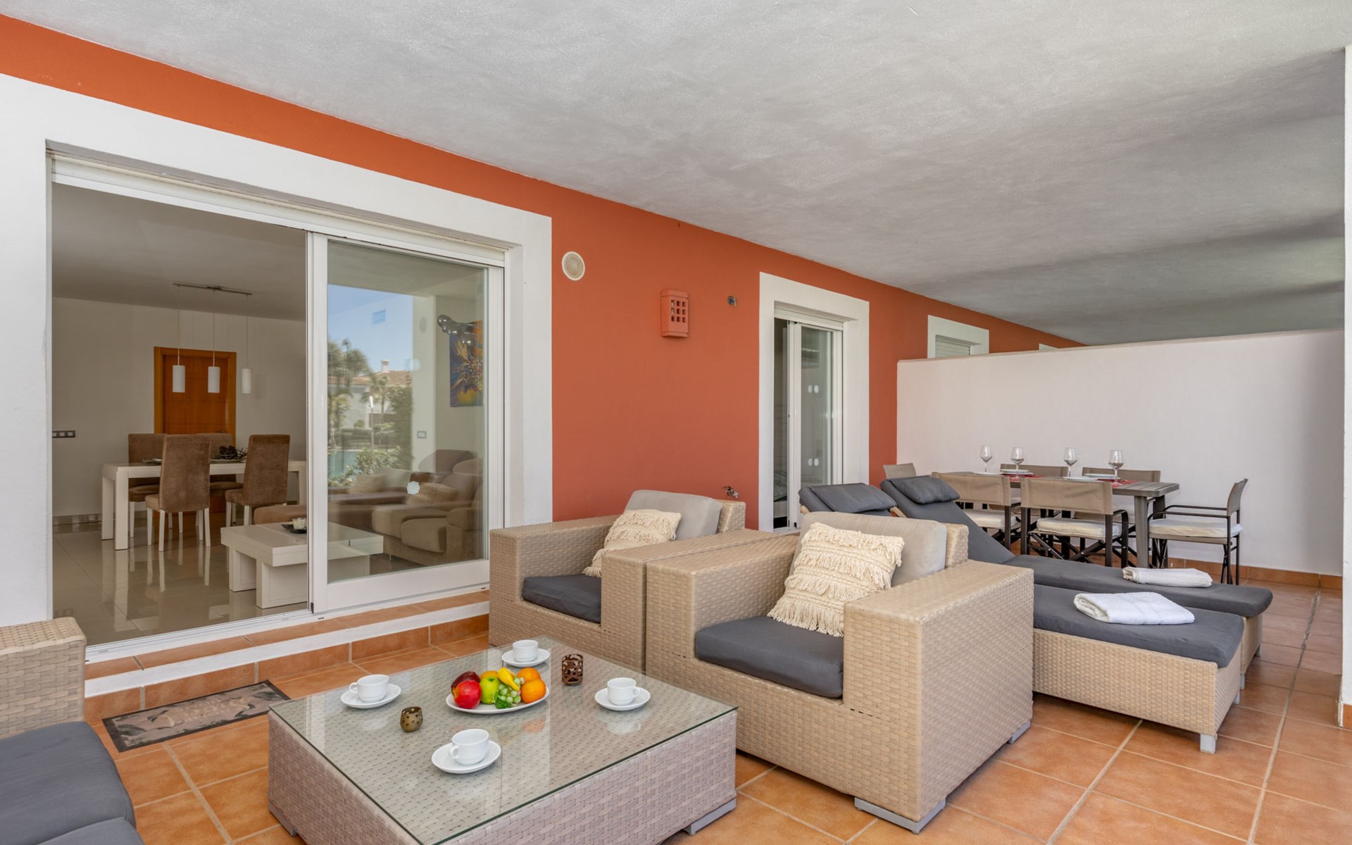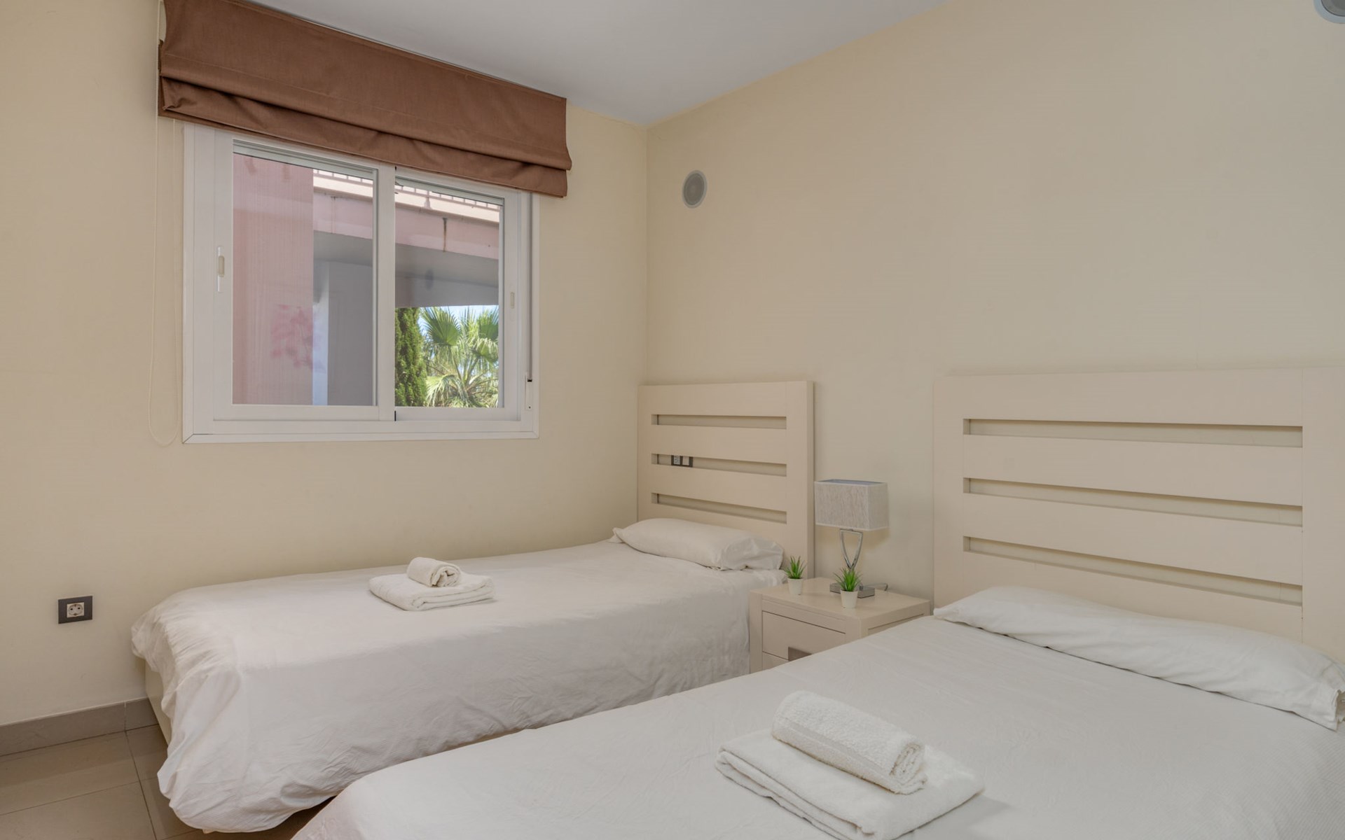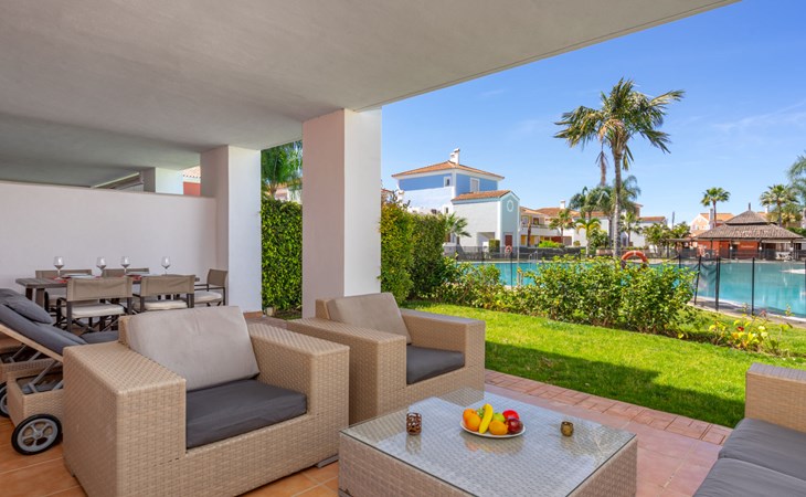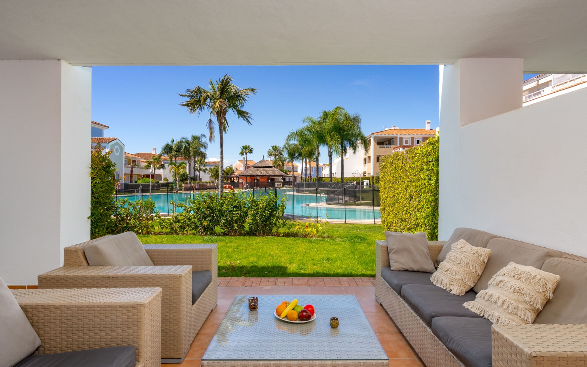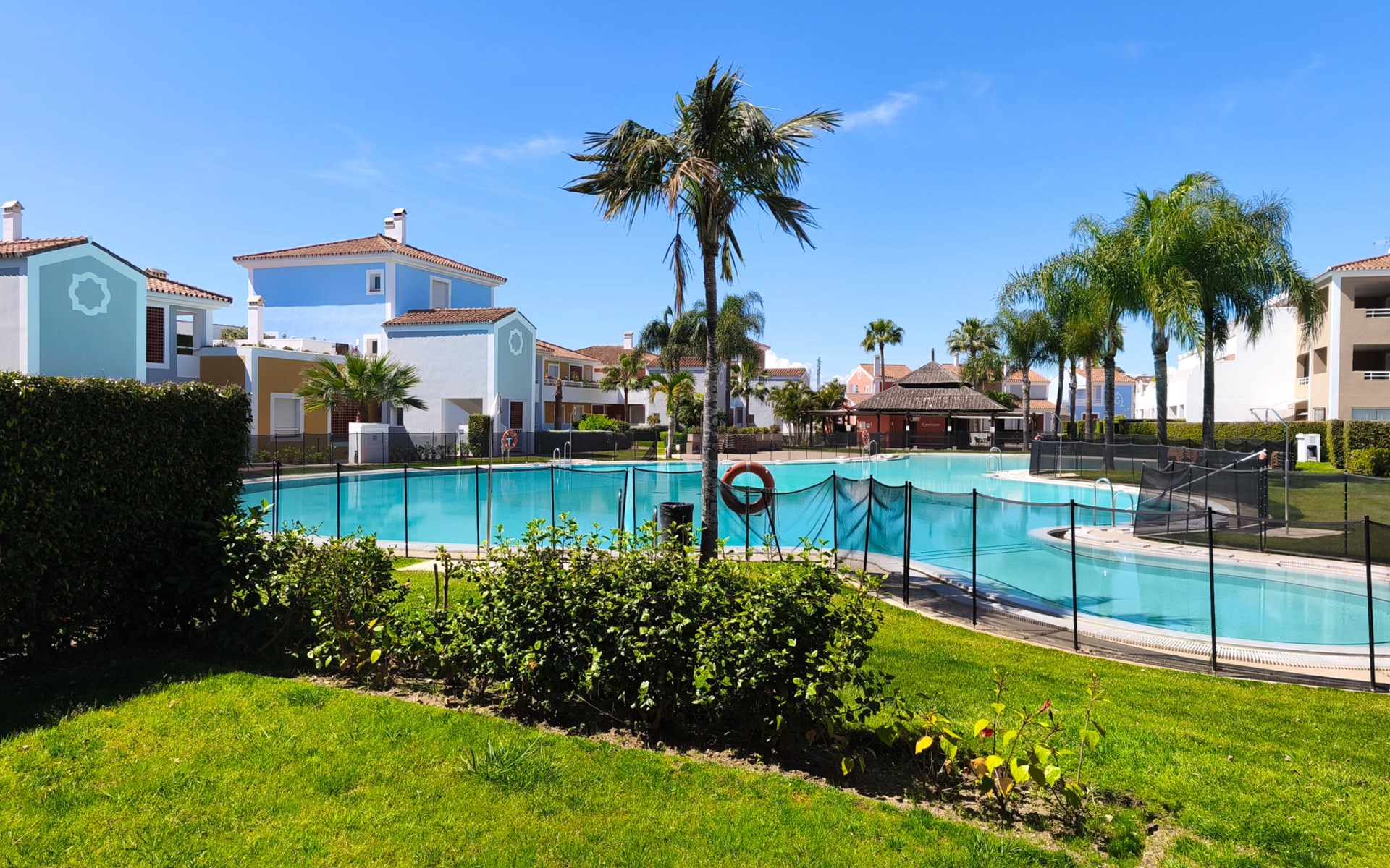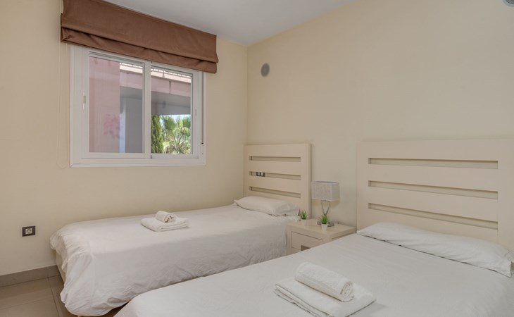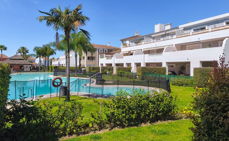 Very beautiful, cosy, very comfortable resort "Cortijo del Mar", built in 2011, surrounded by trees. 5 km from the centre of San Pedro de Alcantara, 14 km from the centre of Estepona, outside the resort, 16 km from the centre of Marbella, in the district El Paraiso, in a quiet, sunny position, traffic calmed area, 1.6 km from the sea, 2.6 km from the beach. For shared use: garden with lawn, natural garden, lawn for sunbathing, swimming pool kidney-shaped (43 x 23 m, depth 100 - 210 cm, seasonal availability: 01.Apr. - 15.Oct. pool opening hours: 11:00-18:00 and 11:00-20:00). Shower/WC in the pool area, children's pool, outdoor shower. Shop, supermarket, restaurant 500 m, bus stop "El Pilar" 800 m, sandy beach "Playa Salduna" 2.6 km. Sports harbour 9 km, marina 9 km, golf course (18 hole) 2.4 km. The owner does not accept any youth groups. Please note: guarded residence. Additional accommodations can be booked.