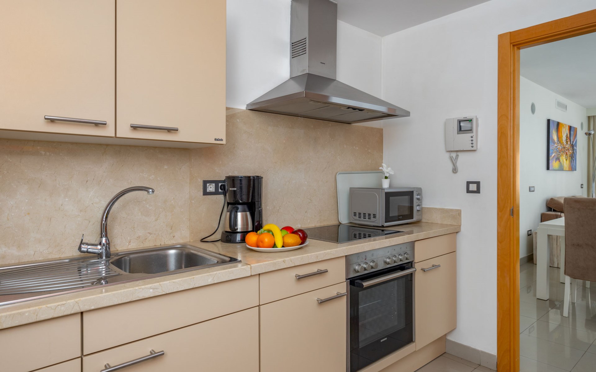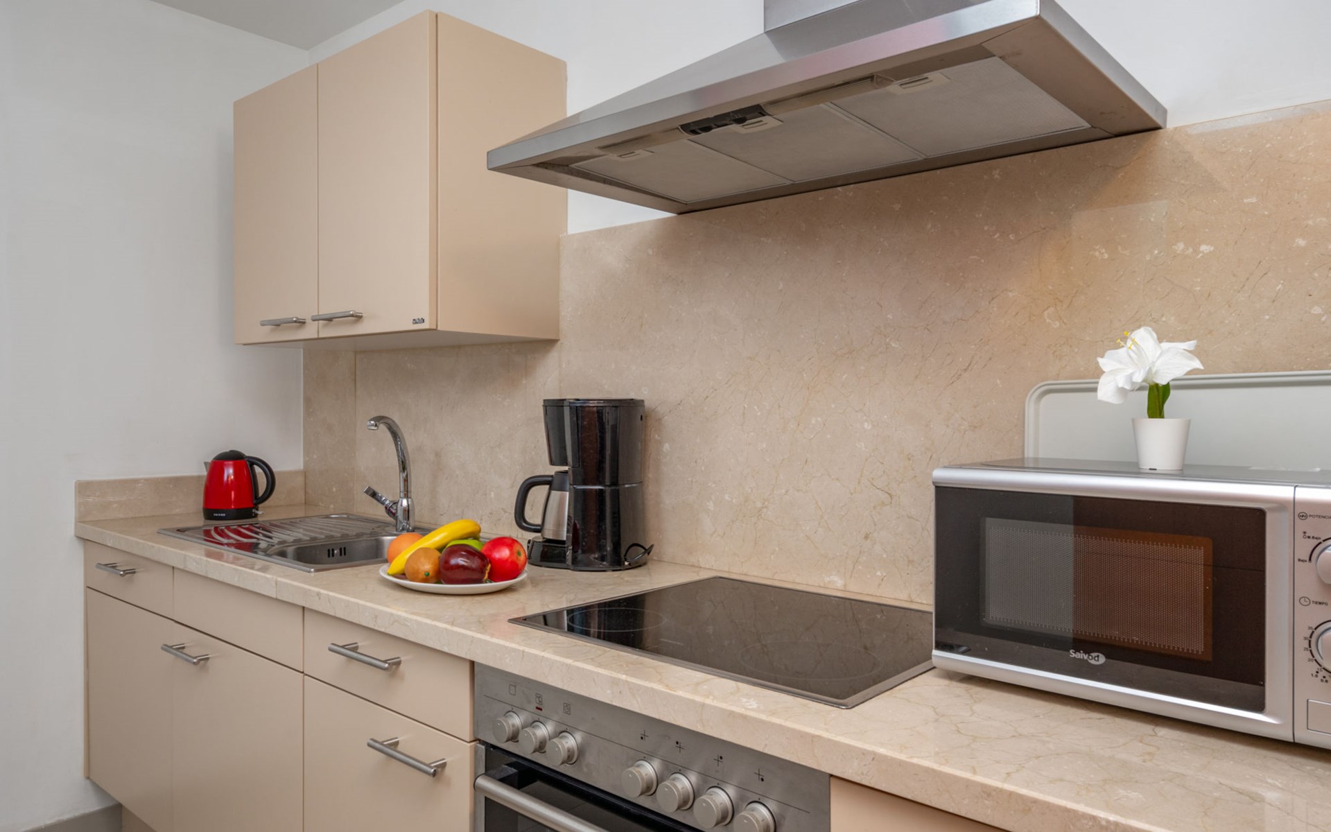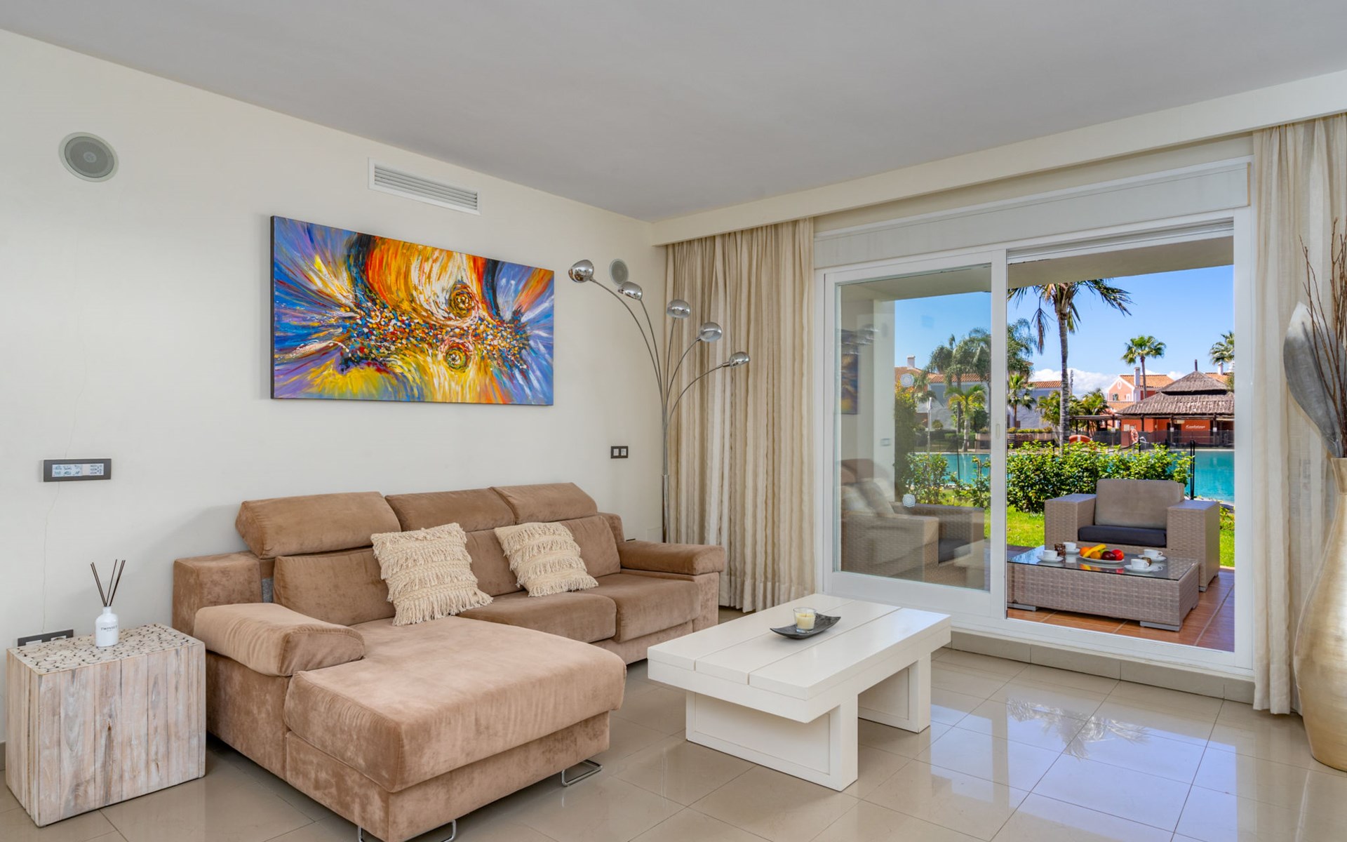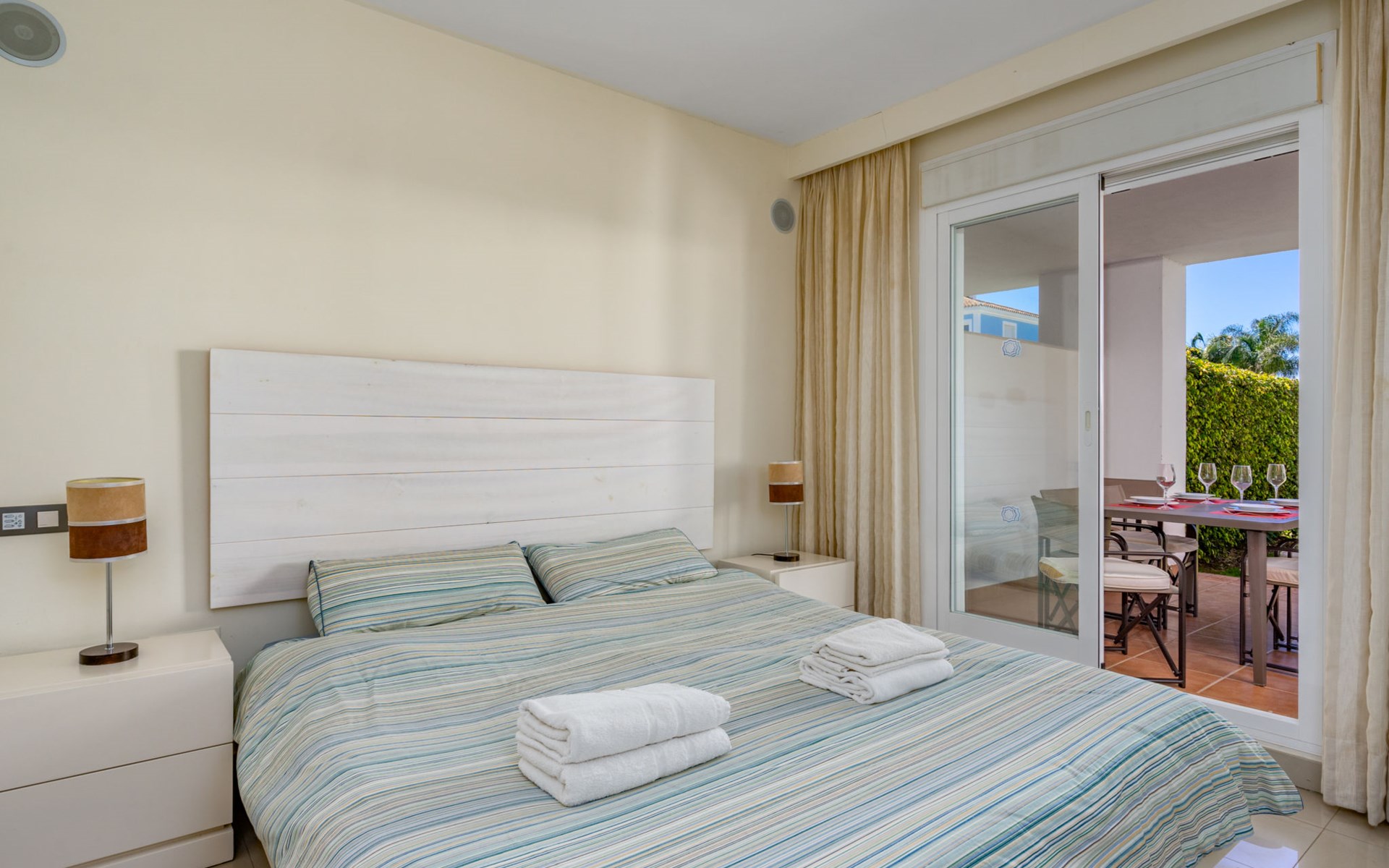 Very beautiful, cosy, very comfortable resort "Cortijo del Mar", built in 2011, surrounded by trees. 5 km from the centre of San Pedro de Alcantara, 14 km from the centre of Estepona, outside the resort, 16 km from the centre of Marbella, in the district El Paraiso, in a quiet, sunny position, traffic calmed area, 1.6 km from the sea, 2.6 km from the beach. For shared use: garden with lawn, natural garden, lawn for sunbathing, swimming pool kidney-shaped (43 x 23 m, depth 100 - 210 cm, seasonal availability: 01.Apr. - 15.Oct. pool opening hours: 11:00-18:00 and 11:00-20:00). Shower/WC in the pool area, children's pool, outdoor shower. Shop, supermarket, restaurant 500 m, bus stop "El Pilar" 800 m, sandy beach "Playa Salduna" 2.6 km. Sports harbour 9 km, marina 9 km, golf course (18 hole) 2.4 km. The owner does not accept any youth groups. Please note: guarded residence. Additional accommodations can be booked.
