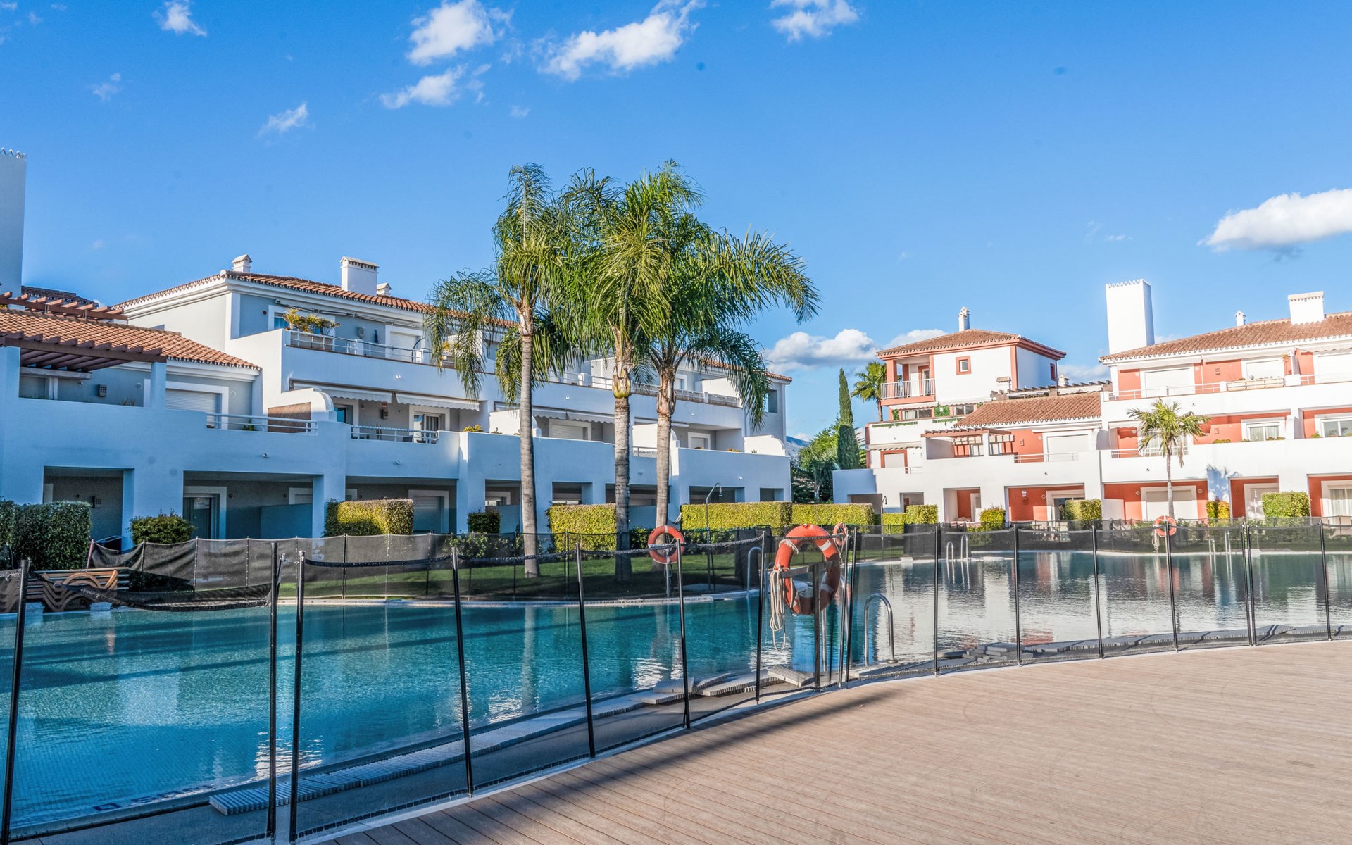 Very beautiful, cosy, very comfortable resort "Cortijo del Mar", built in 2011, surrounded by trees. 5 km from the centre of San Pedro de Alcantara, 14 km from the centre of Estepona, outside the resort, 16 km from the centre of Marbella, in the district El Paraiso, in a quiet, sunny position, traffic calmed area, 1.6 km from the sea, 2.6 km from the beach. For shared use: garden with lawn, natural garden, lawn for sunbathing, swimming pool kidney-shaped (43 x 23 m, depth 100 - 210 cm, seasonal availability: 01.Apr. - 15.Oct. pool opening hours: 11:00-18:00 and 11:00-20:00). Shower/WC in the pool area, children's pool, outdoor shower. Shop, supermarket, restaurant 500 m, bus stop "El Pilar" 800 m, sandy beach "Playa Salduna" 2.6 km. Sports harbour 9 km, marina 9 km, golf course (18 hole) 2.4 km. The owner does not accept any youth groups. Please note: guarded residence. Additional accommodations can be booked.
