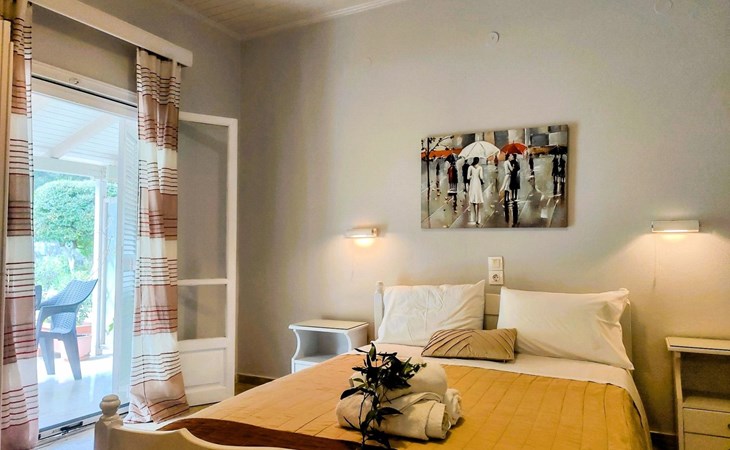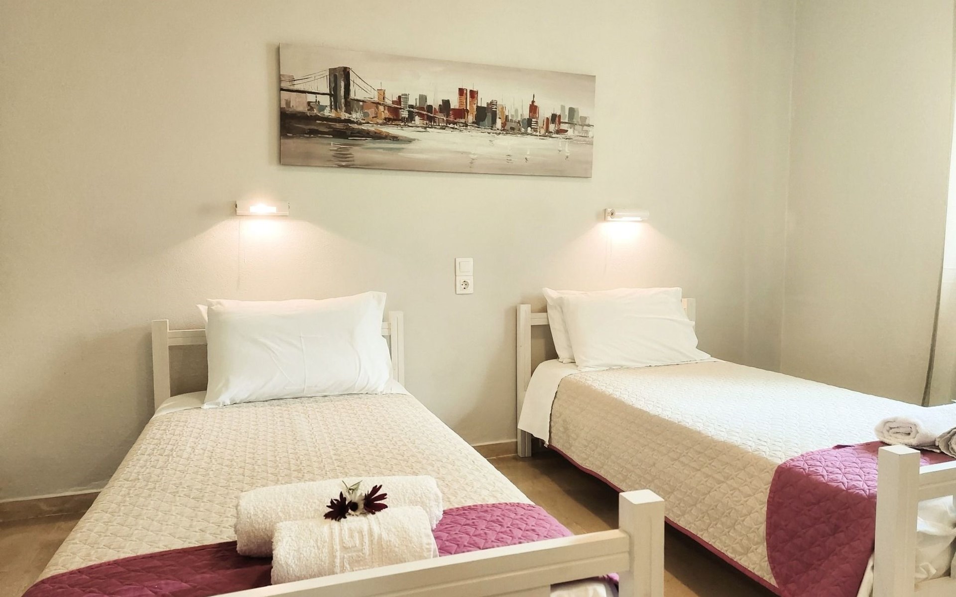 Amalia Ena has two bedrooms: one double with a balcony door opening to the front terrace and one twin with a back window overlooking the olive grove.