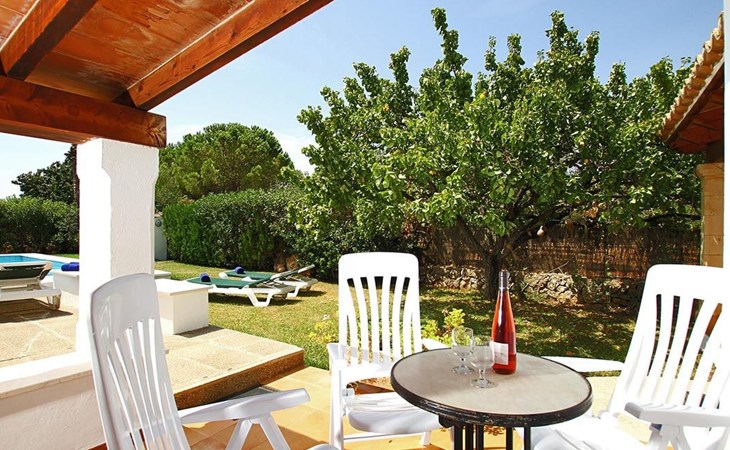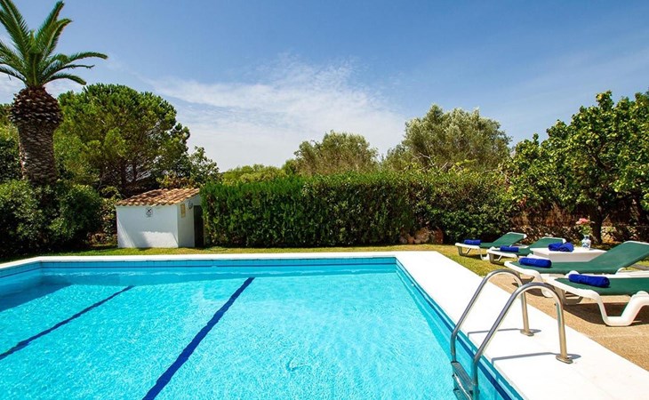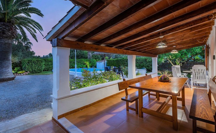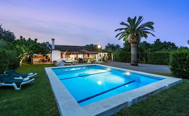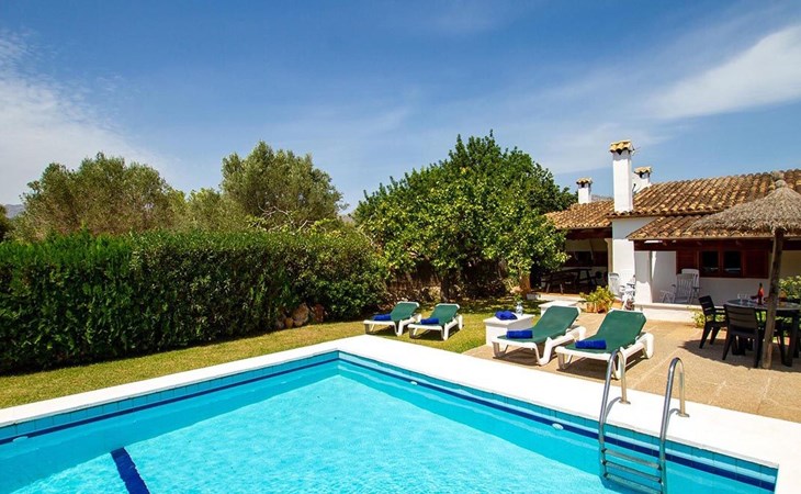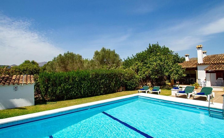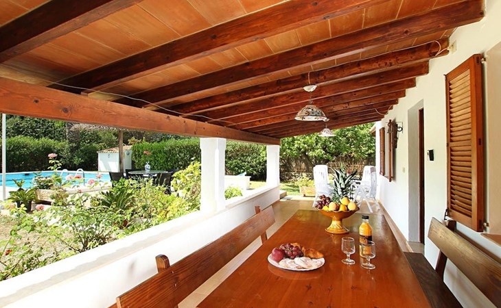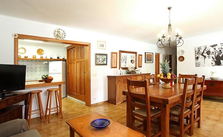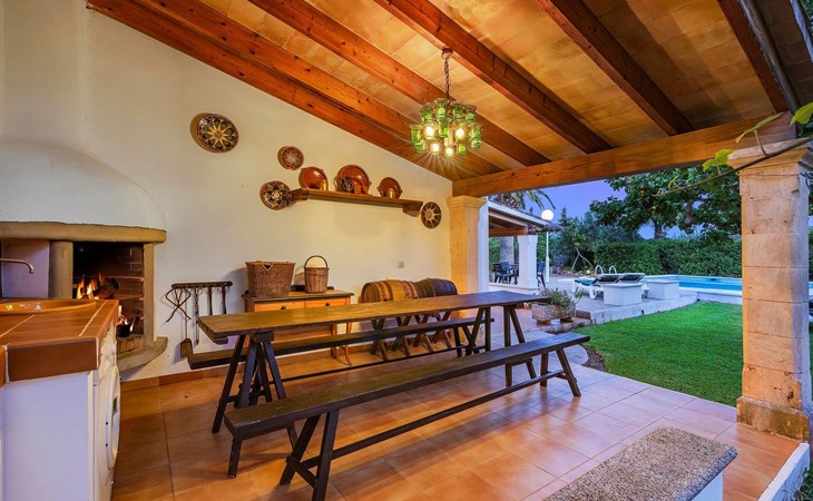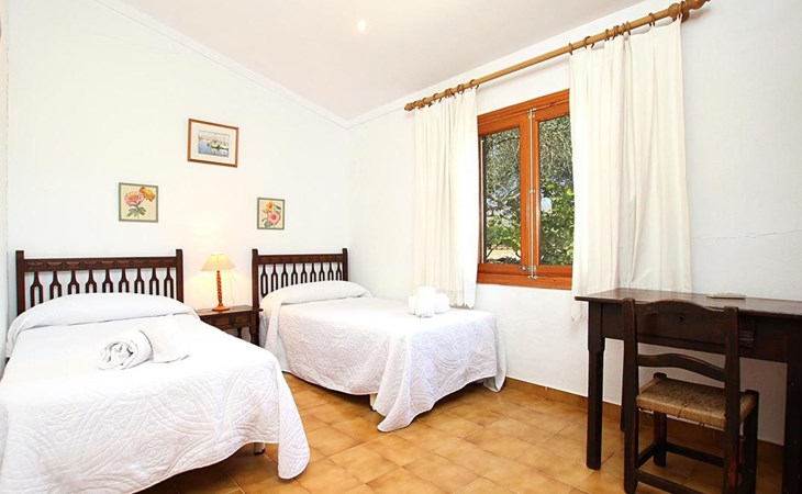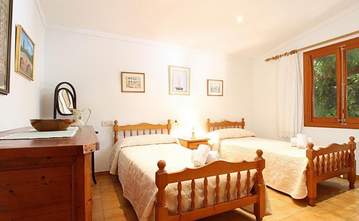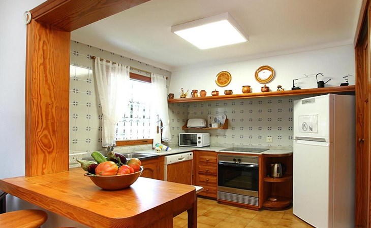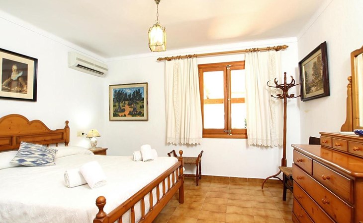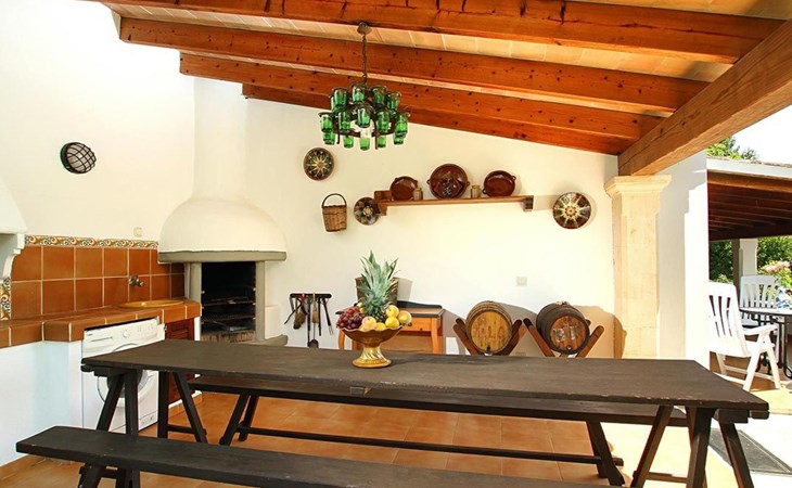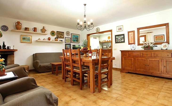 The living room is cosy, with traditional decor and features, including a wood-burning fireplace (purely ornamental). The kitchen is open plan and fully equipped. A hallway from the living room leads to the bedrooms, one double and two singles, all bedrooms share two bathrooms. The large terrace at the front of the villa is a great place to relax and escape the midday heat, overlooking the fabulous pool area with the large material barbecue to one side. The property has 3 bedrooms (all with A/C) and 2 bathrooms.