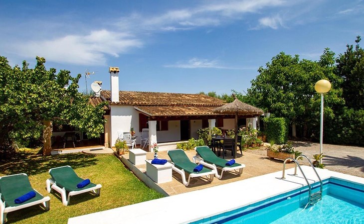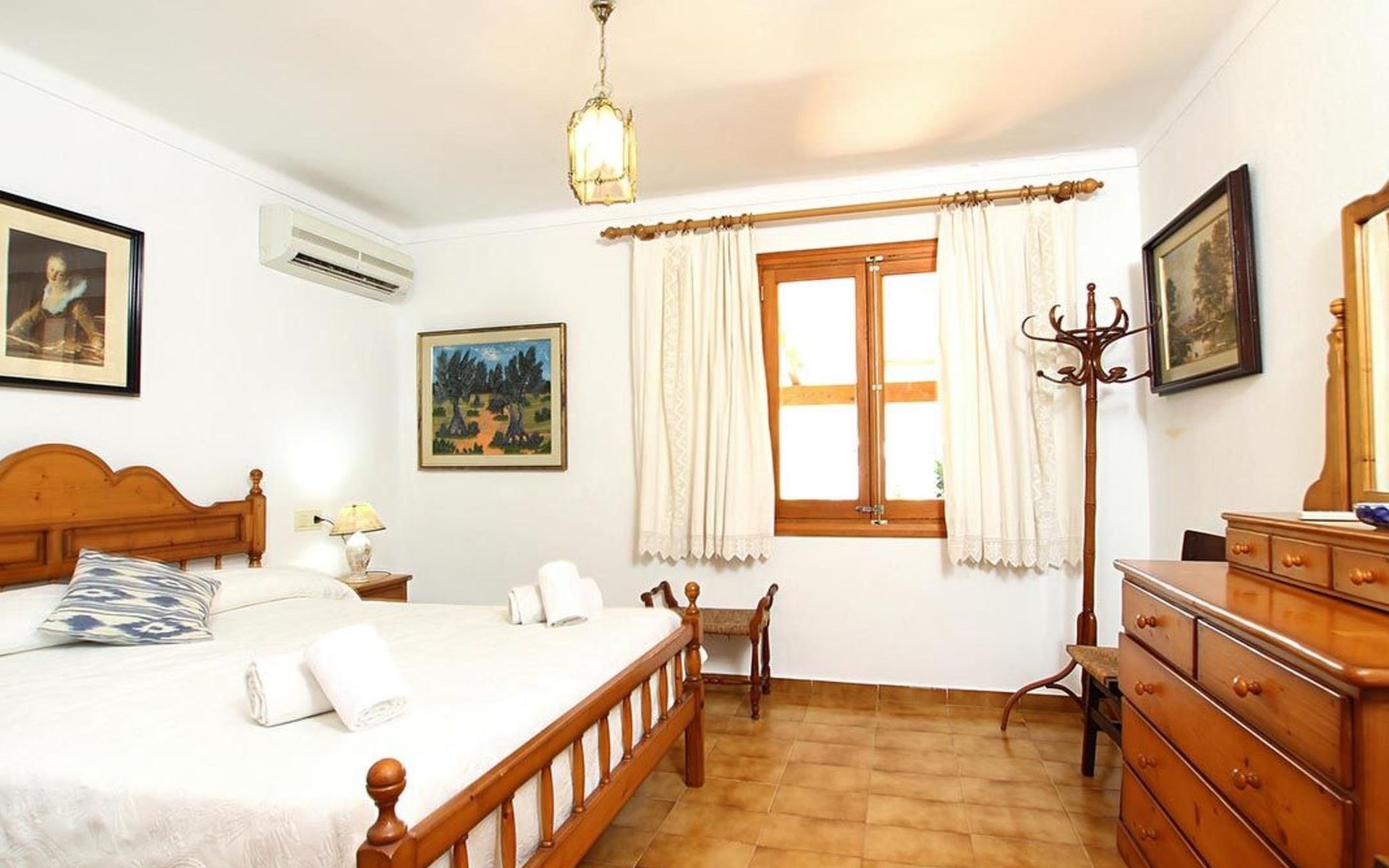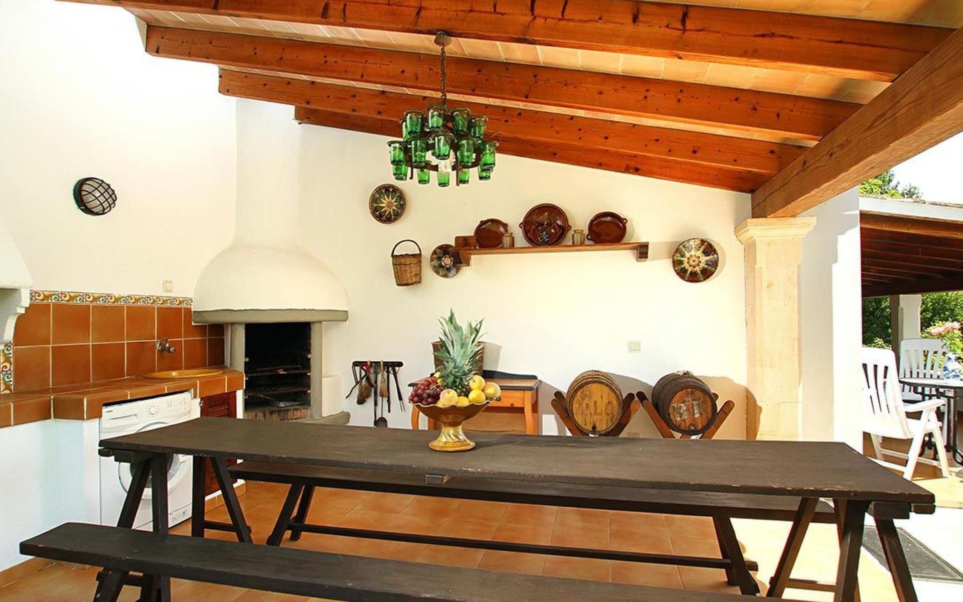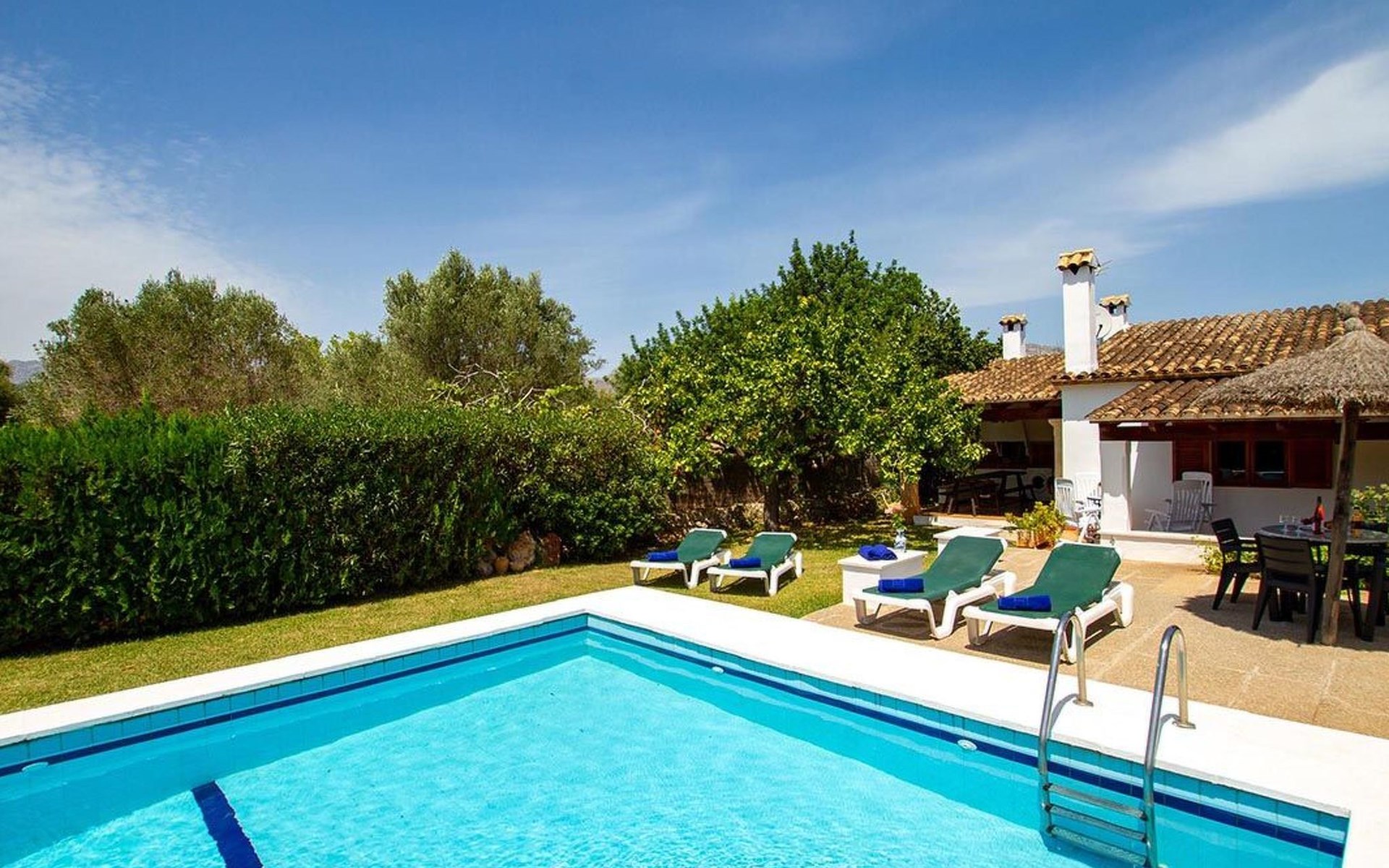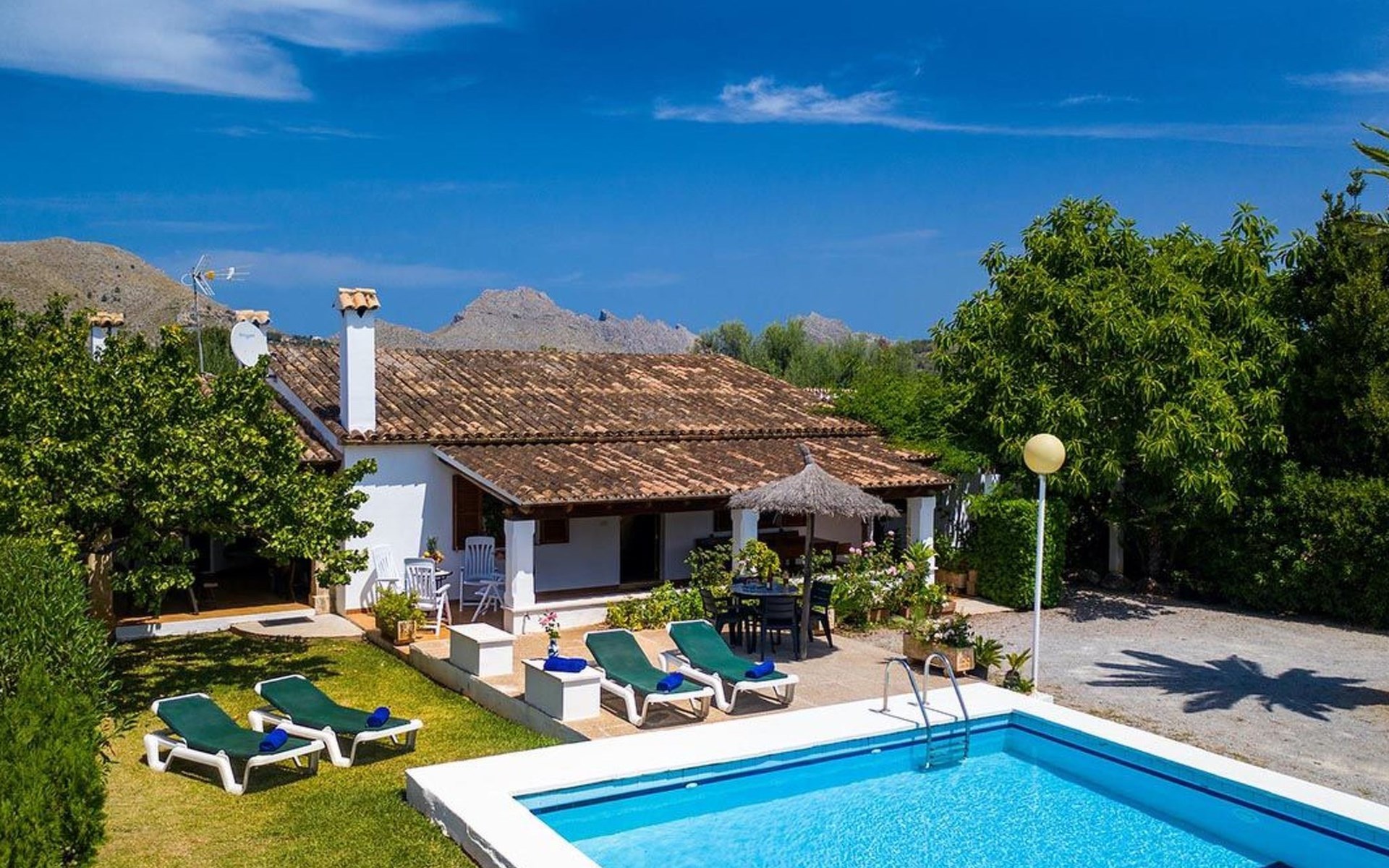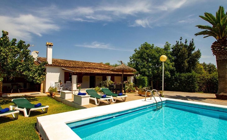 The living room is cosy, with traditional decor and features, including a wood-burning fireplace (purely ornamental). The kitchen is open plan and fully equipped. A hallway from the living room leads to the bedrooms, one double and two singles, all bedrooms share two bathrooms. The large terrace at the front of the villa is a great place to relax and escape the midday heat, overlooking the fabulous pool area with the large material barbecue to one side. The property has 3 bedrooms (all with A/C) and 2 bathrooms.