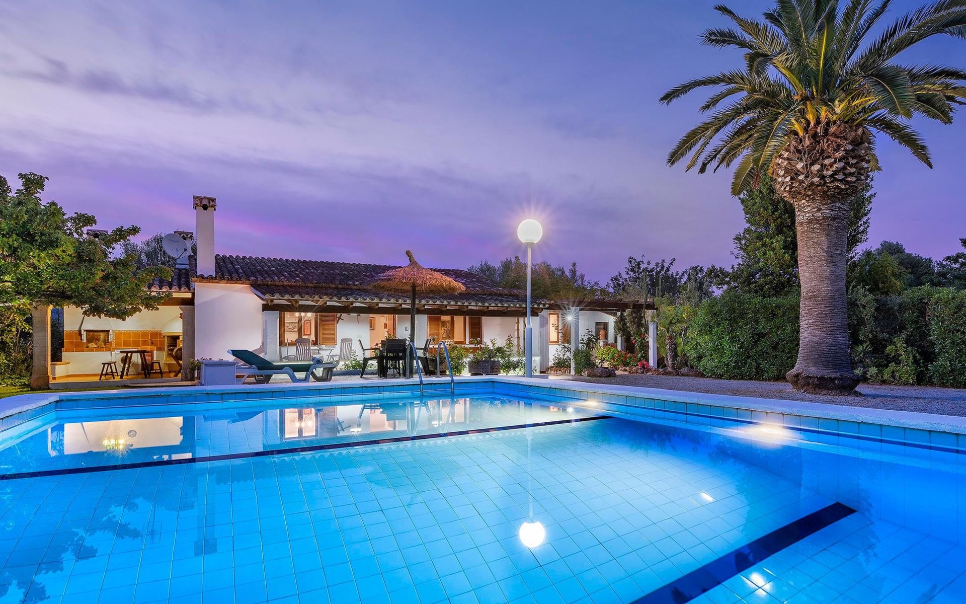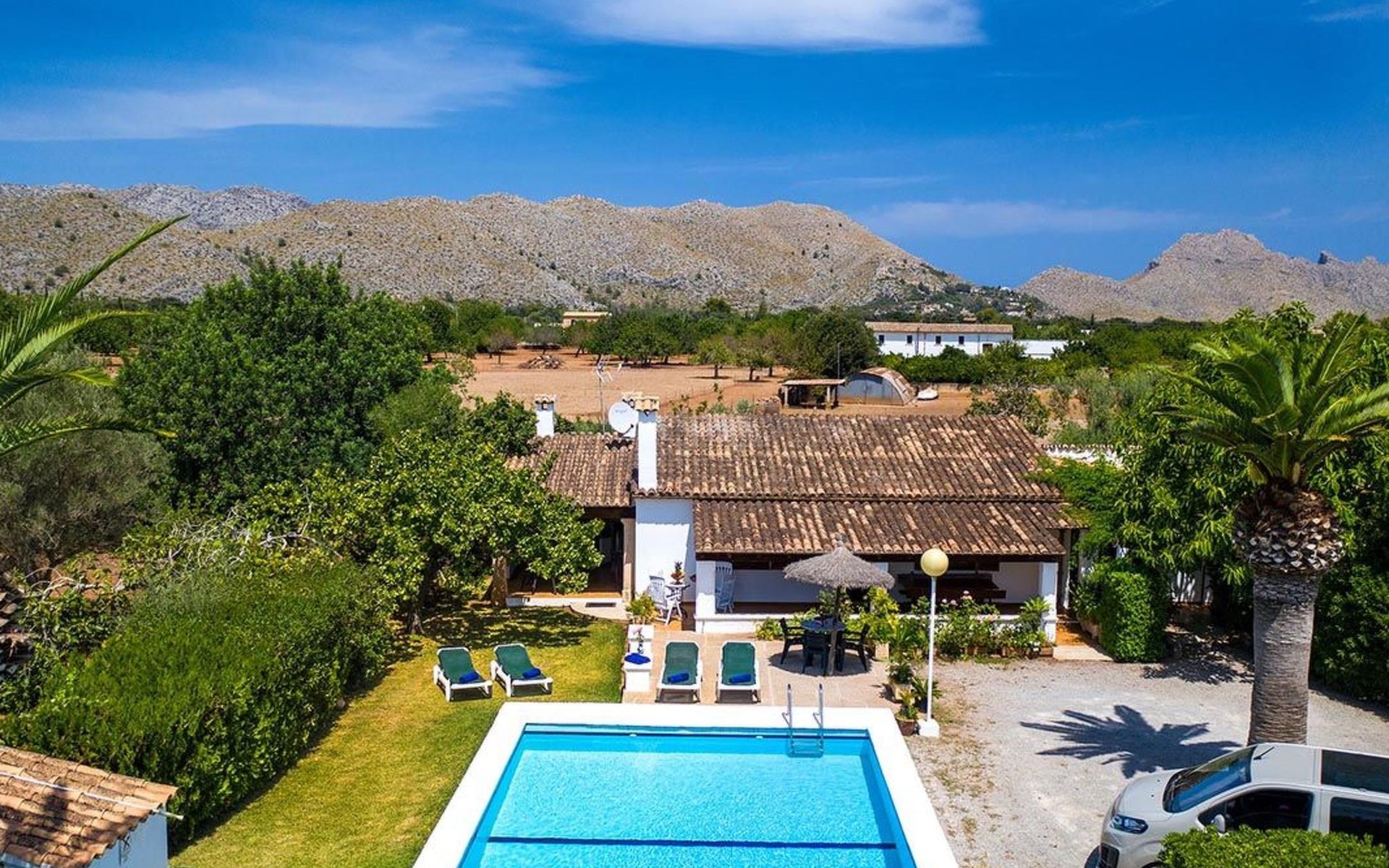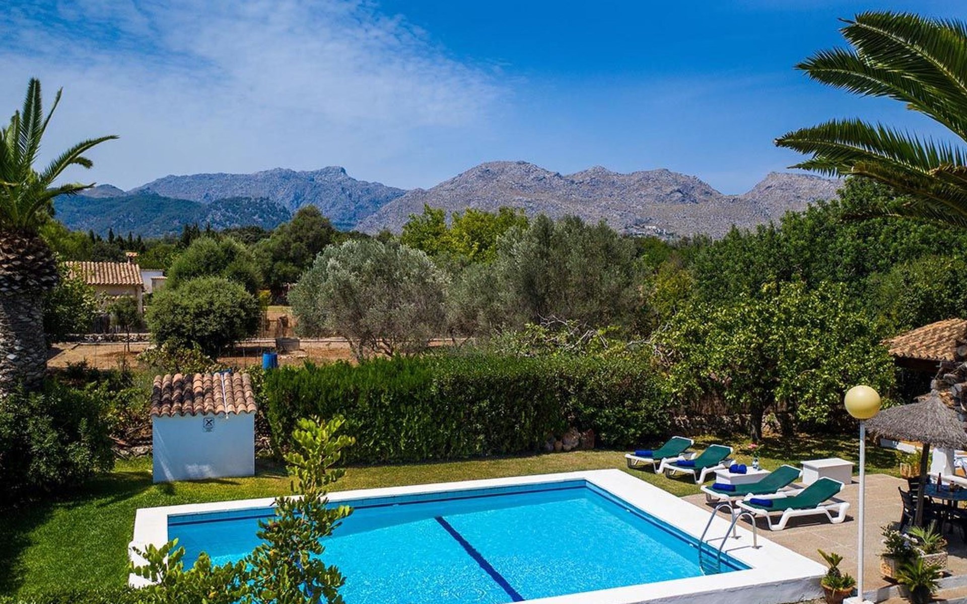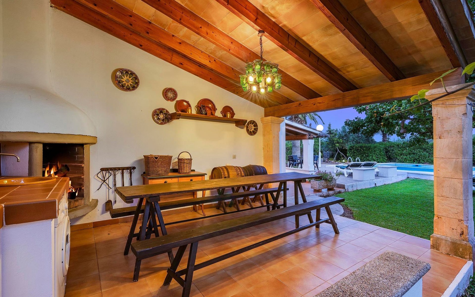 The living room is cosy, with traditional decor and features, including a wood-burning fireplace (purely ornamental). The kitchen is open plan and fully equipped. A hallway from the living room leads to the bedrooms, one double and two singles, all bedrooms share two bathrooms. The large terrace at the front of the villa is a great place to relax and escape the midday heat, overlooking the fabulous pool area with the large material barbecue to one side. The property has 3 bedrooms (all with A/C) and 2 bathrooms.