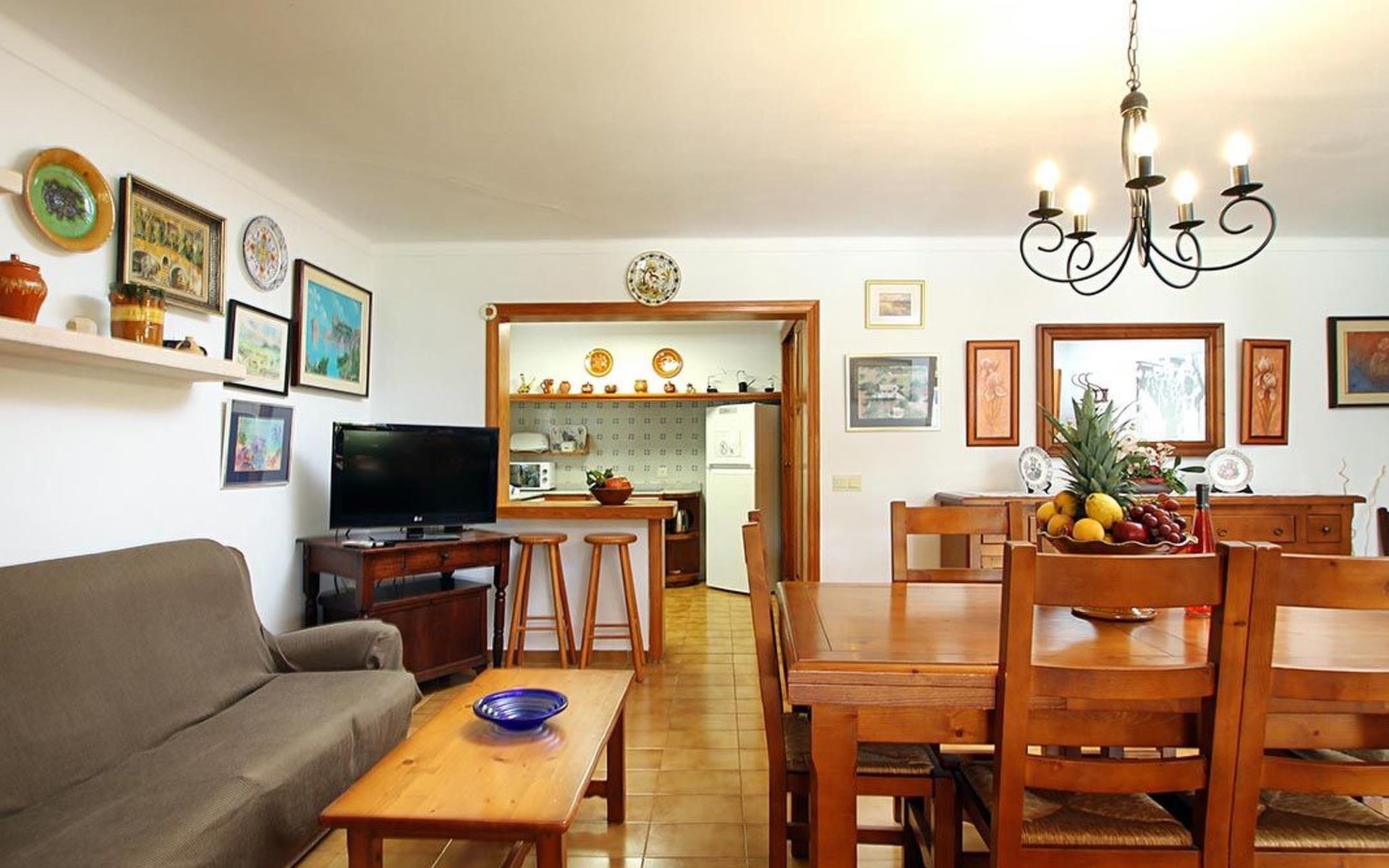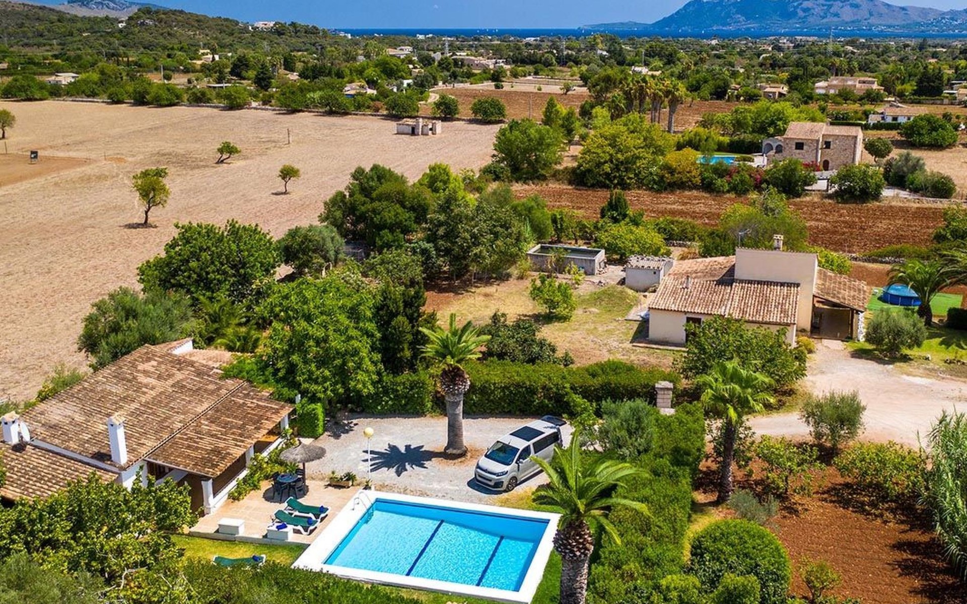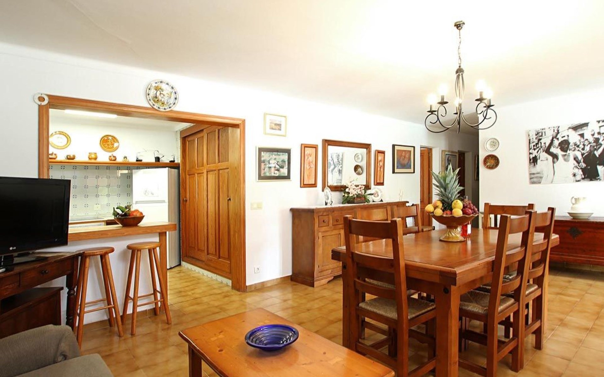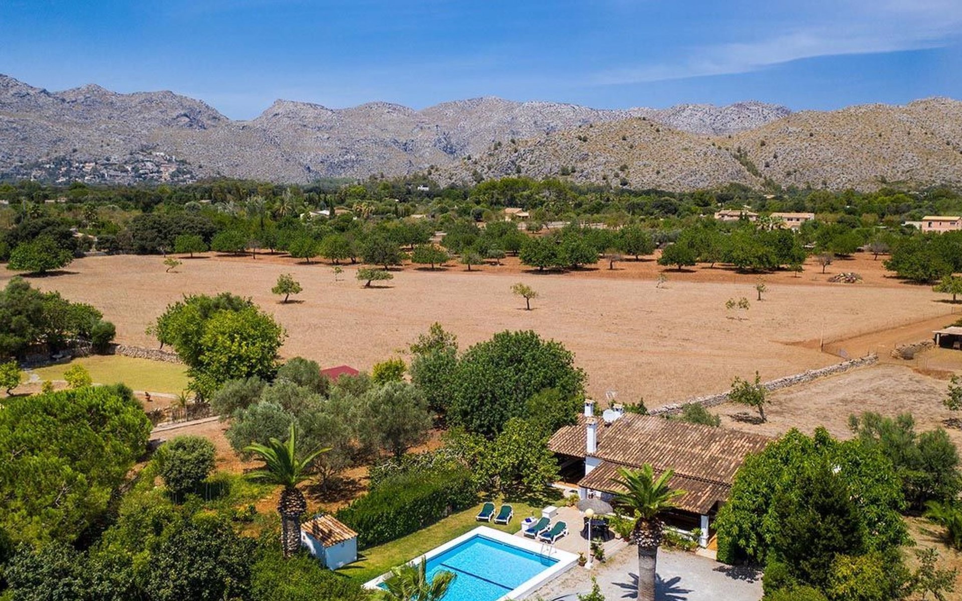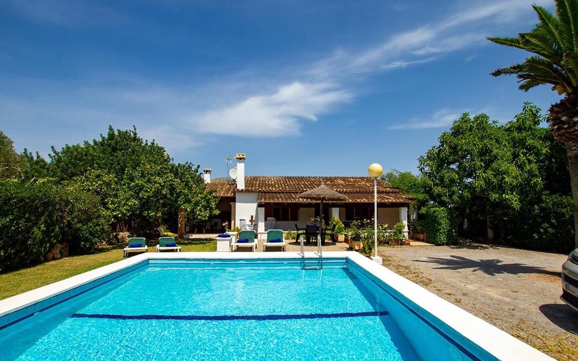 The living room is cosy, with traditional decor and features, including a wood-burning fireplace (purely ornamental). The kitchen is open plan and fully equipped. A hallway from the living room leads to the bedrooms, one double and two singles, all bedrooms share two bathrooms. The large terrace at the front of the villa is a great place to relax and escape the midday heat, overlooking the fabulous pool area with the large material barbecue to one side. The property has 3 bedrooms (all with A/C) and 2 bathrooms.