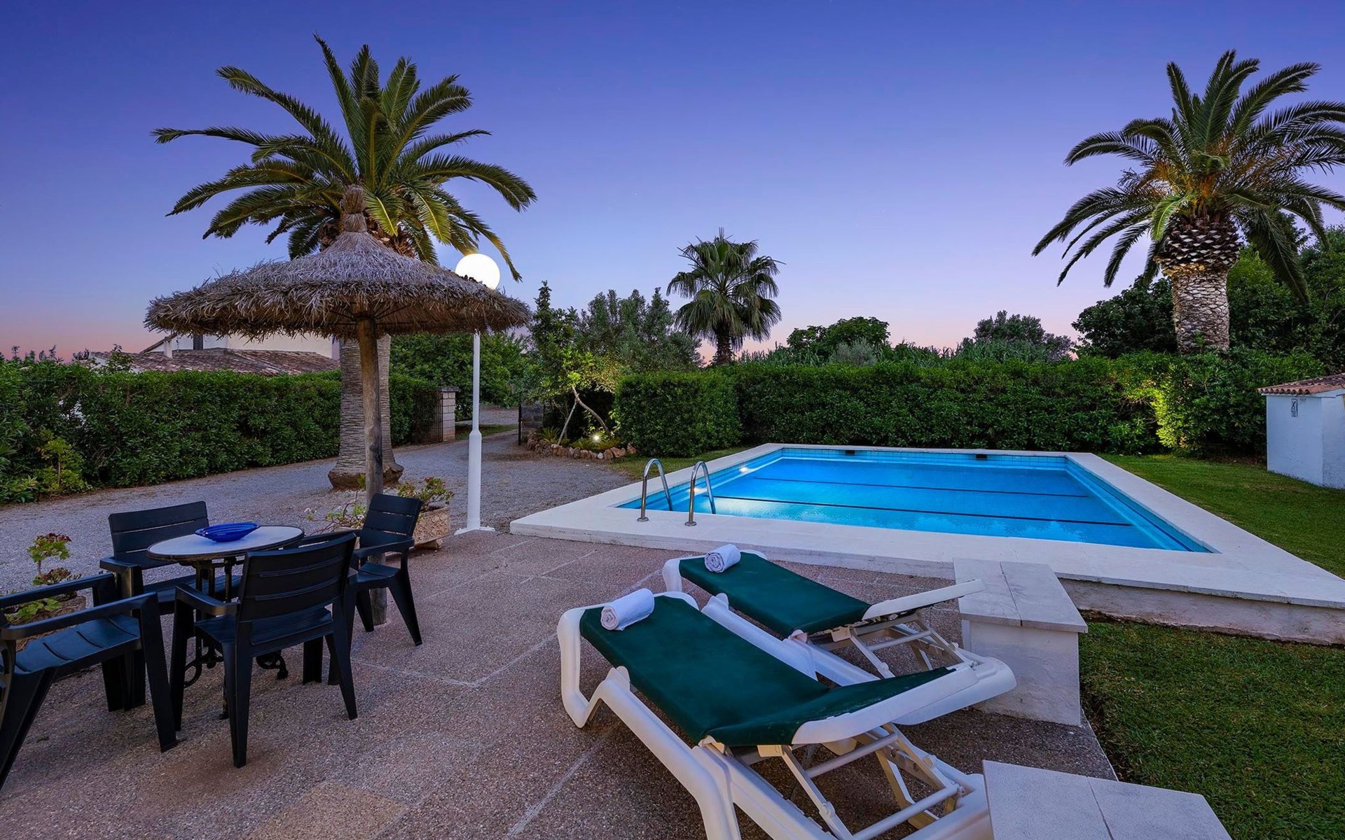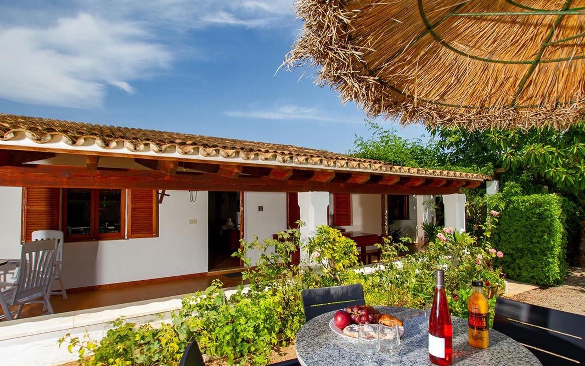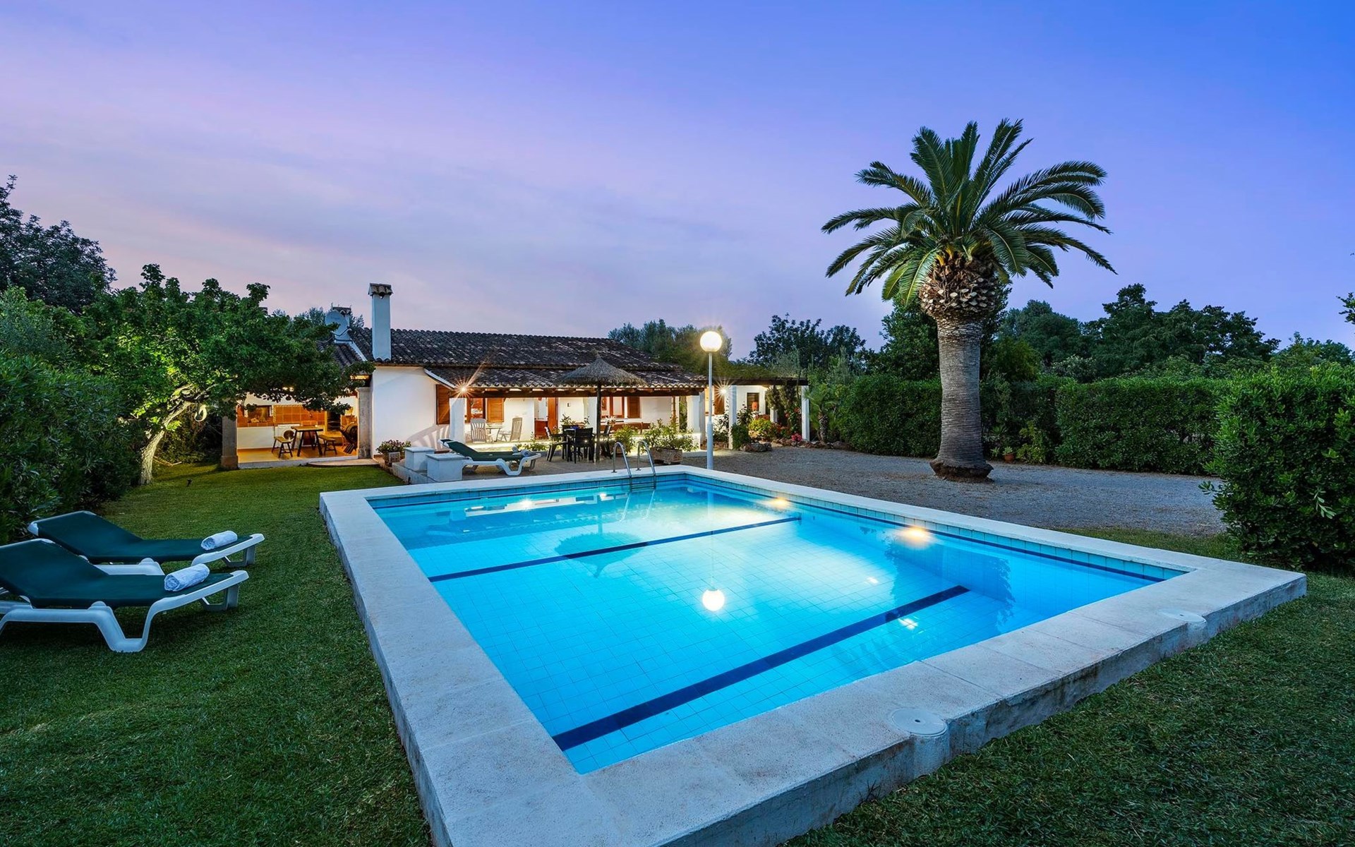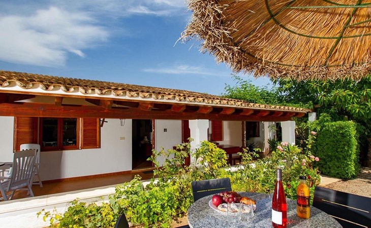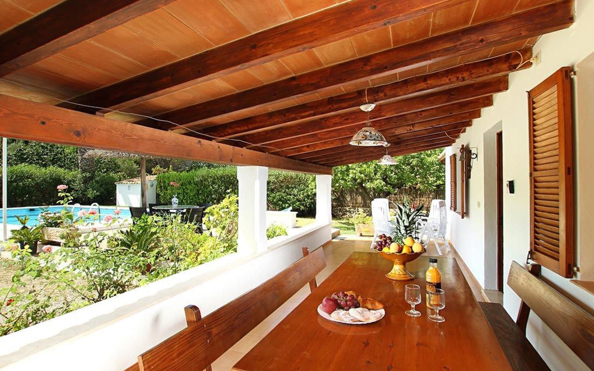 The living room is cosy, with traditional decor and features, including a wood-burning fireplace (purely ornamental). The kitchen is open plan and fully equipped. A hallway from the living room leads to the bedrooms, one double and two singles, all bedrooms share two bathrooms. The large terrace at the front of the villa is a great place to relax and escape the midday heat, overlooking the fabulous pool area with the large material barbecue to one side. The property has 3 bedrooms (all with A/C) and 2 bathrooms.