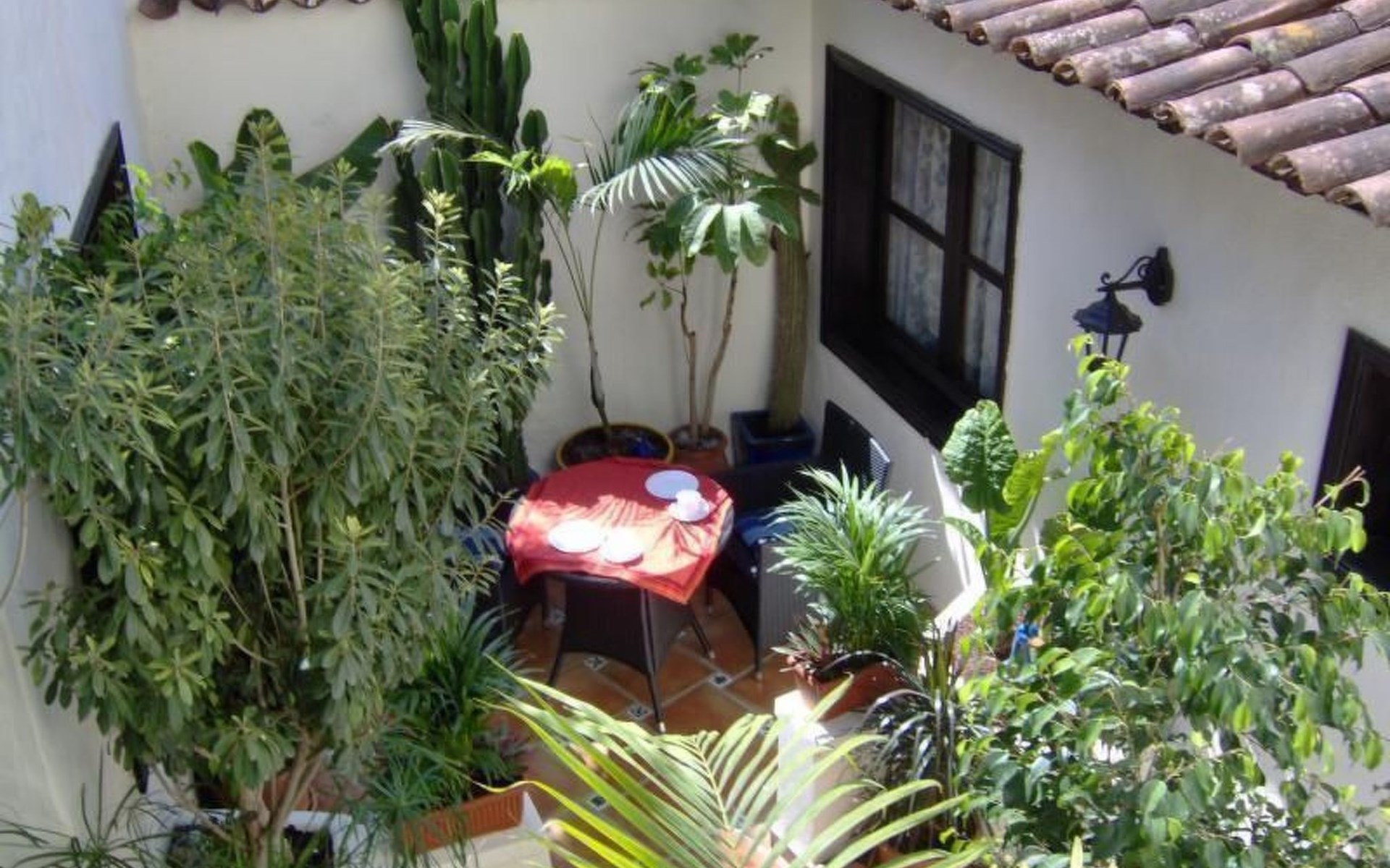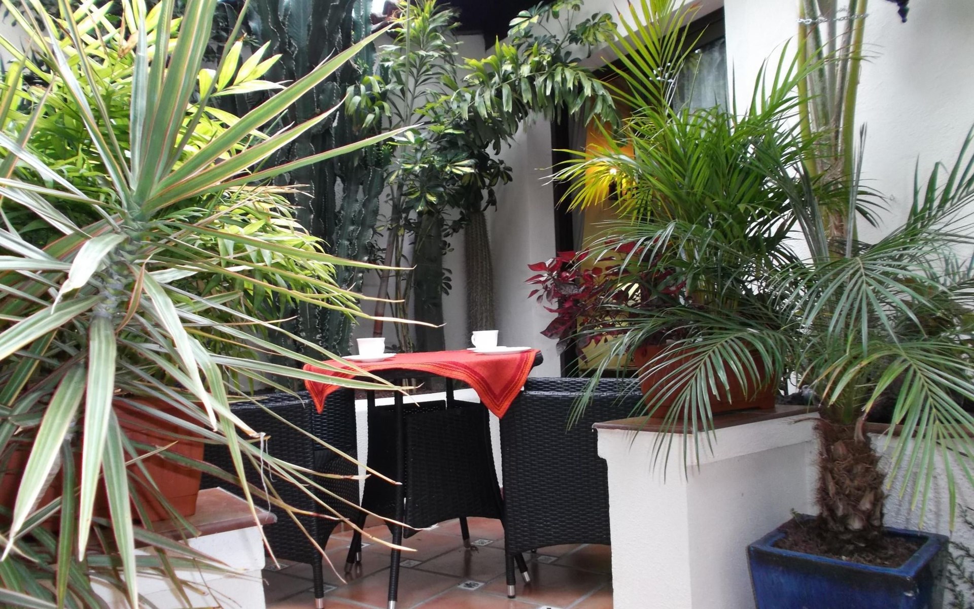 Flat 1 with patio-terrace: Spacious flat in rustic Spanish style. Kitchen, comfortable living room with dining area, tasteful bedroom, wonderful seating area on the lovingly designed patio or on the sun terrace and of course digital satellite TV (German & local). The flat is located on the ground floor, bedroom window quietly facing the inner courtyard. The small living room window offers a partial sea view and faces the main road.