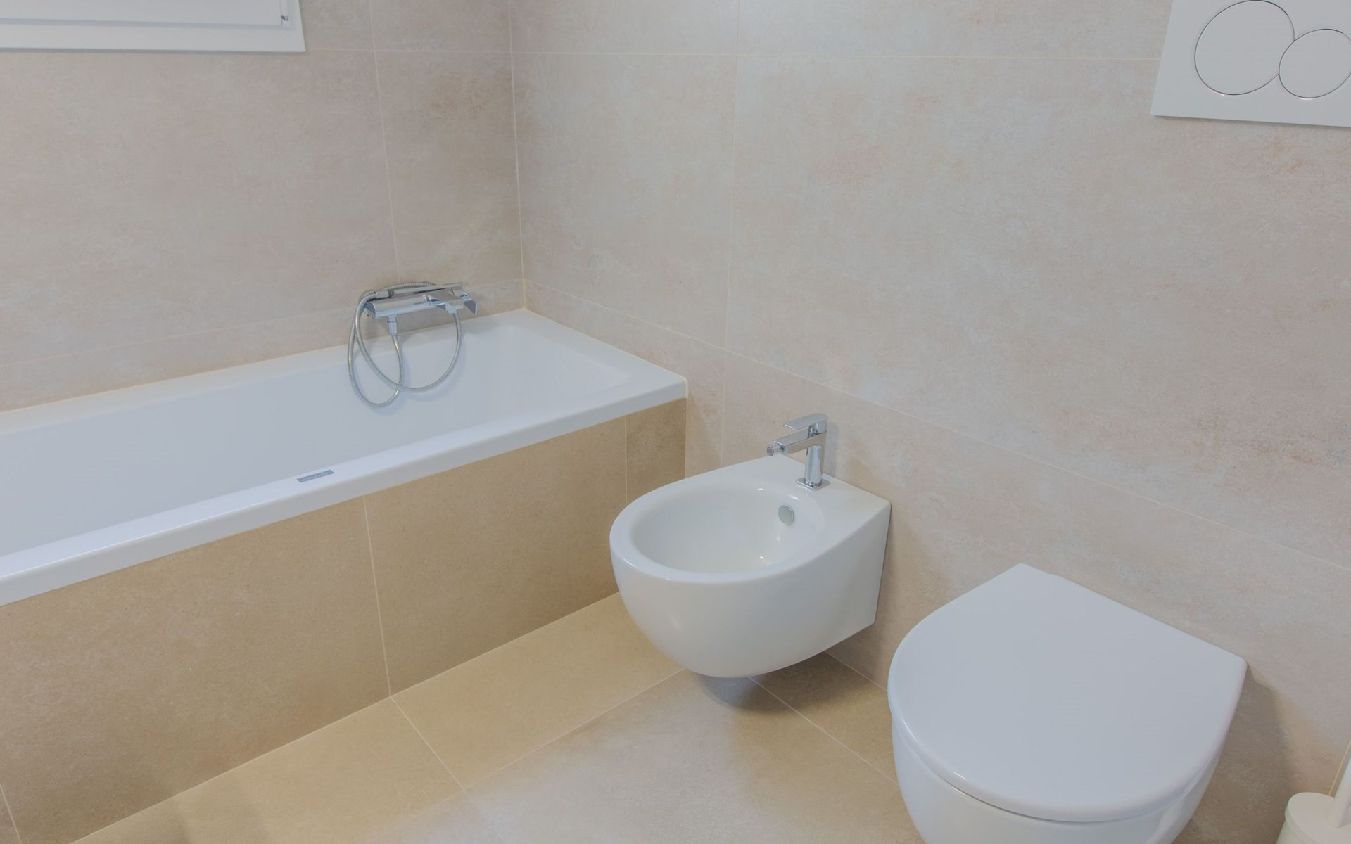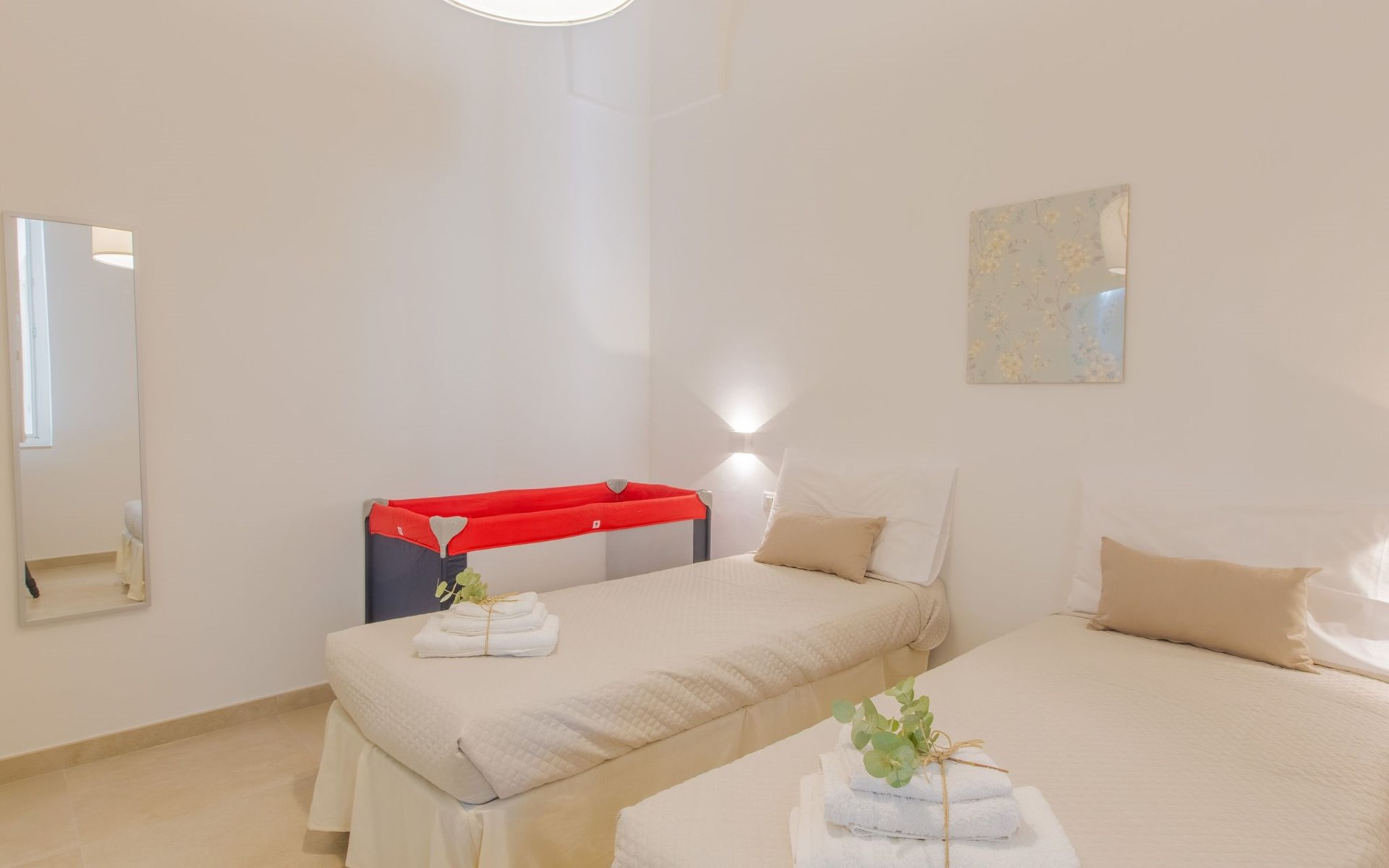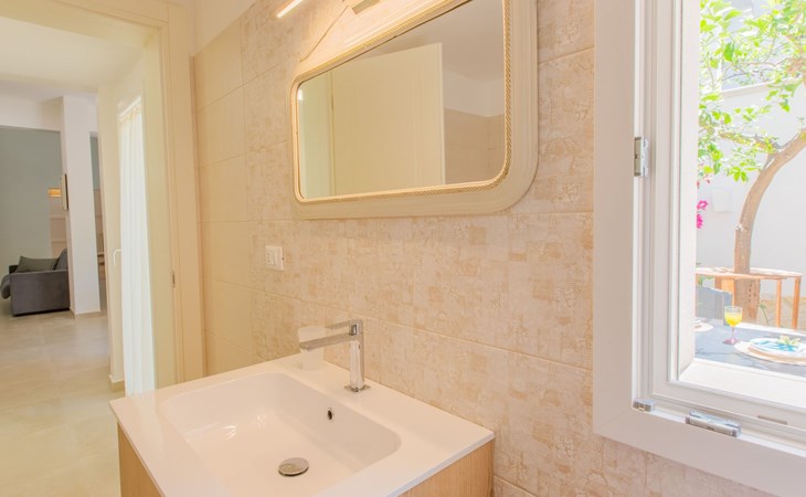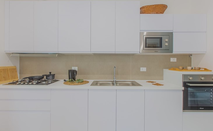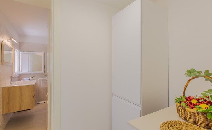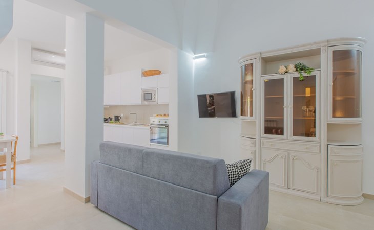 n.1 double bedroom, n.1 bedroom with two single beds that can be joined together and a window overlooking the living room, n.1 living room with kitchenette and double sofa bed, n.1 bathroom with bathtub, n.1 bathroom with shower, n.1 entrance hall. A cot is offered on request.