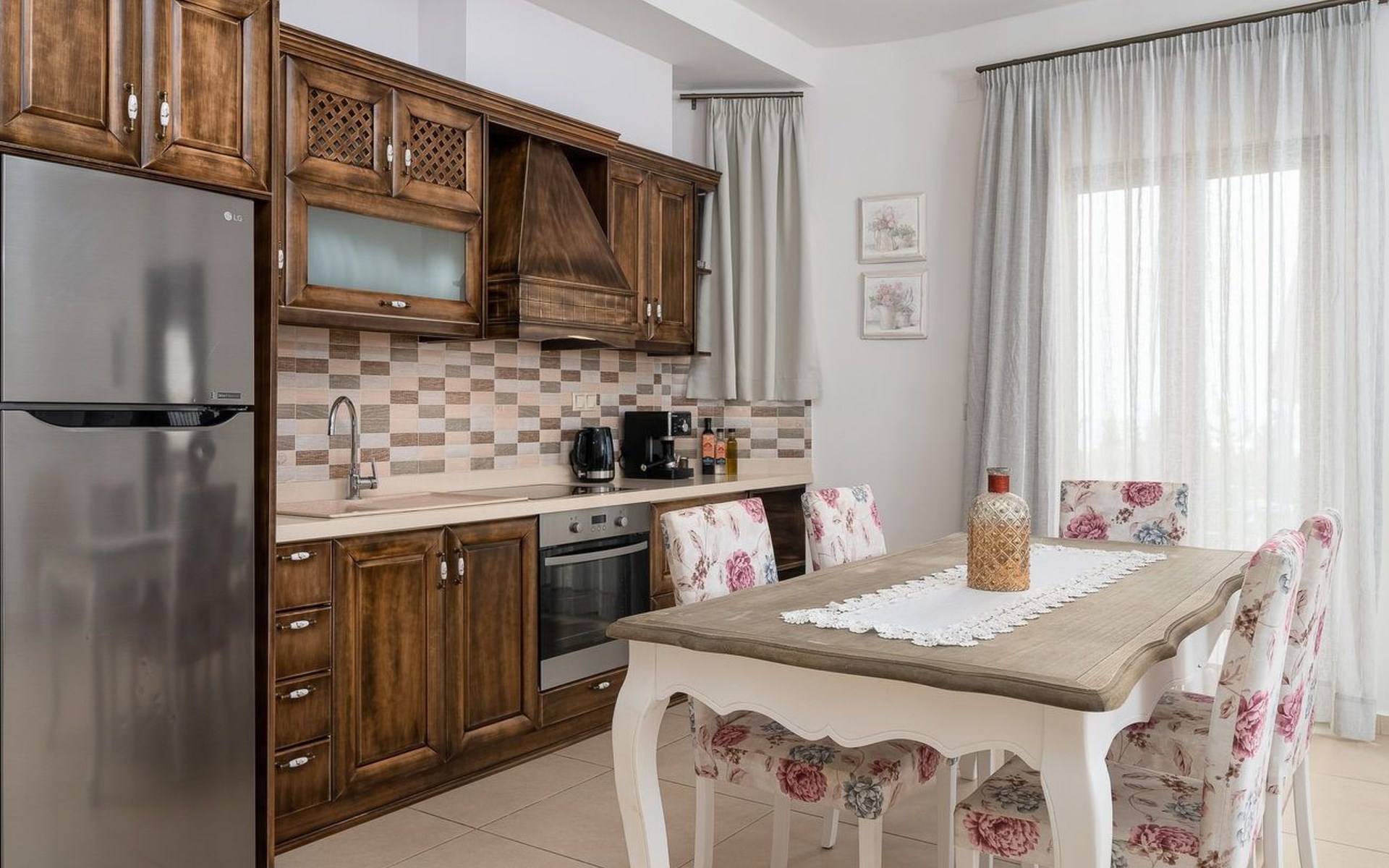 The flat has a fully equipped kitchen with all modern appliances (electric hob with oven, extractor fan, fridge with integrated freezer, filter coffee and espresso machine, toaster, kettle, electric fruit juicer), together with crockery, glassware and cookware.