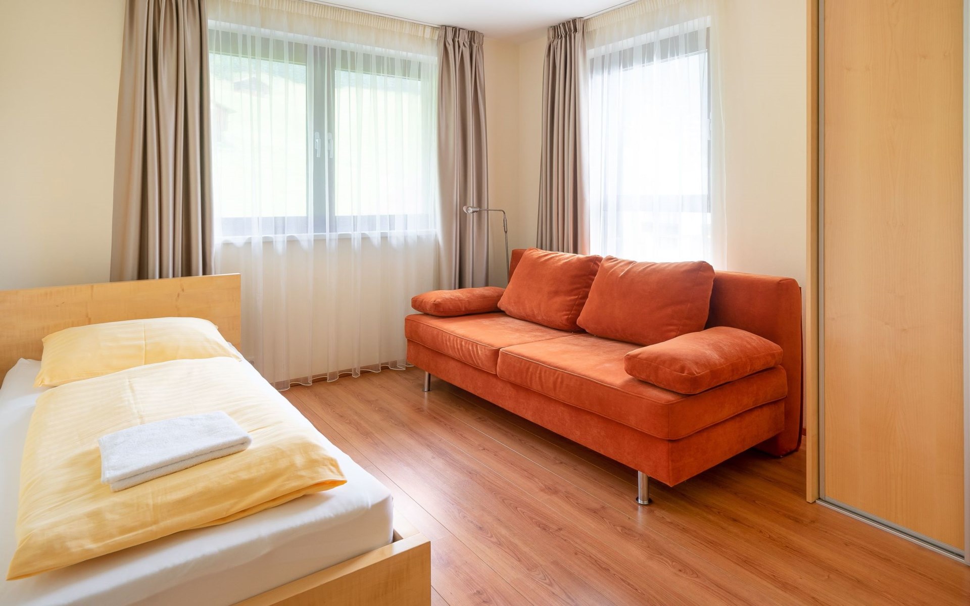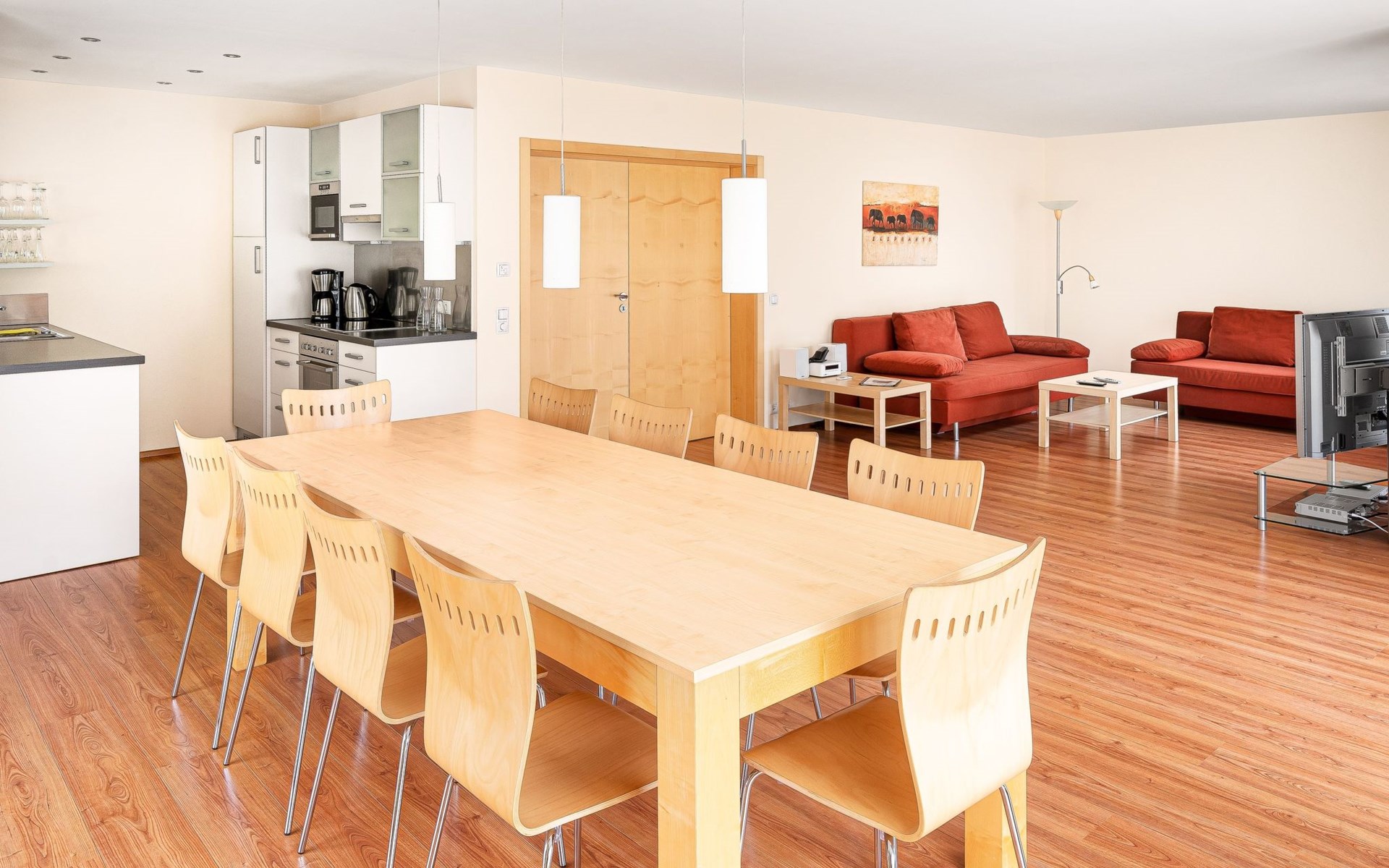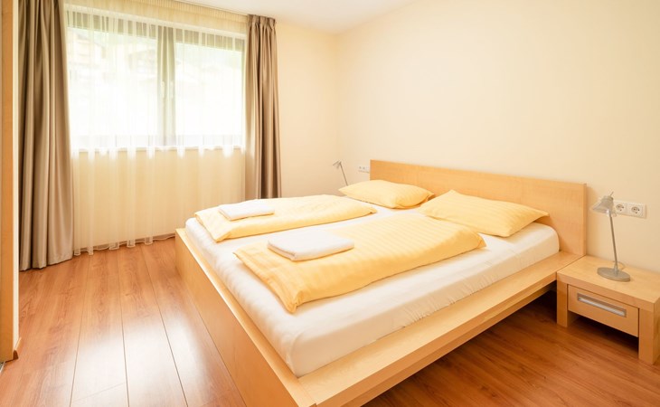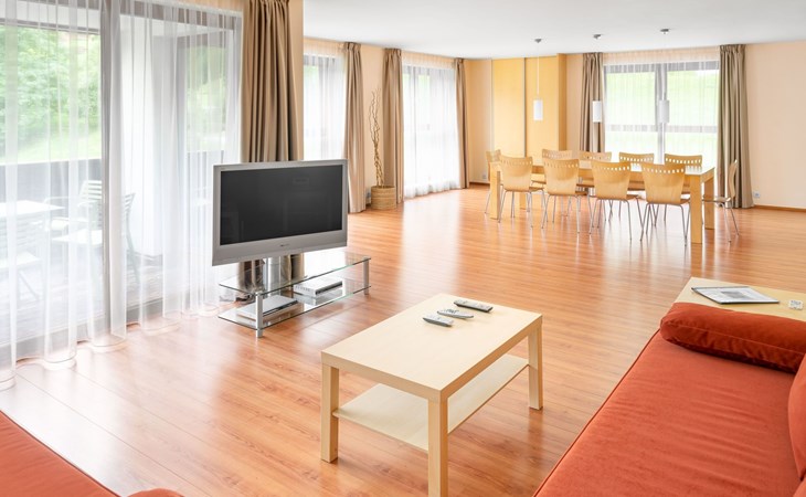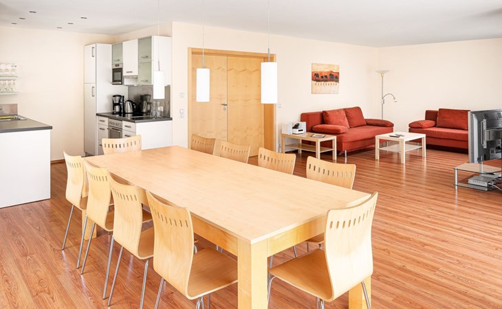 Type 4+: 5 - 10 persons (120 m²) with a living room/bedroom, 3 bedrooms, 2 bathrooms and storage room. The flat is suitable for allergy sufferers (all rooms with laminate flooring) and is generously proportioned and equipped with every comfort and has satellite TV, radio with CD player, DVD player, telephone and FREE internet connection (network/WLAN connection).