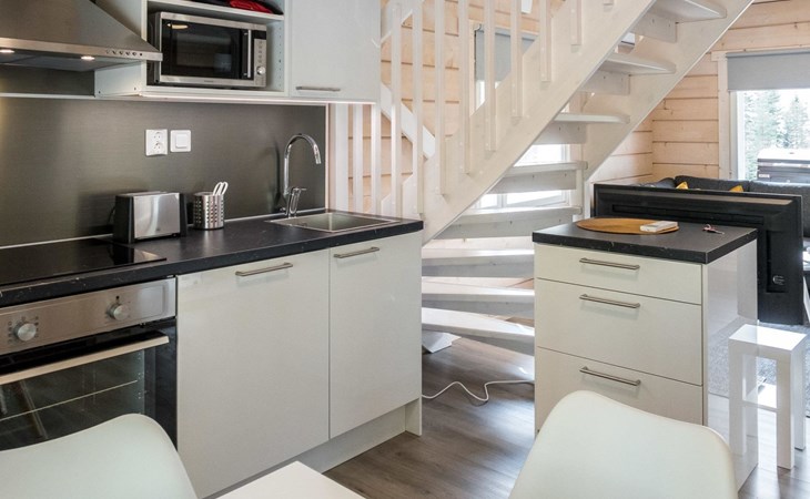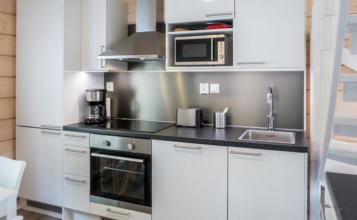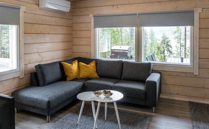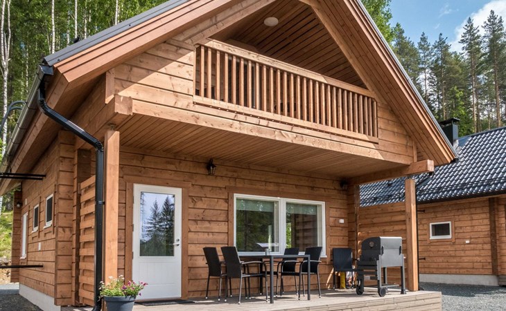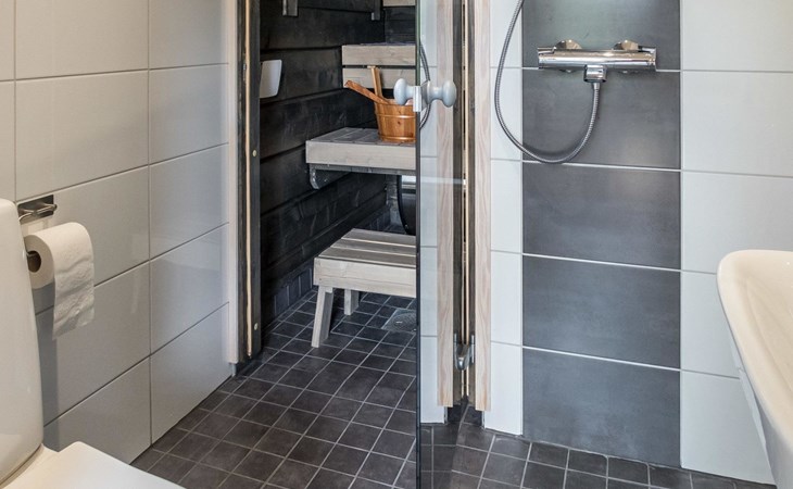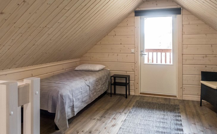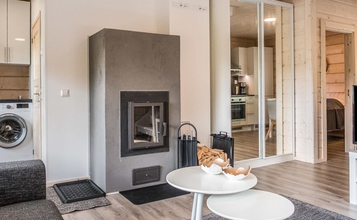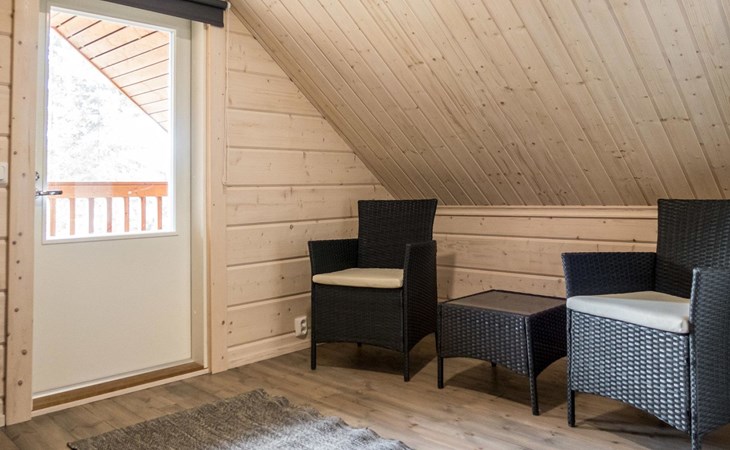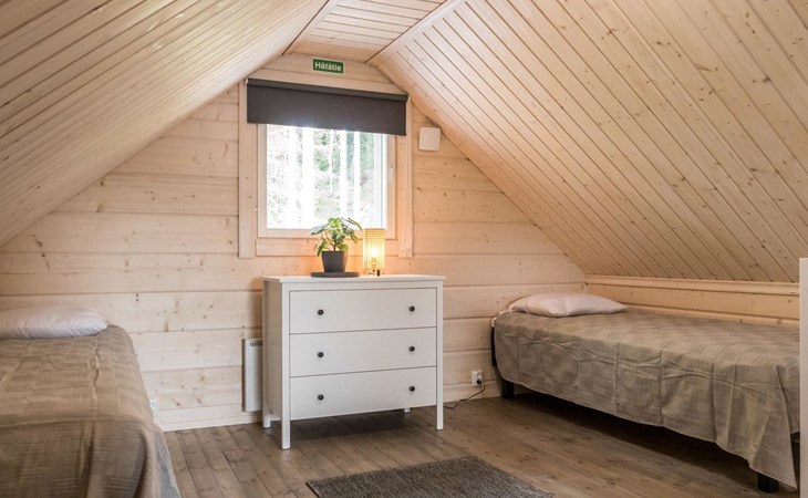 The living area of the cabin is 59 m², including the loft. Living room/kitchen, dining group for 5, heat storing fireplace. On the ground floor, bedroom with double bed, 3 x 80 cm wide beds in the loft. Washroom/WC, wood-burning sauna stove in the sauna.