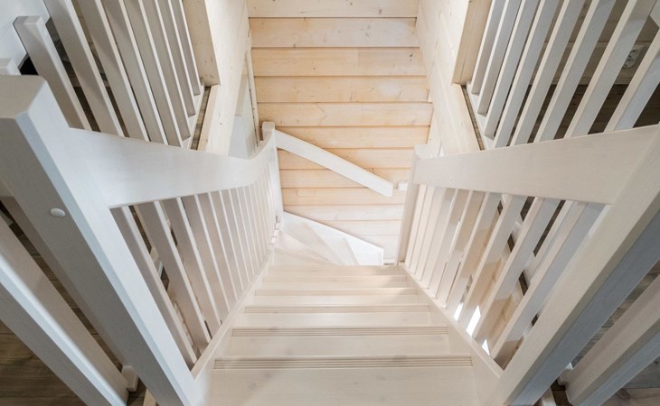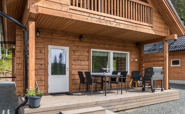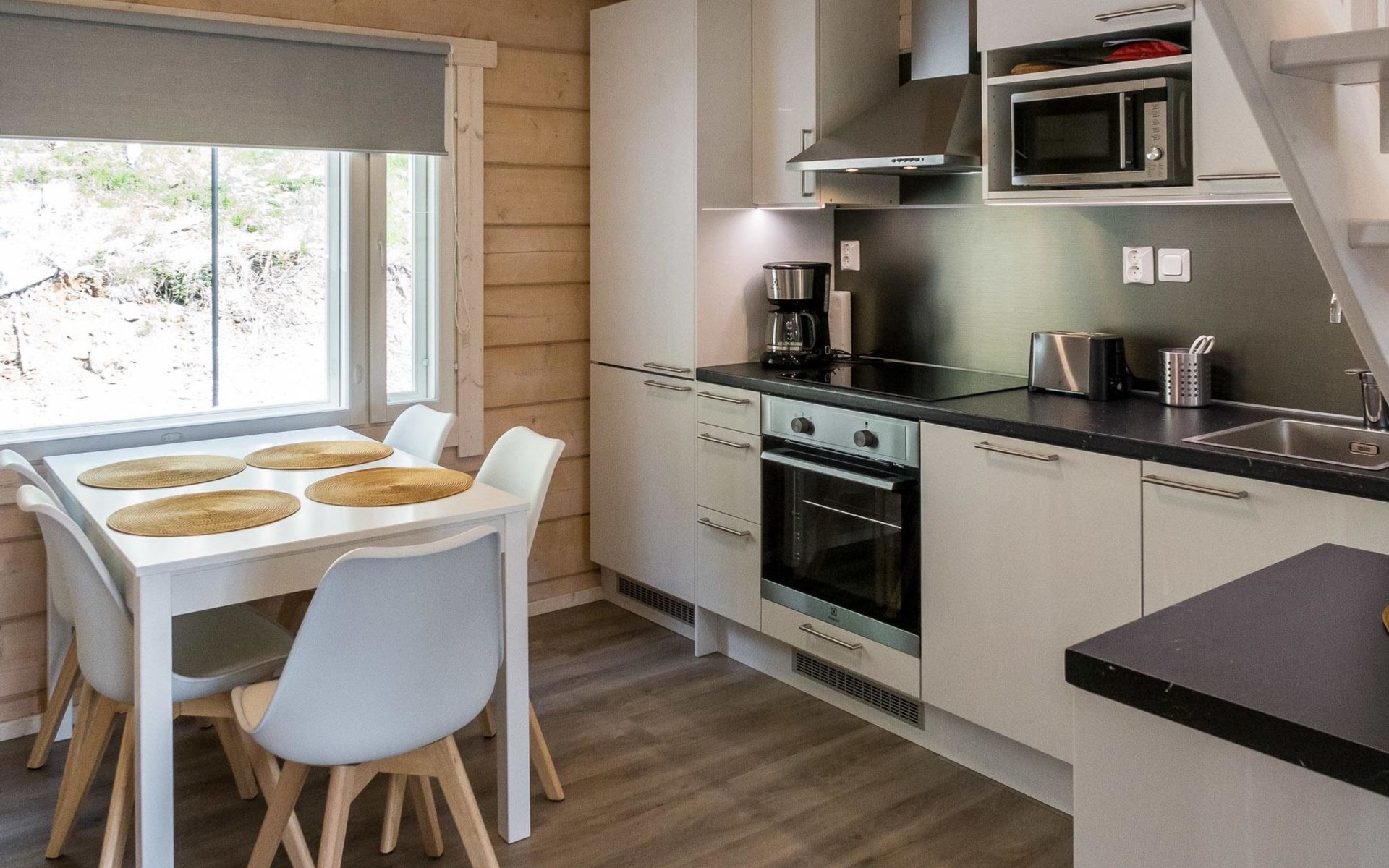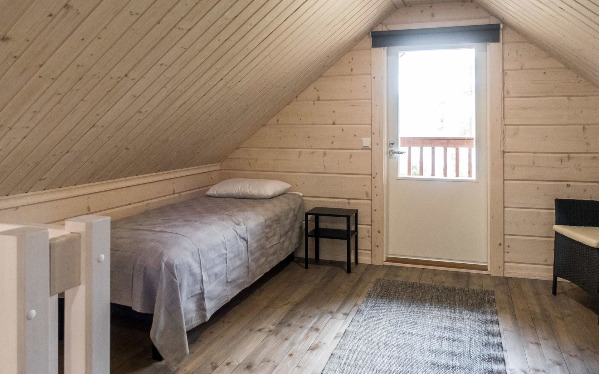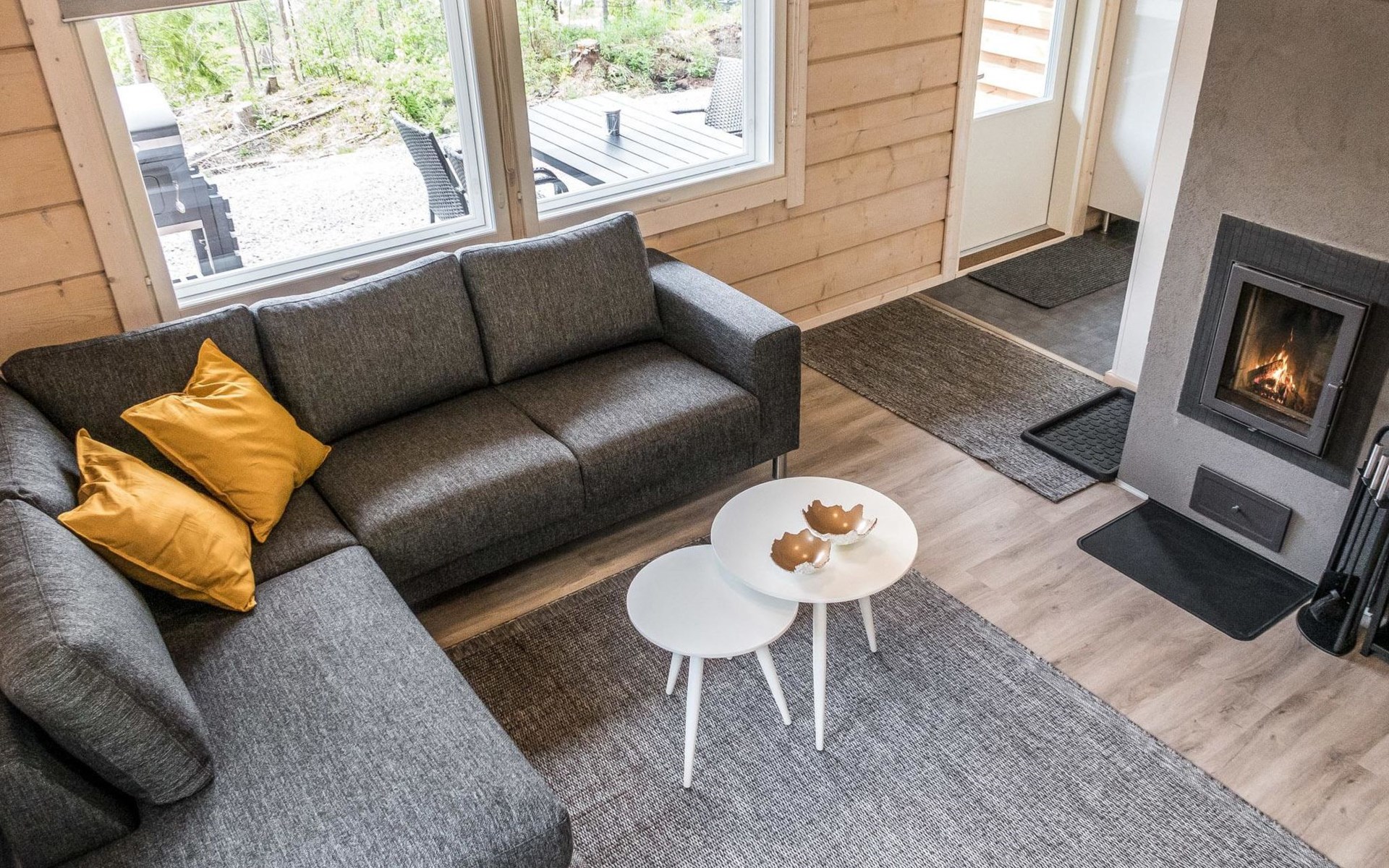 The living area of the cabin is 59 m², including the loft. Living room/kitchen, dining group for 5, heat storing fireplace. On the ground floor, bedroom with double bed, 3 x 80 cm wide beds in the loft. Washroom/WC, wood-burning sauna stove in the sauna.