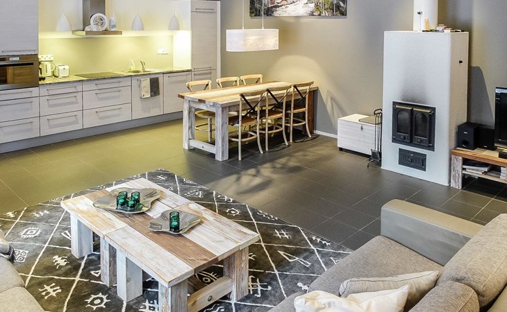 78 km east of Kemijärvi, in Sallatunturi holiday resort area. A log cabin apartment, built in 2011, in a house with 4 apartments. Kitchen-living room, 3 bedrooms each with 2 beds made already, shower room, electric sauna (renewed in 2023) stove), laundry room, 2 toilets (one with shower), hall, porch.