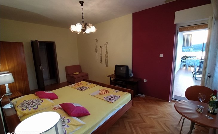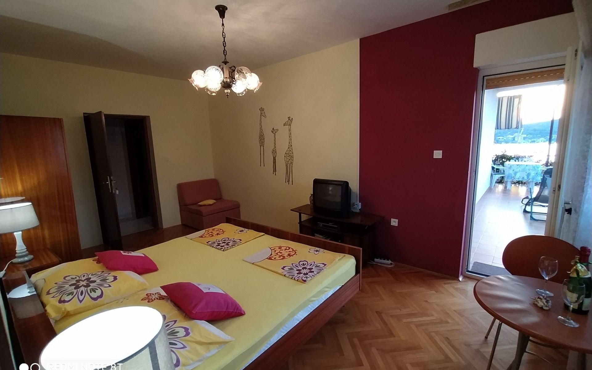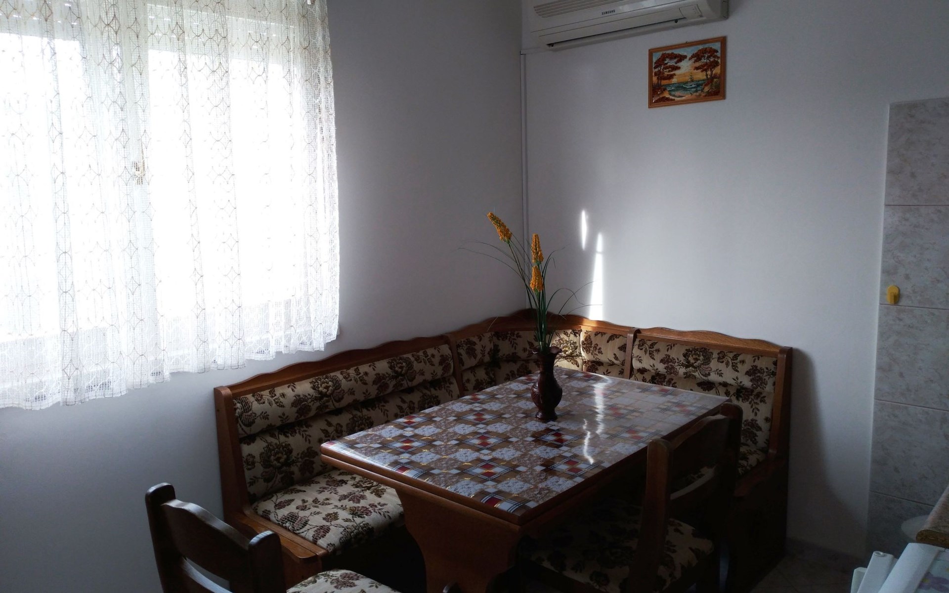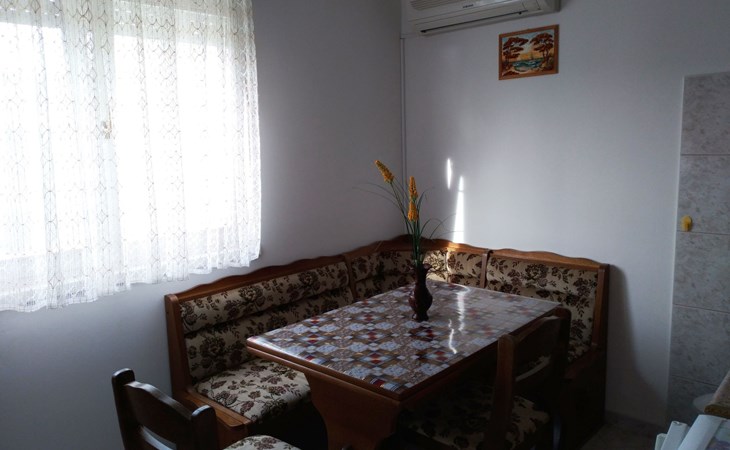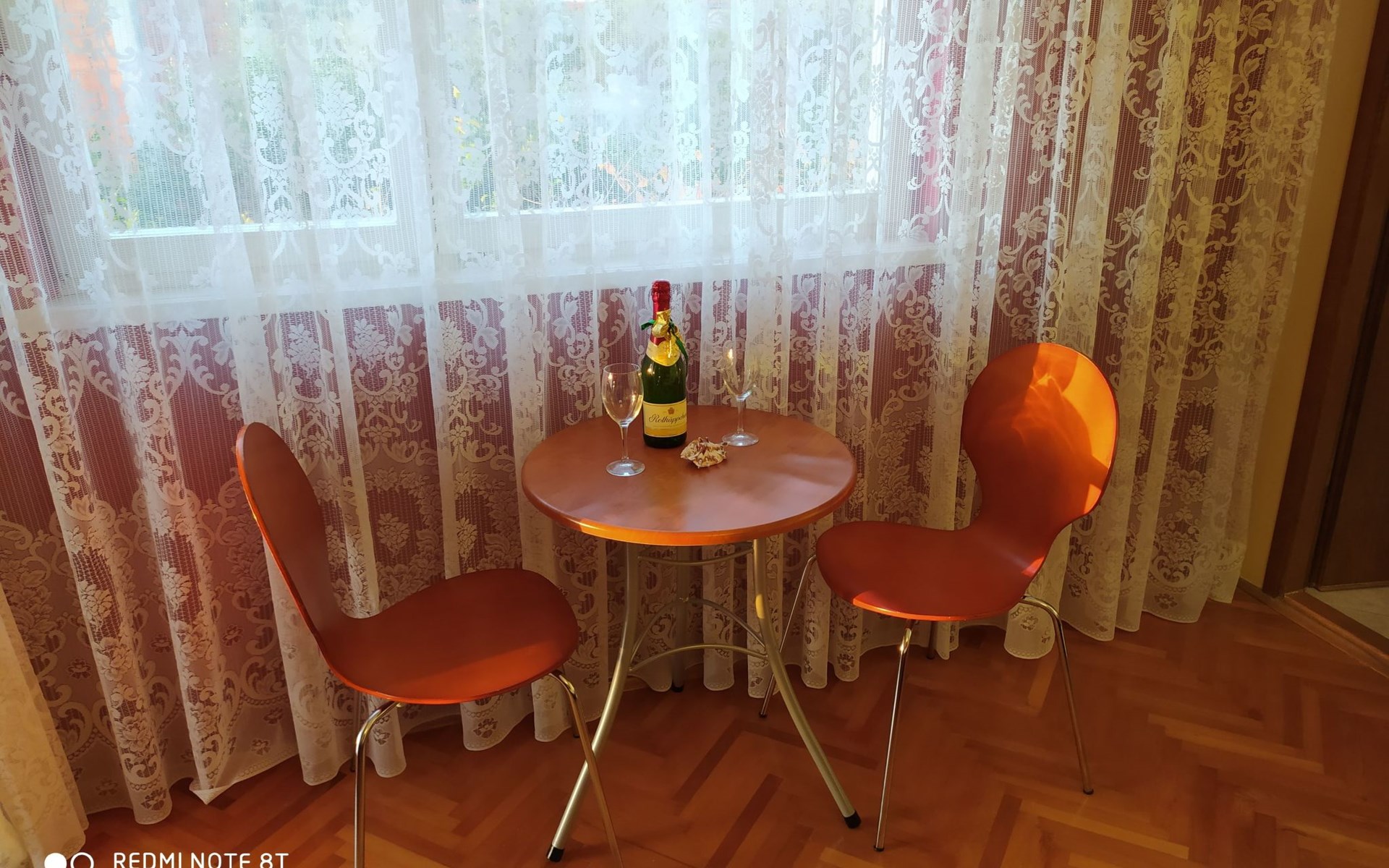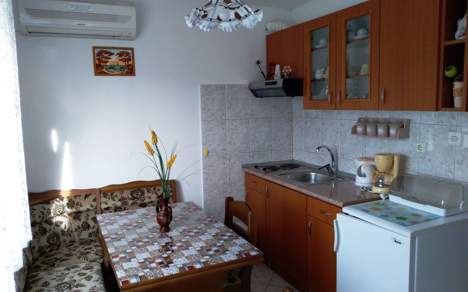 Inside, the apartment boasts a well-appointed living room-kitchen area. Here, guests can find a cozy corner bench and table set against a fully equipped kitchen unit. Culinary enthusiasts will appreciate the inclusion of a hob, toaster, fridge, and coffee machine, perfect for preparing delicious meals during your stay. The bedroom is a comforting retreat featuring a double bed and a sofa bed to accommodate various sleeping arrangements. Additionally, you'll find a TV for entertainment and a small table with two chairs, ensuring a comfortable and enjoyable indoor experience.