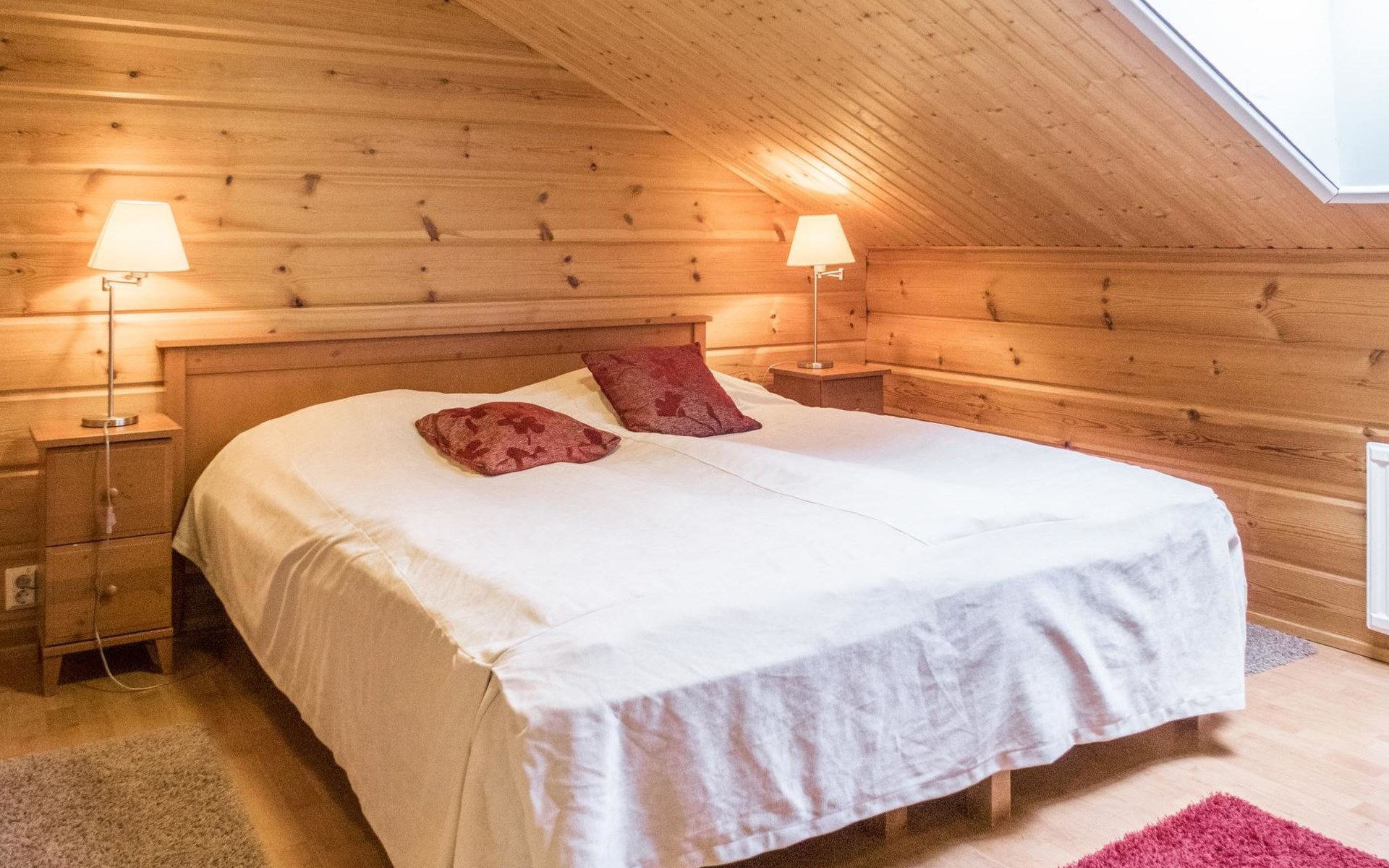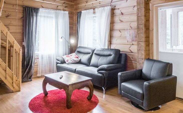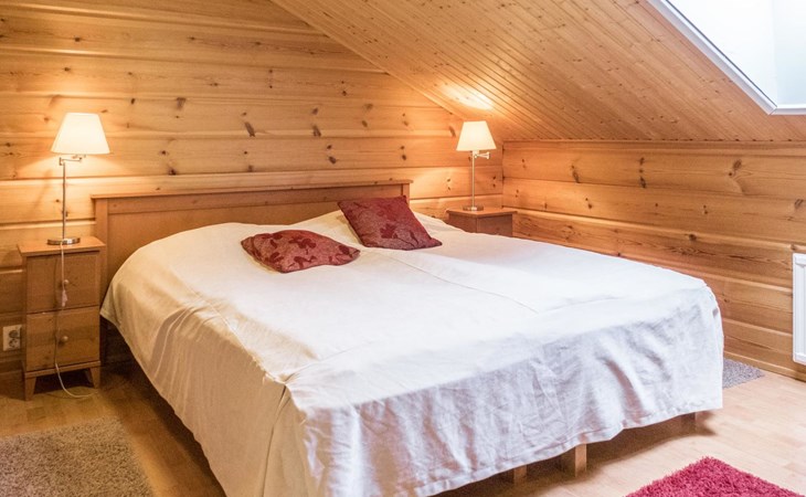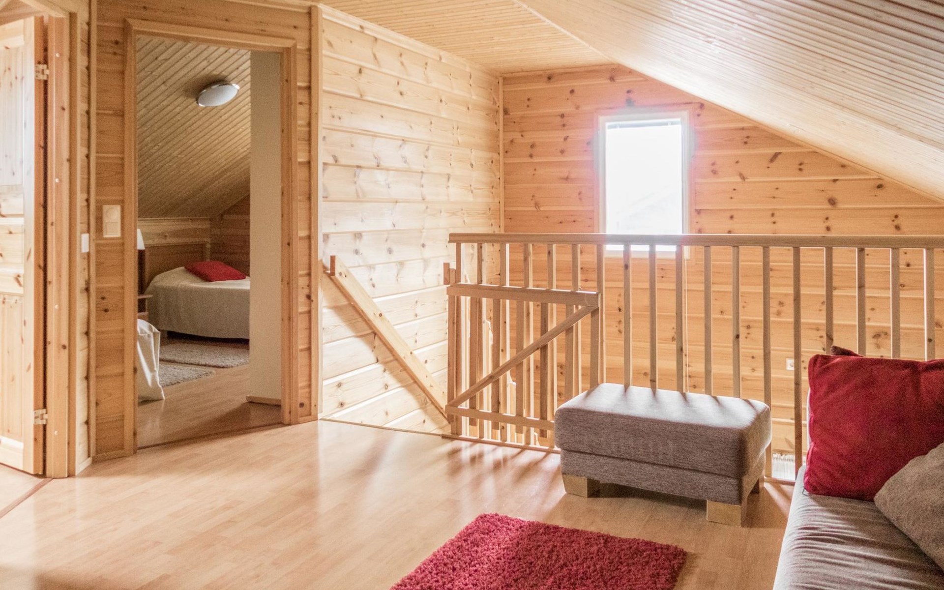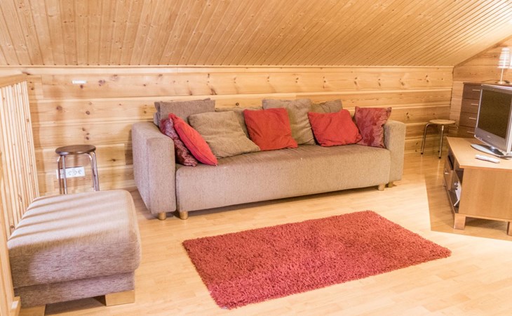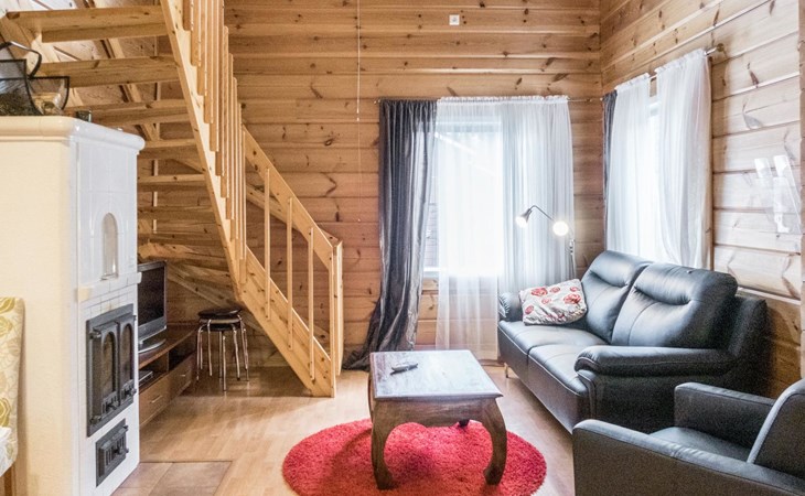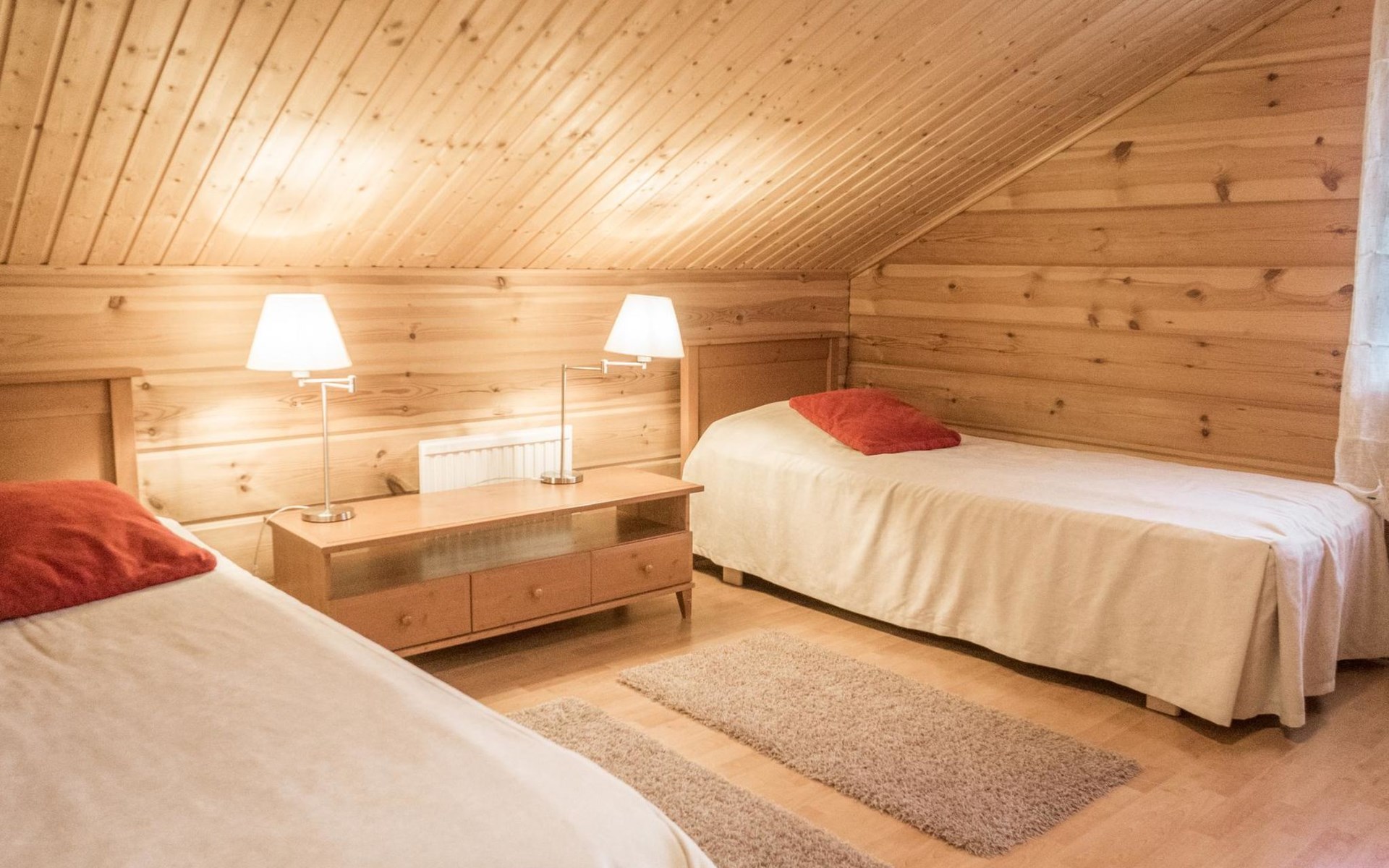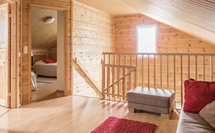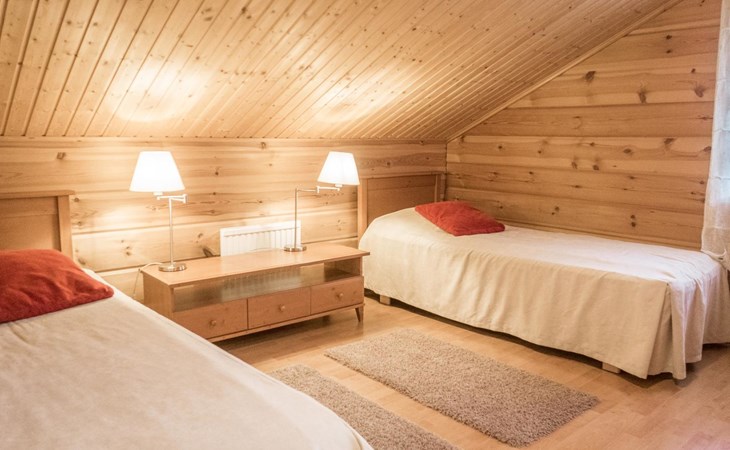 Floor area 84.5m². On the ground floor there is combined living room & kitchen, bedroom with twin bed, sauna (electric heating), washroom and toilet. Upstairs there is sofabed for two persons and two bedrooms, both with separate beds for two, shower/toilet.
