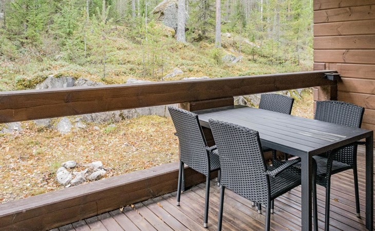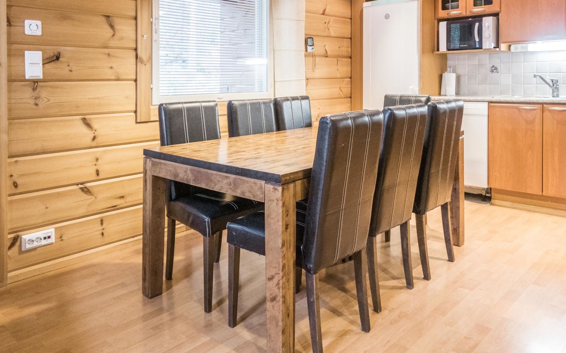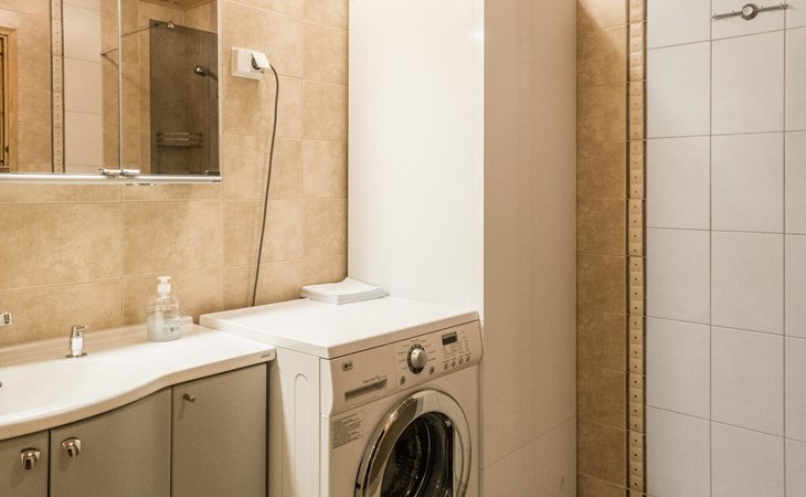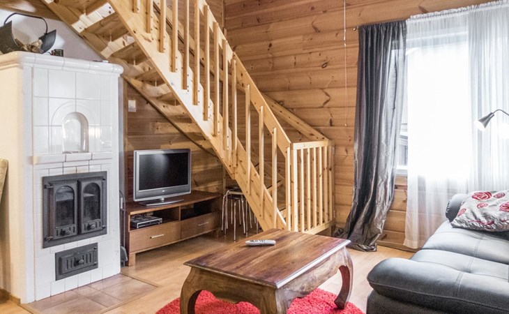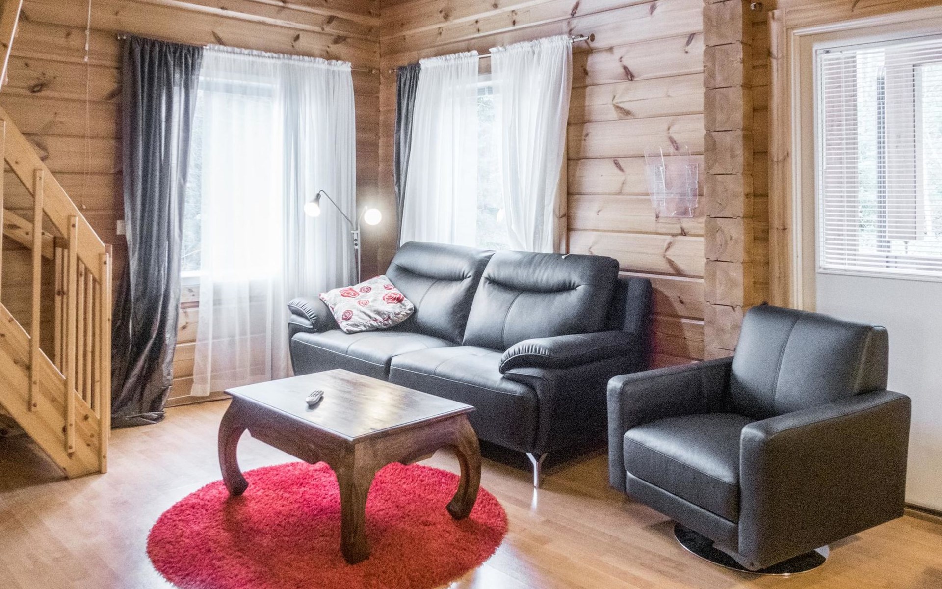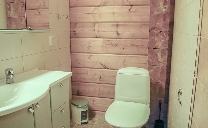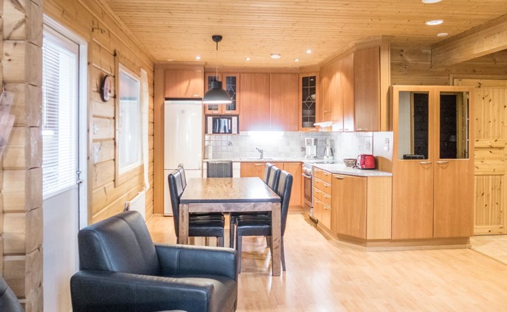 Floor area 84.5m². On the ground floor there is combined living room & kitchen, bedroom with twin bed, sauna (electric heating), washroom and toilet. Upstairs there is sofabed for two persons and two bedrooms, both with separate beds for two, shower/toilet.