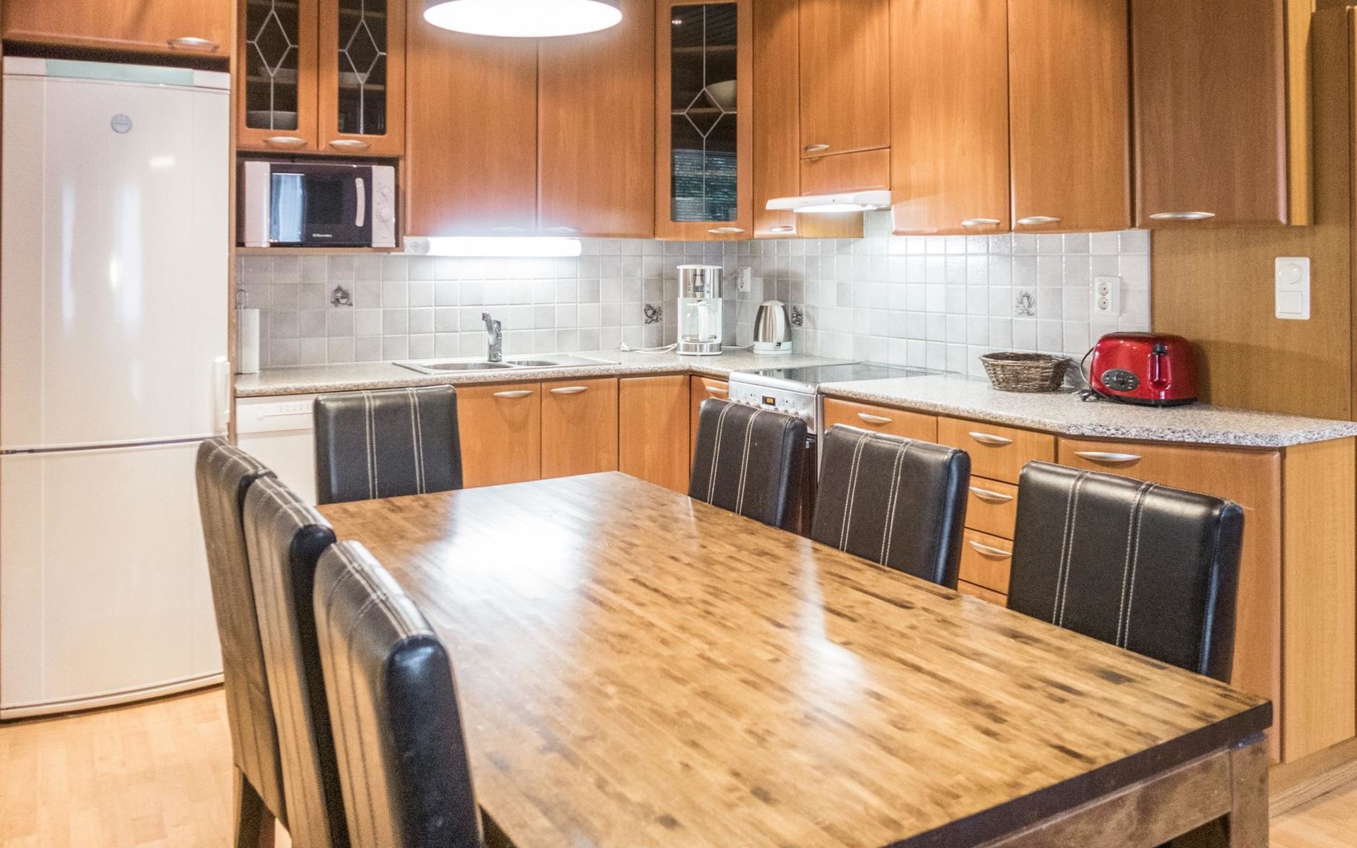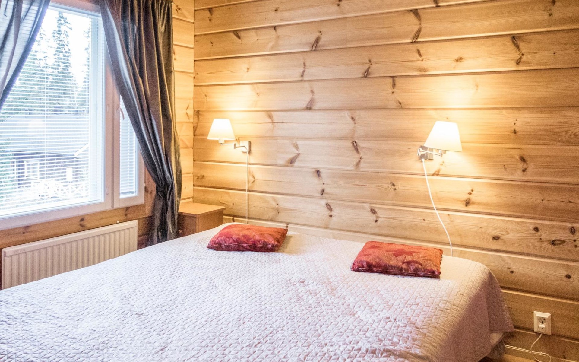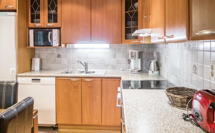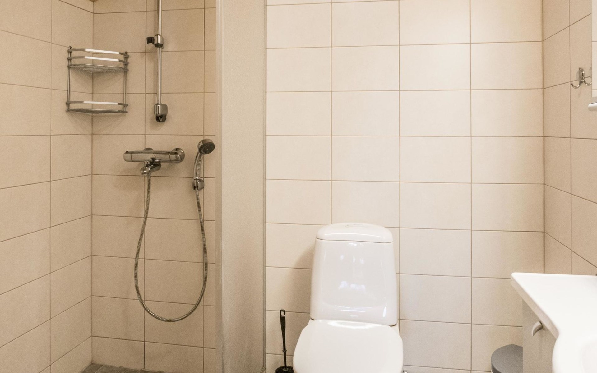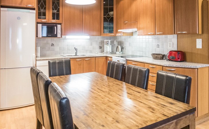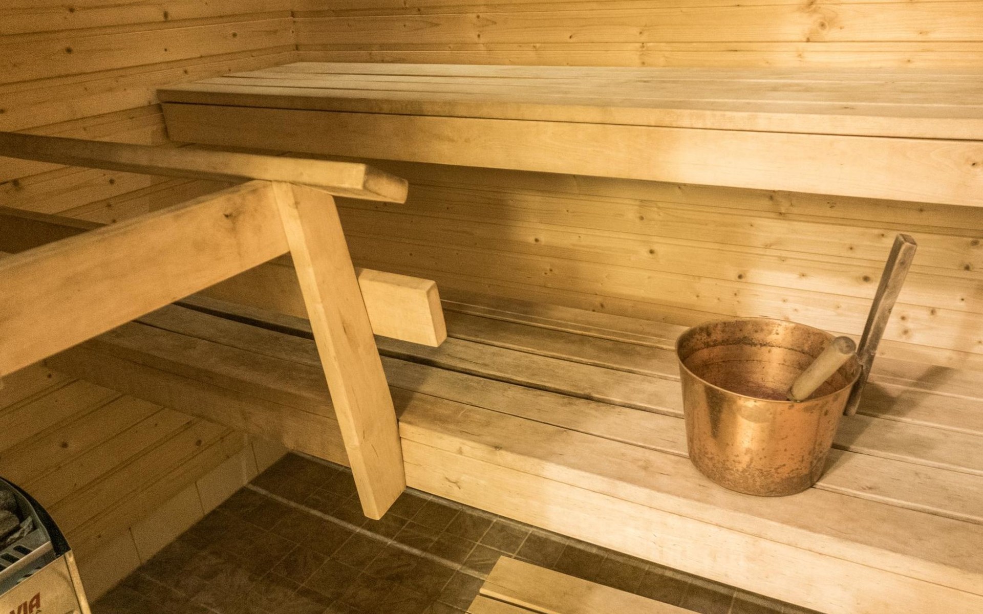 Floor area 84.5m². On the ground floor there is combined living room & kitchen, bedroom with twin bed, sauna (electric heating), washroom and toilet. Upstairs there is sofabed for two persons and two bedrooms, both with separate beds for two, shower/toilet.