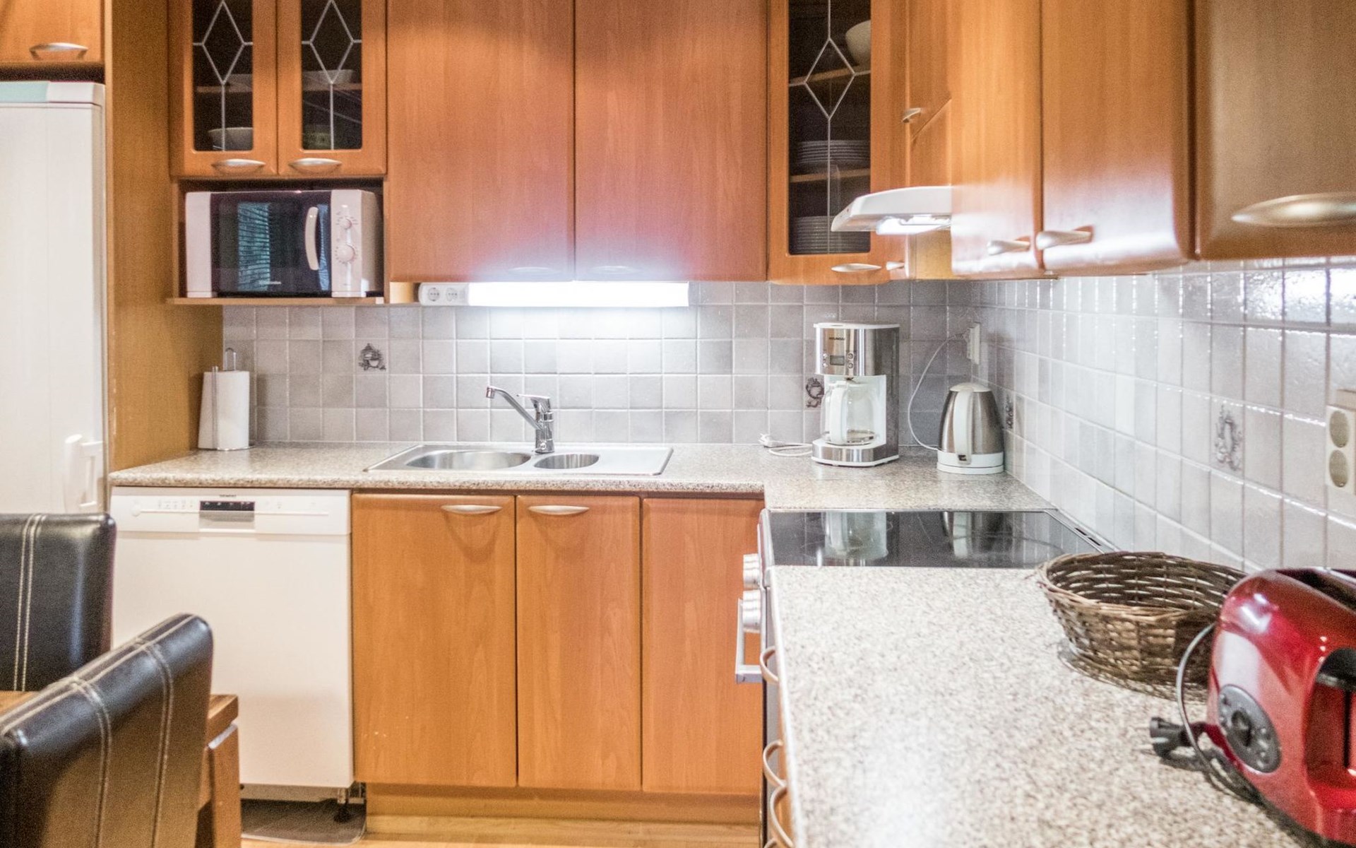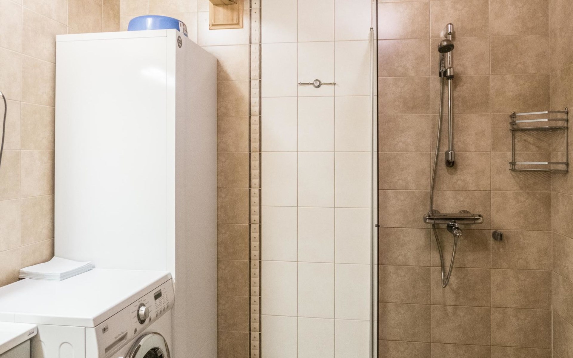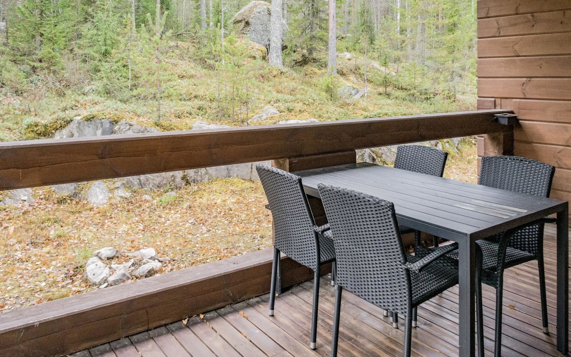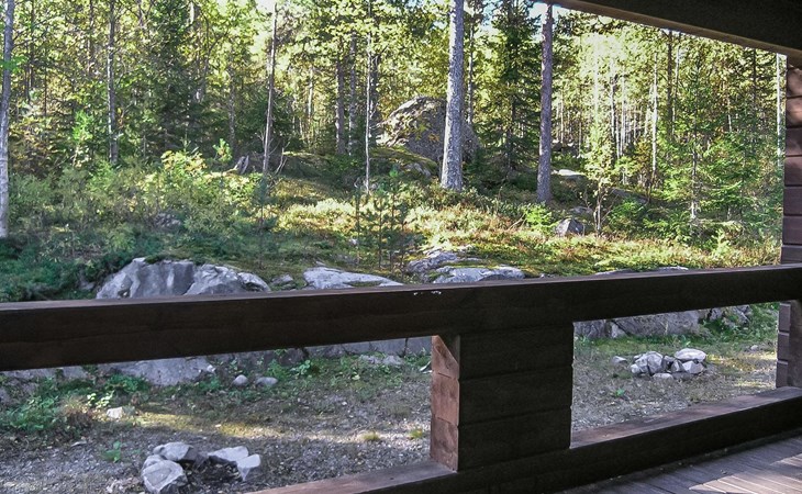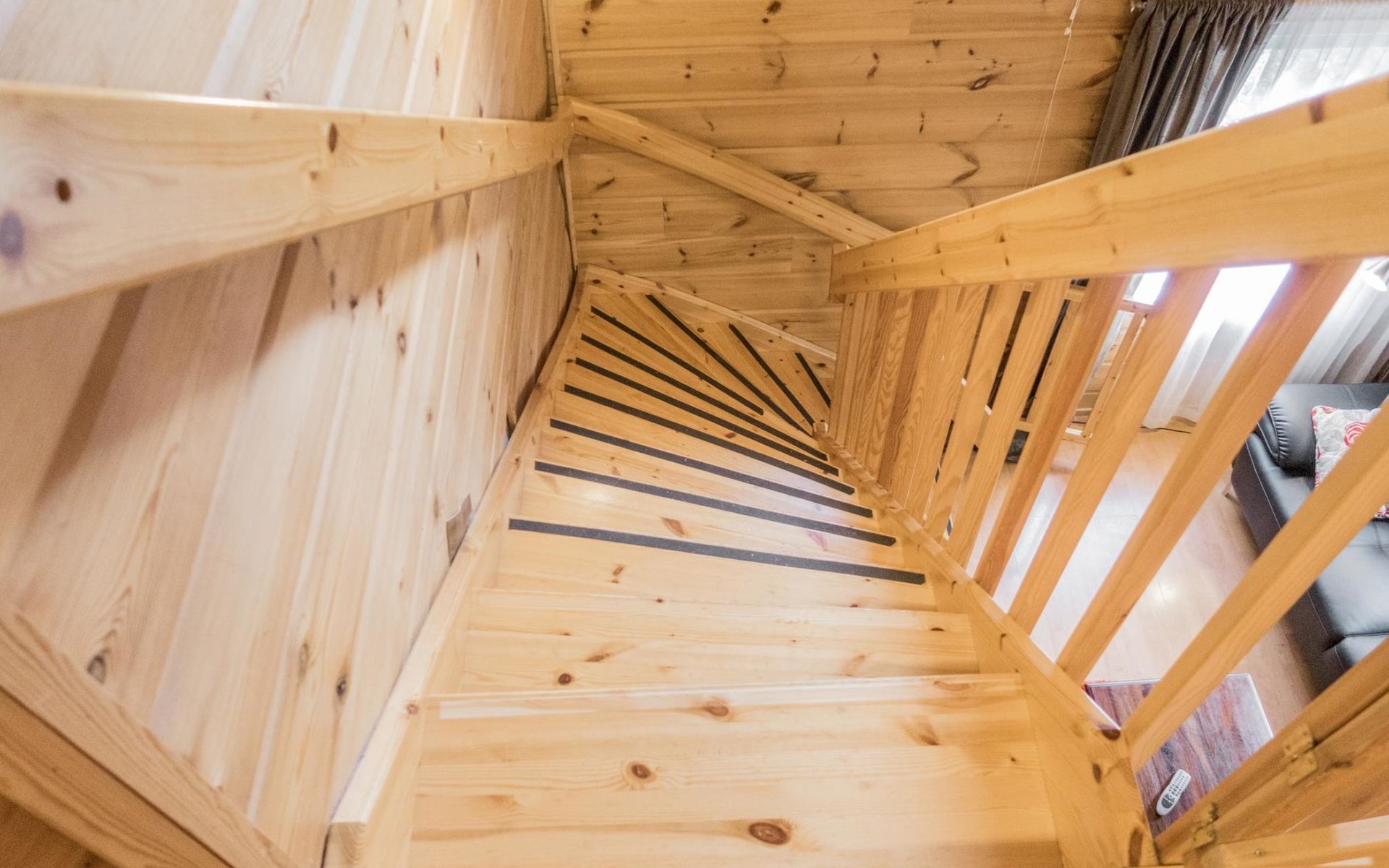 Floor area 84.5m². On the ground floor there is combined living room & kitchen, bedroom with twin bed, sauna (electric heating), washroom and toilet. Upstairs there is sofabed for two persons and two bedrooms, both with separate beds for two, shower/toilet.