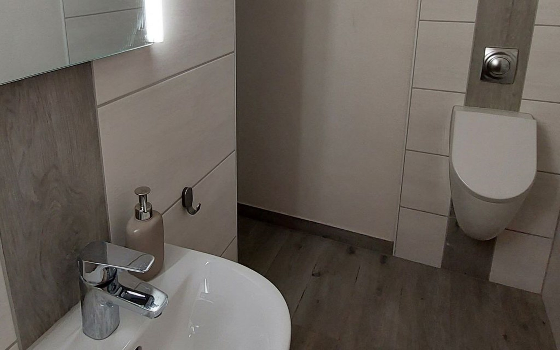 Other bathroom furnishings: vanity mirror, stool, hairdryer, hand soap, toilet paper