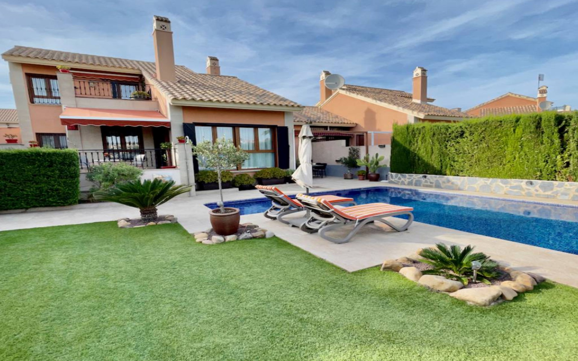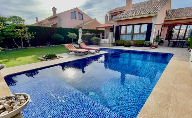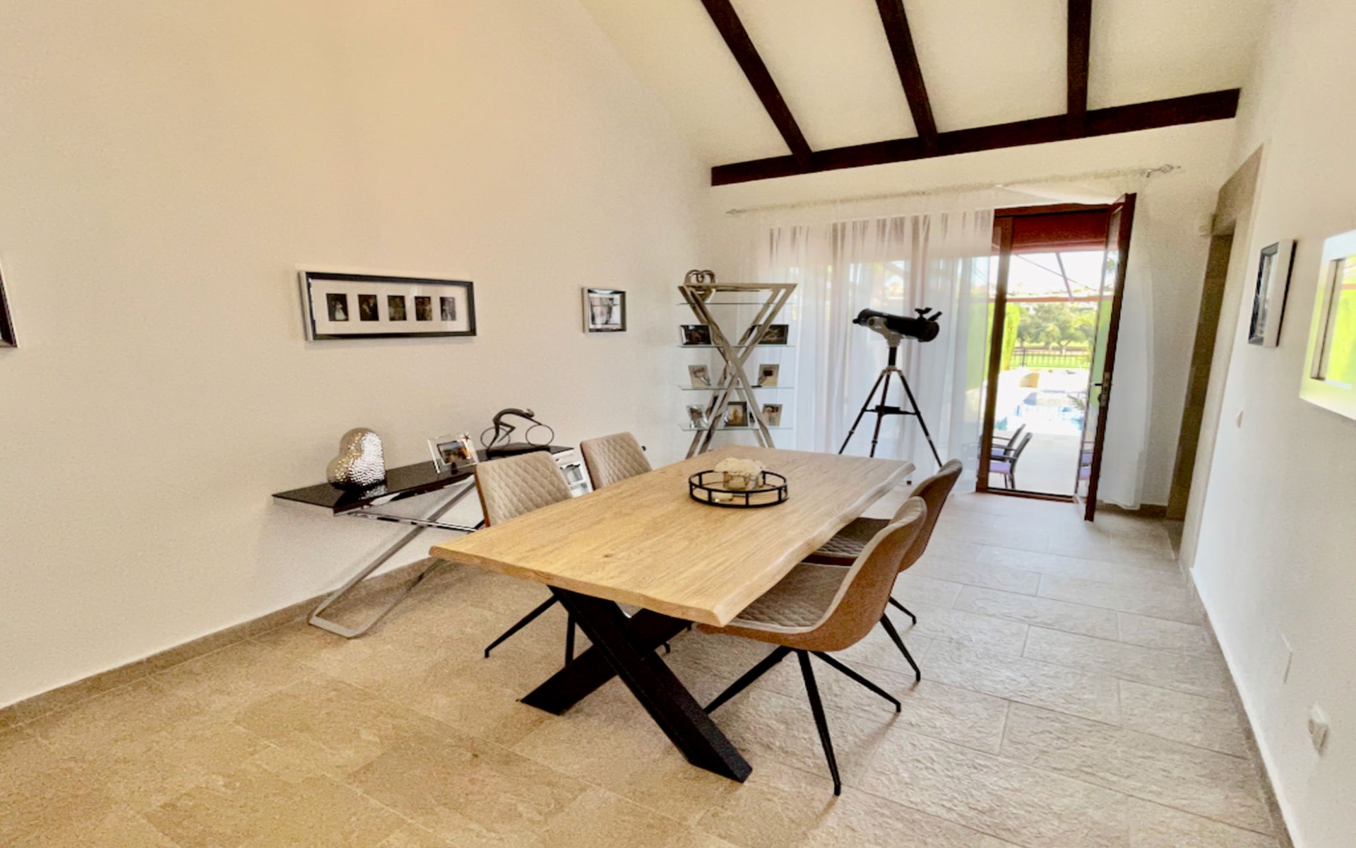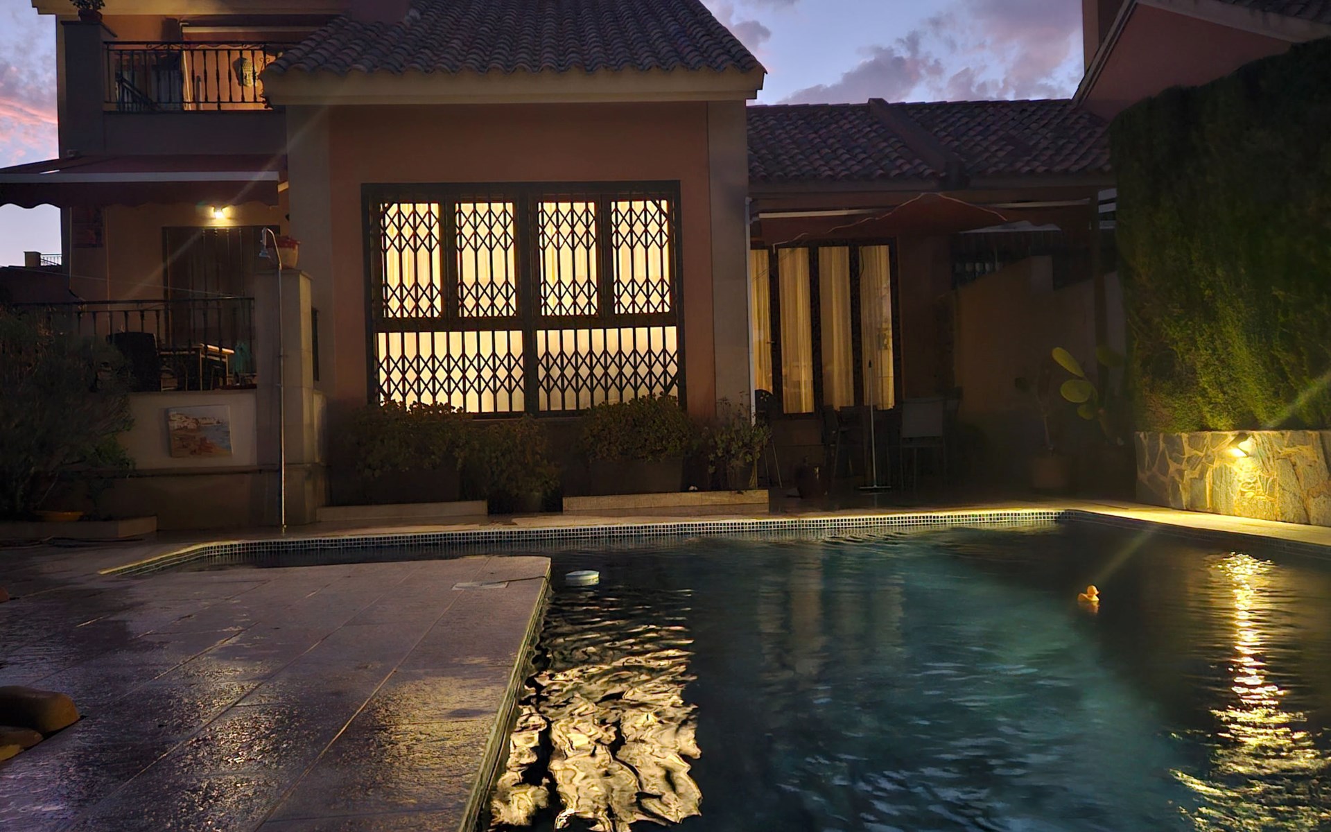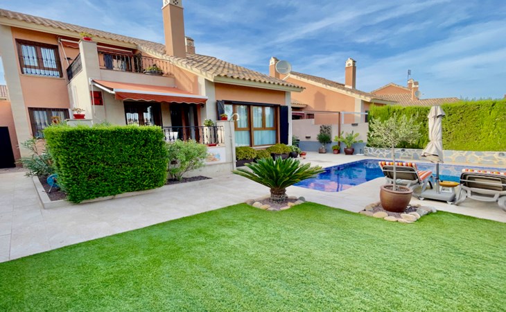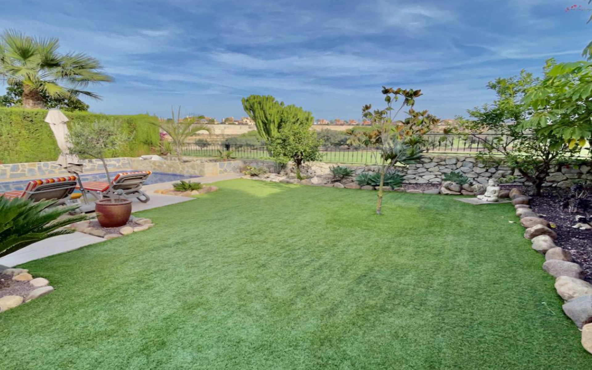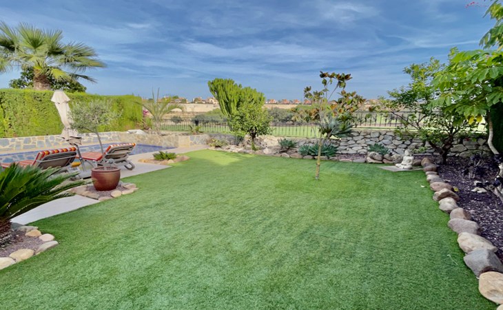 Beautiful house "La Finca Frontline", 2 storeys, semi-detached. 7 km from the centre of Los Montesinos, 9 km from the centre of Quesada, in a quiet, sunny position residential area (villas), traffic calmed area, 16 km from the sea, 16 km from the beach, on the golf course. Private: property (fenced), beautiful, well-kept garden, swimming pool (8 x 4 m, seasonal availability: 01.Jan. - 31.Dec.) with internal staircase. Outdoor shower, terrace, garden furniture, barbecue. Grocery 2 km, supermarket 2 km, restaurant 2 km, bus stop 2 km, sandy beach "Playa La Mata" 20 km. Golf course (12 hole) 200 m. The owner does not accept any youth groups.