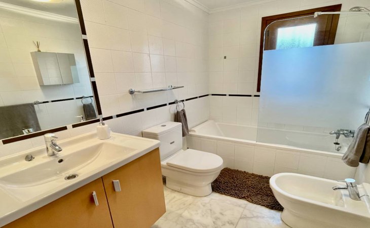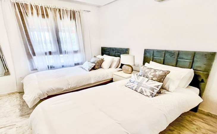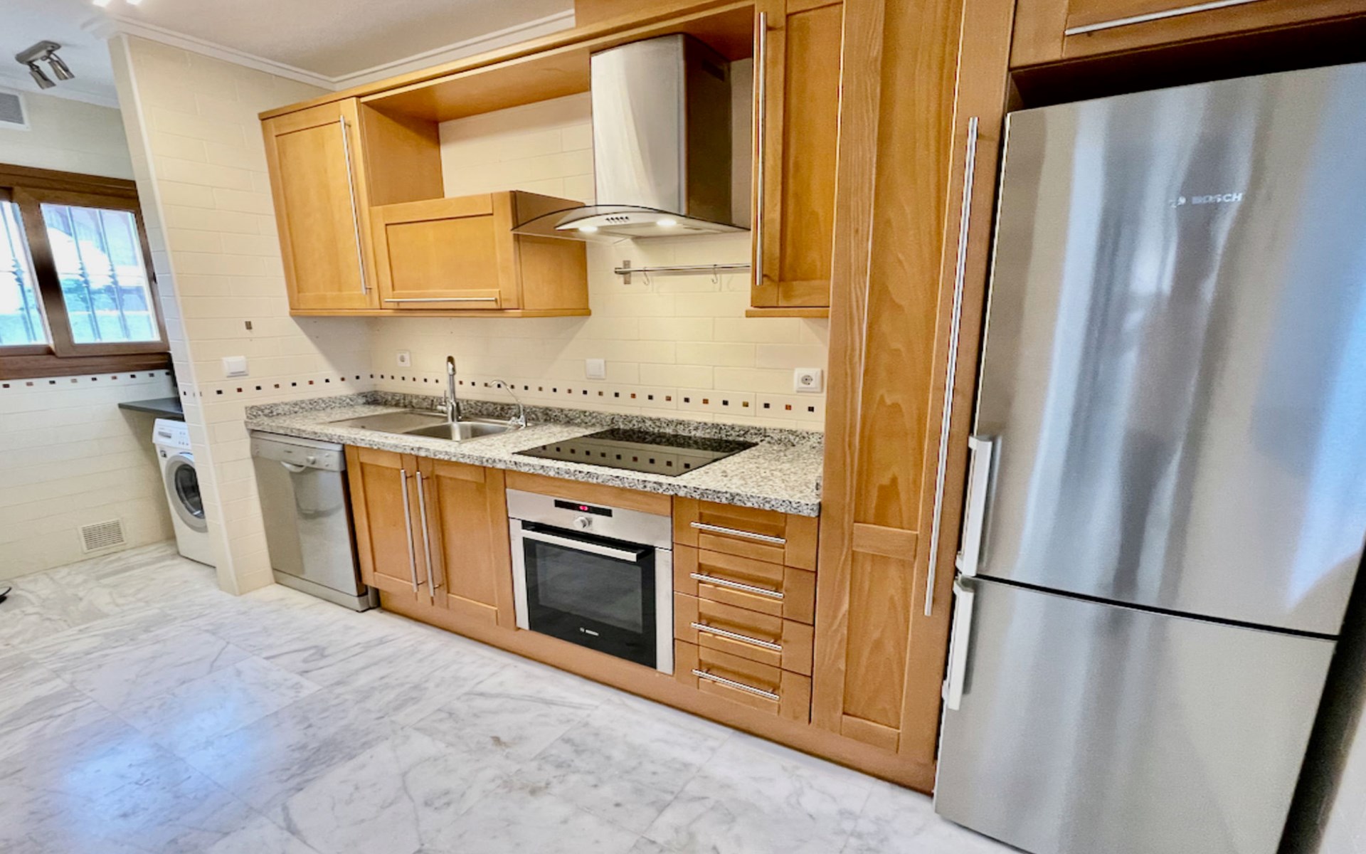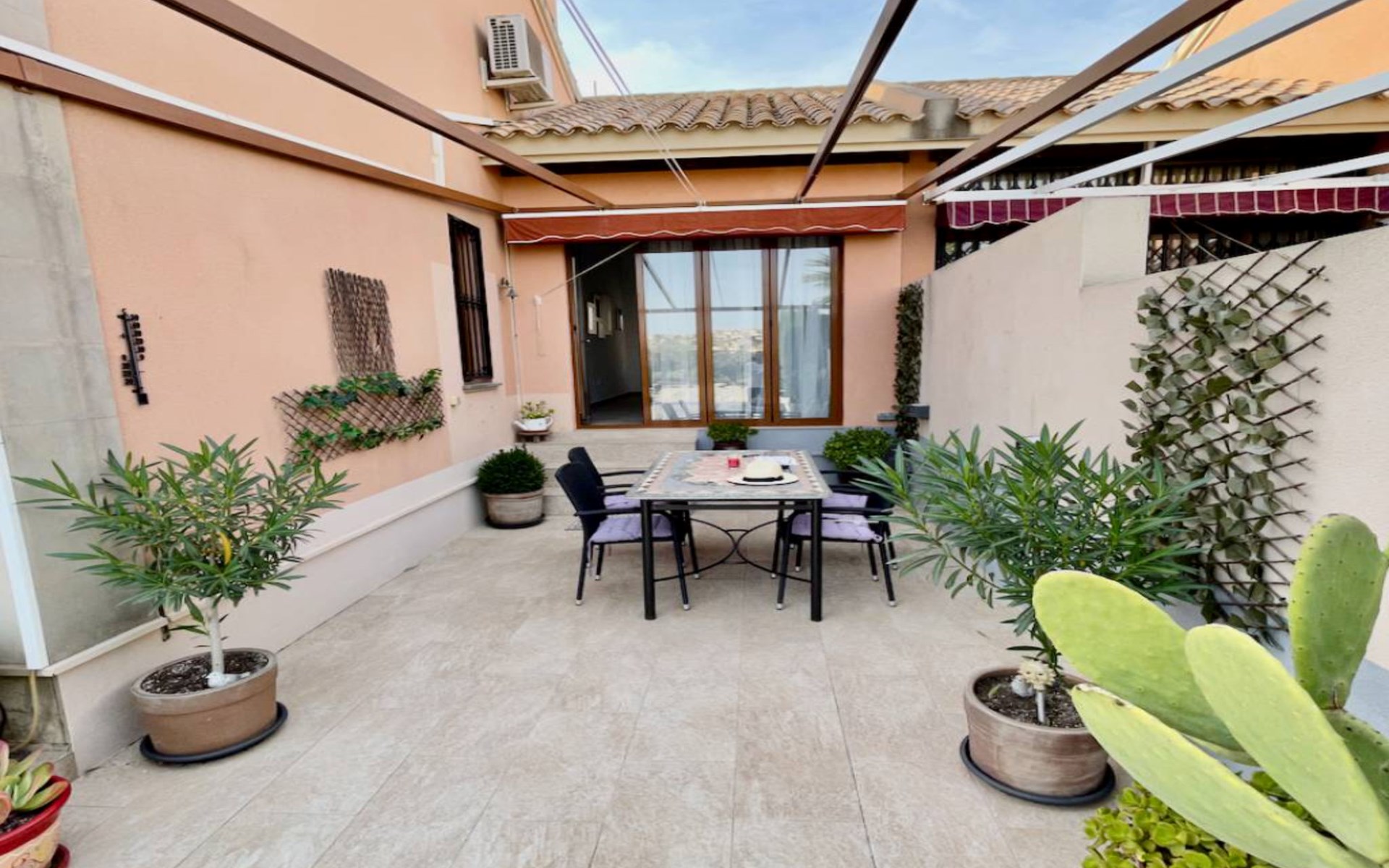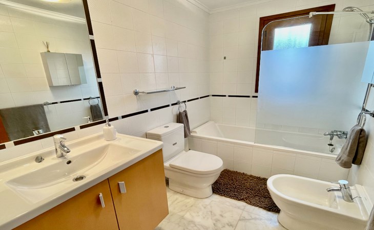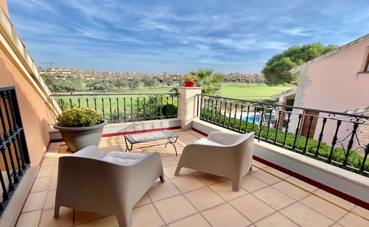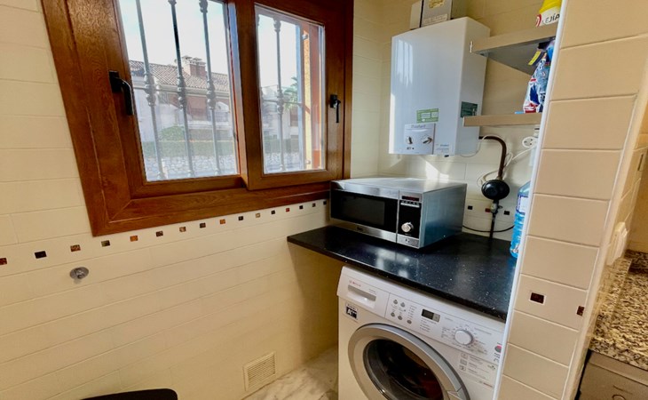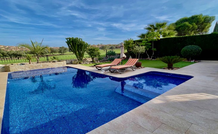 Beautiful house "La Finca Frontline", 2 storeys, semi-detached. 7 km from the centre of Los Montesinos, 9 km from the centre of Quesada, in a quiet, sunny position residential area (villas), traffic calmed area, 16 km from the sea, 16 km from the beach, on the golf course. Private: property (fenced), beautiful, well-kept garden, swimming pool (8 x 4 m, seasonal availability: 01.Jan. - 31.Dec.) with internal staircase. Outdoor shower, terrace, garden furniture, barbecue. Grocery 2 km, supermarket 2 km, restaurant 2 km, bus stop 2 km, sandy beach "Playa La Mata" 20 km. Golf course (12 hole) 200 m. The owner does not accept any youth groups.