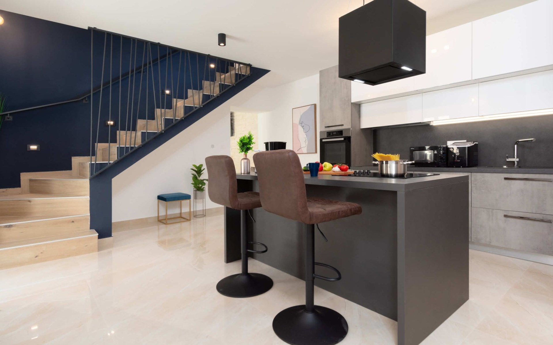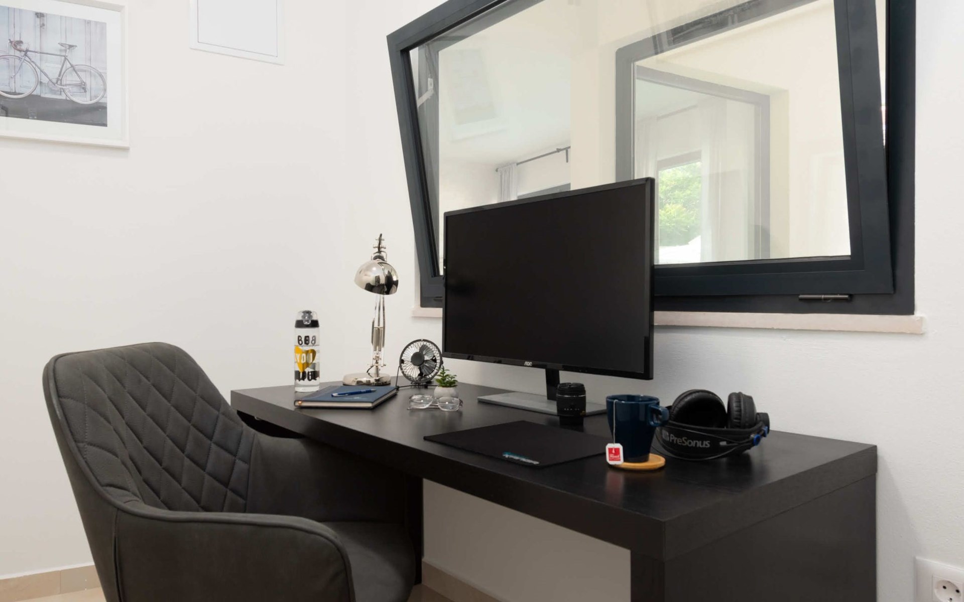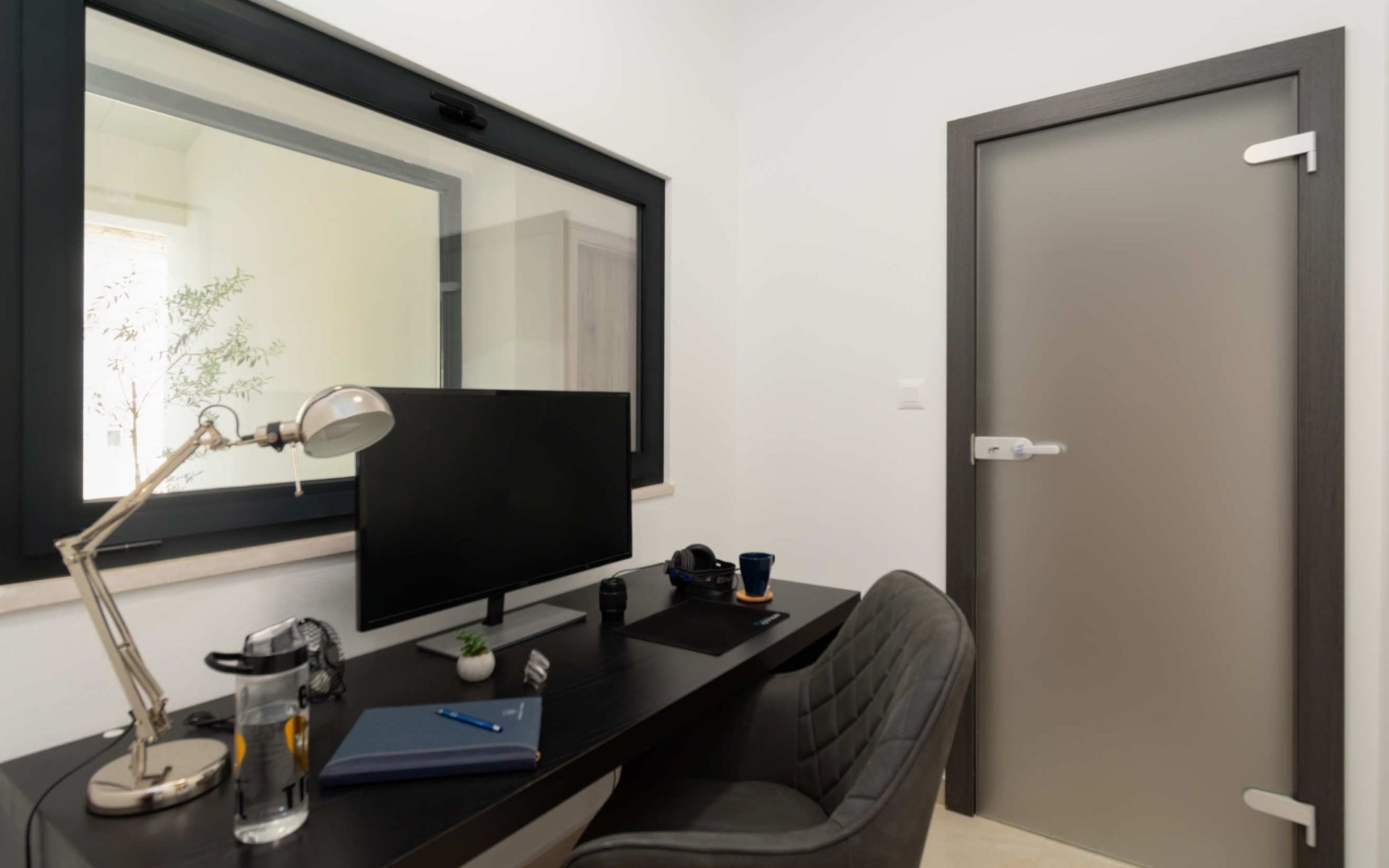 Inside, Villa Simone is a haven of comfort and luxury spread across two floors. The ground floor boasts a spacious, air-conditioned living area with a large sofa that doubles as a sleeping area for two, complemented by additional seating, a small desk, a USB-C outlet for charging devices, and dimmable LED lights. Entertainment is guaranteed with a 70-inch satellite smart TV offering 4K resolution and complimentary Netflix & Prime Video. The adjoining kitchen is fully equipped with an oven, dishwasher, fridge, freezer, electric stoves, kitchen hoods, and much more, ensuring you have everything you need at your fingertips. A separate dining room with large windows, a dedicated TV, and air conditioning offers the perfect setting for meals, while other spaces on the ground floor include a bedroom with pool views, a laundry room, a stylish bathroom, and a dedicated office space.