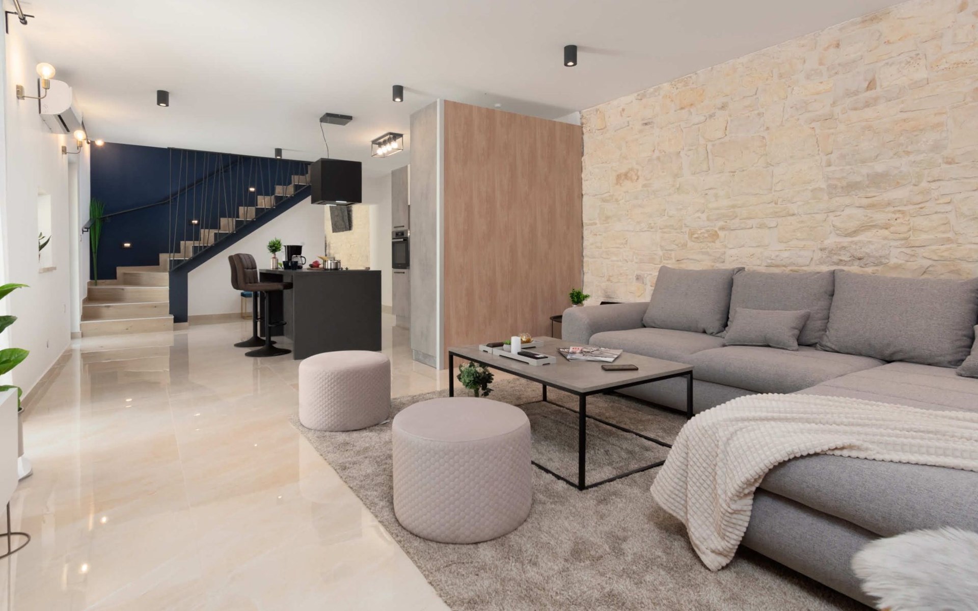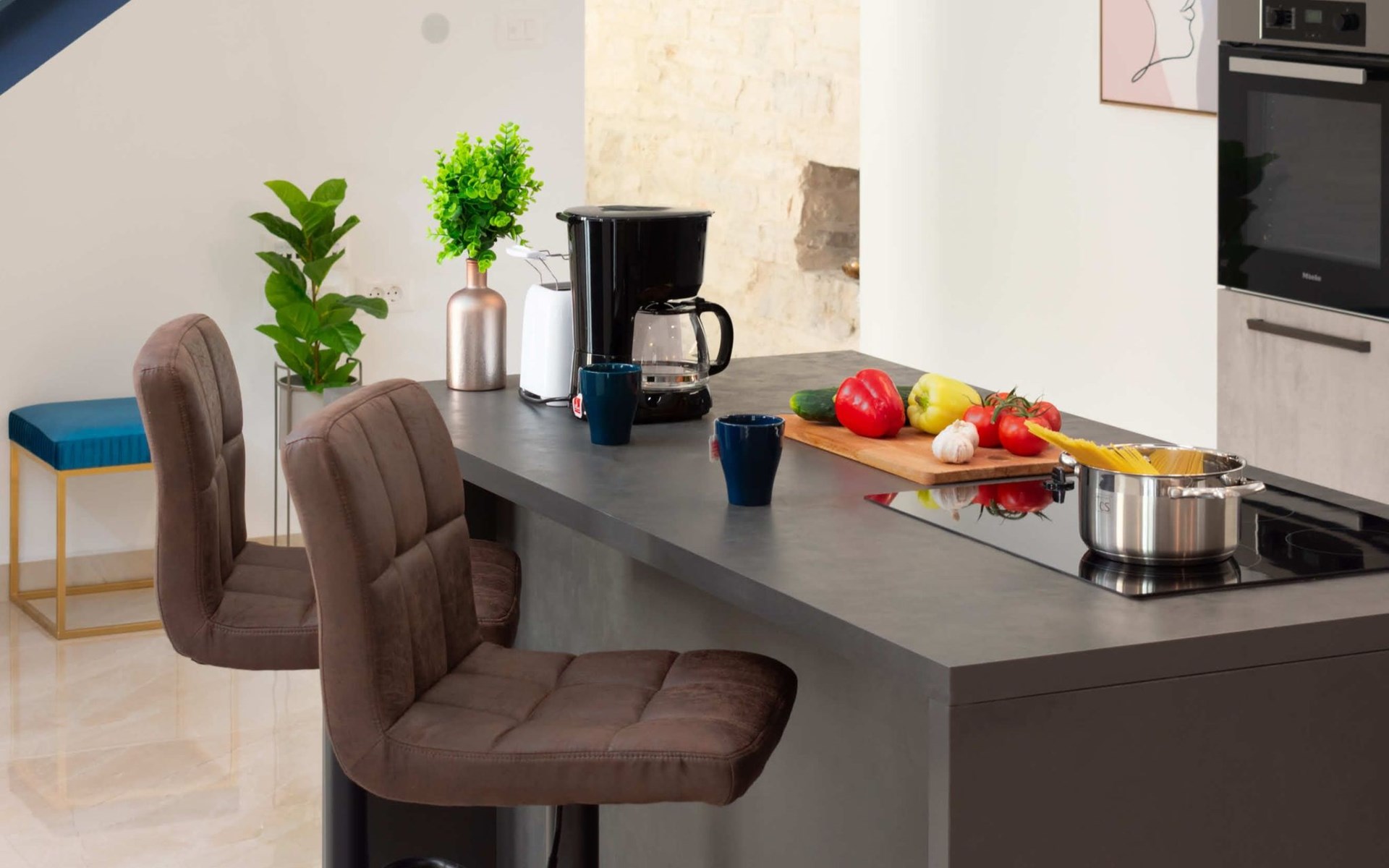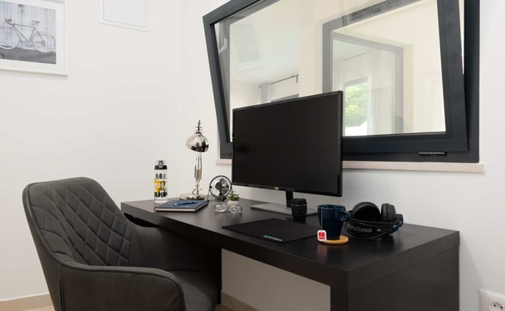 Inside, Villa Simone is a haven of comfort and luxury spread across two floors. The ground floor boasts a spacious, air-conditioned living area with a large sofa that doubles as a sleeping area for two, complemented by additional seating, a small desk, a USB-C outlet for charging devices, and dimmable LED lights. Entertainment is guaranteed with a 70-inch satellite smart TV offering 4K resolution and complimentary Netflix & Prime Video. The adjoining kitchen is fully equipped with an oven, dishwasher, fridge, freezer, electric stoves, kitchen hoods, and much more, ensuring you have everything you need at your fingertips. A separate dining room with large windows, a dedicated TV, and air conditioning offers the perfect setting for meals, while other spaces on the ground floor include a bedroom with pool views, a laundry room, a stylish bathroom, and a dedicated office space.