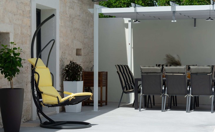 The outdoor area of Villa Simone is a verdant oasis entirely fenced for utmost privacy, ideal for families with small children and pets. The jewel of the garden is a stunning 30 m2 swimming pool with built-in stairs, flanked by sun loungers and shade umbrellas for ultimate relaxation. An outdoor seating area, partially covered by a balcony, sits conveniently next to the dining room, allowing guests to enjoy outdoor entertainment effortlessly. Additional outdoor amenities include a pergola-covered dining area, a cozy floor sitting area perfect for children, and an electric grill set on a charming pebble area. A swing chair provides a serene spot for relaxation, and ample parking is available.