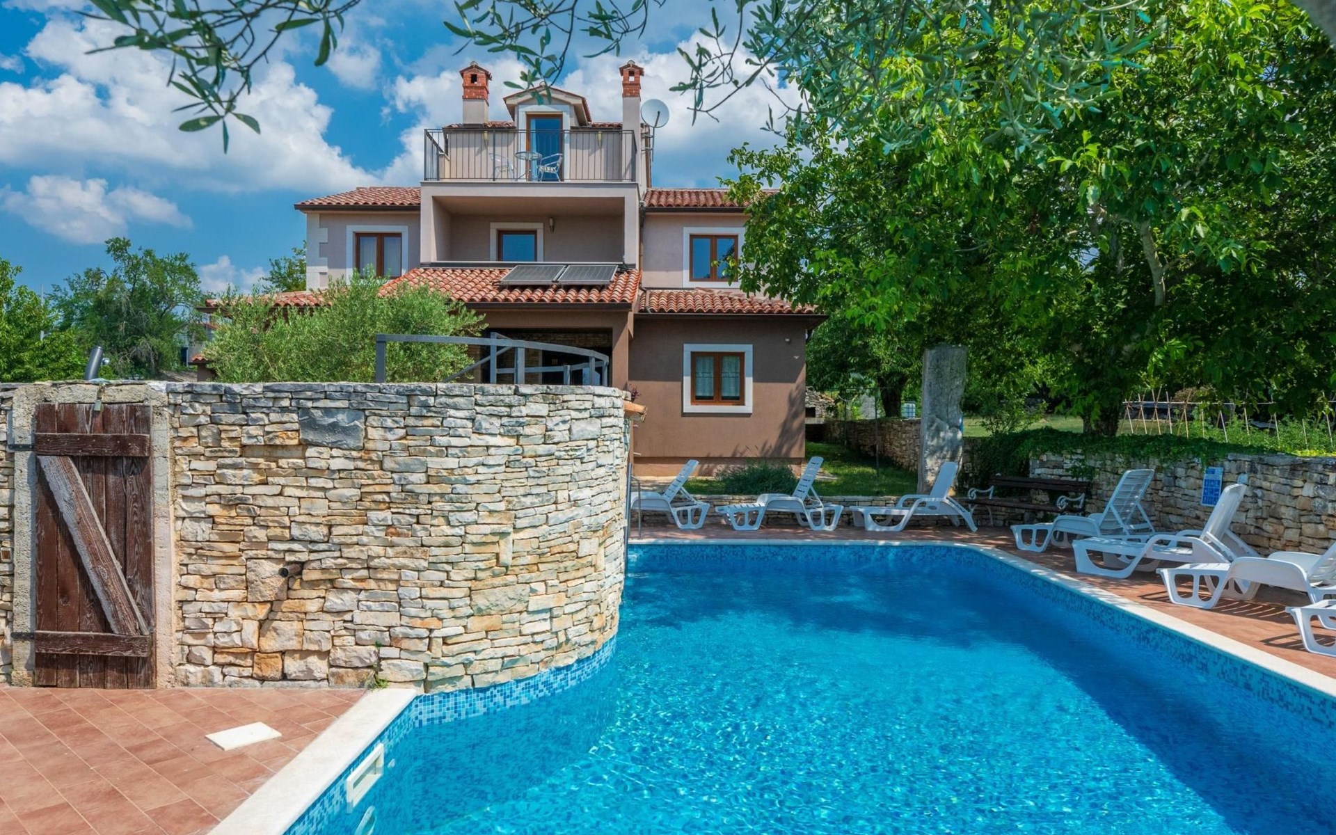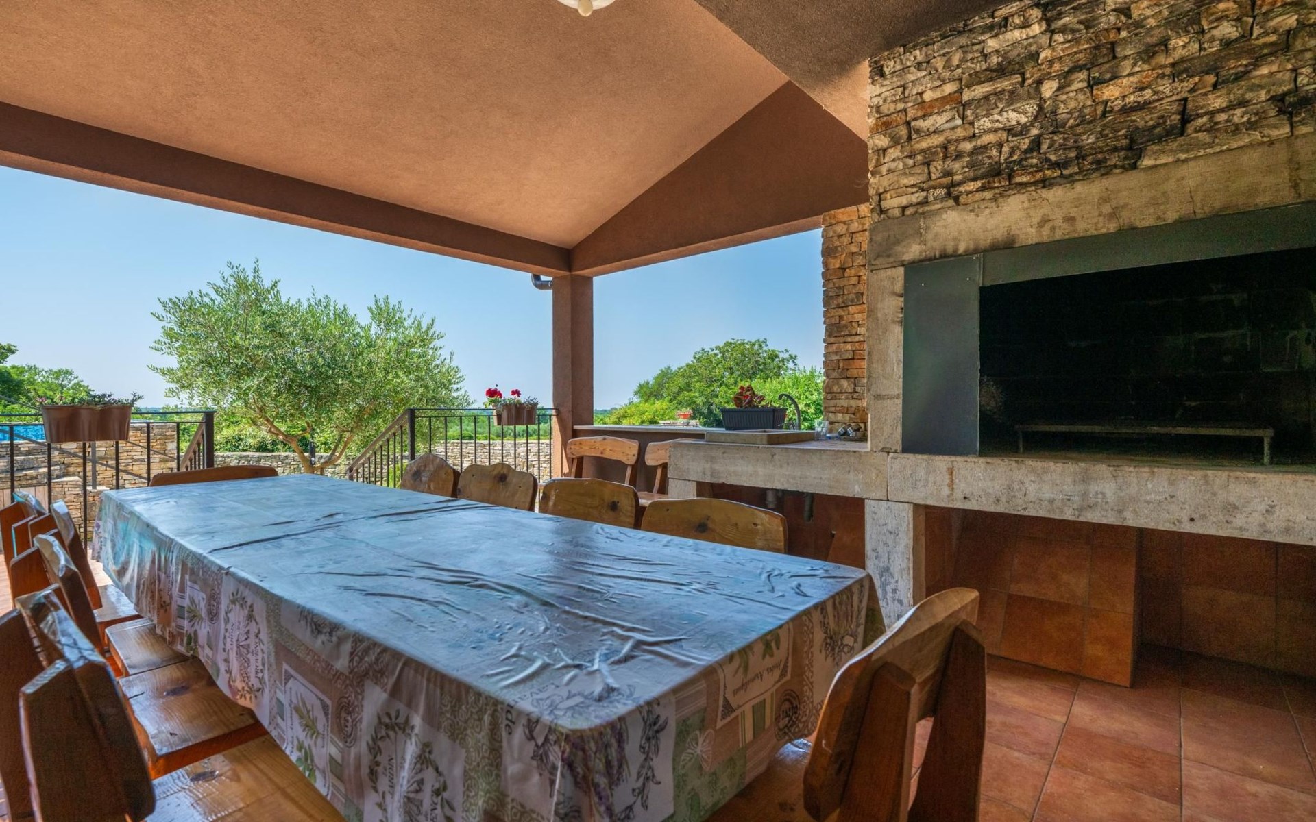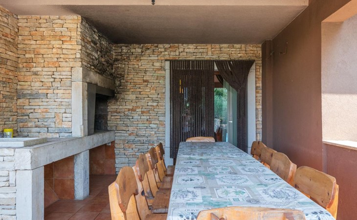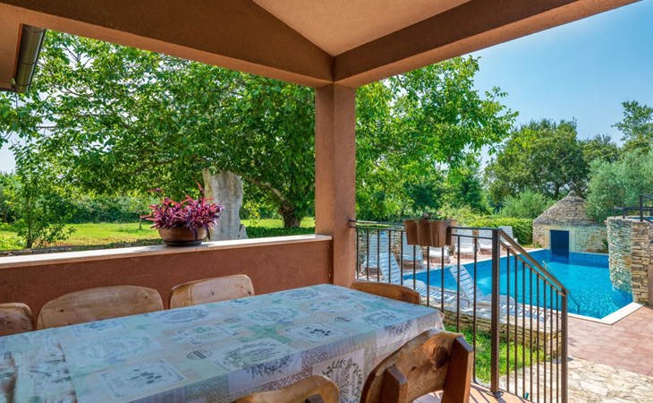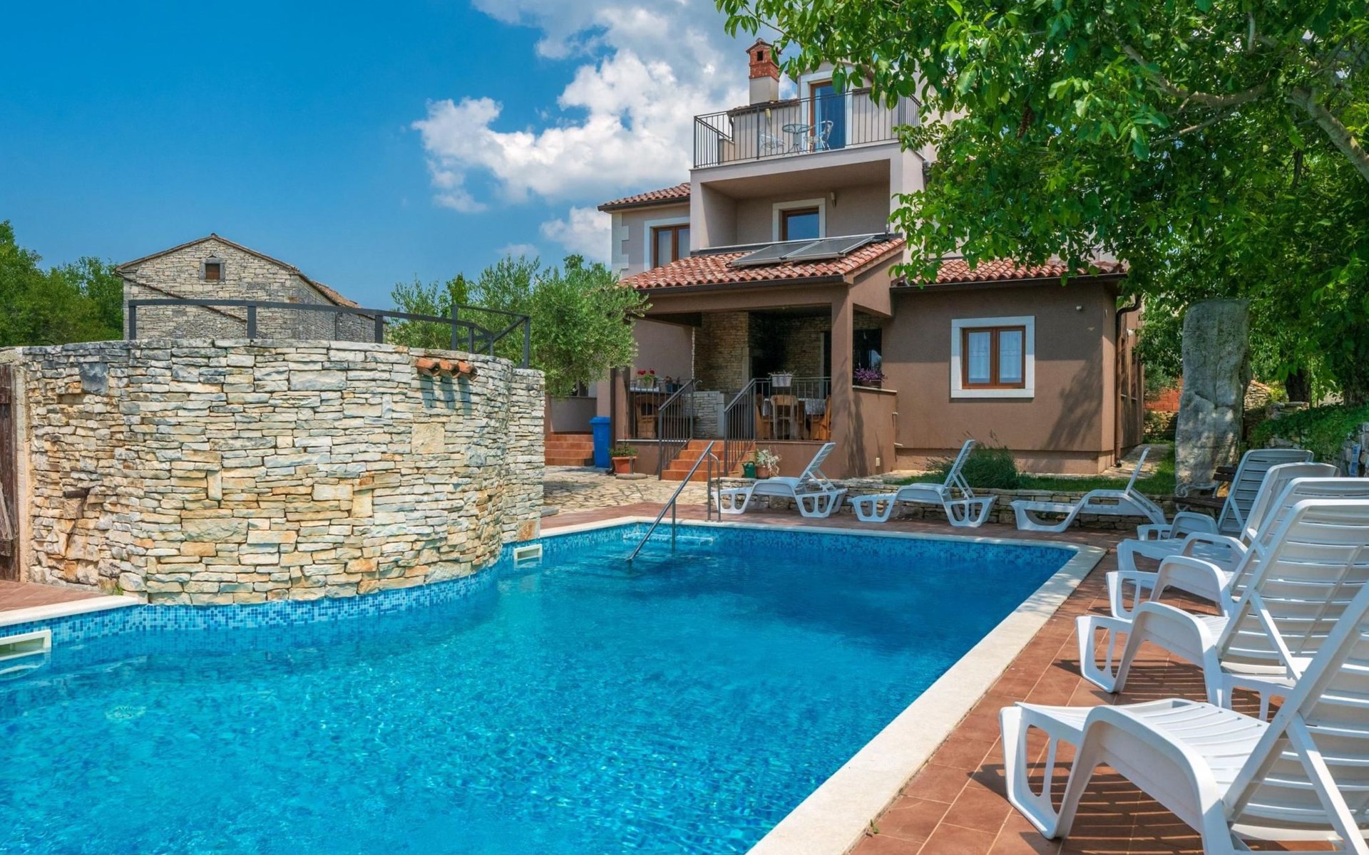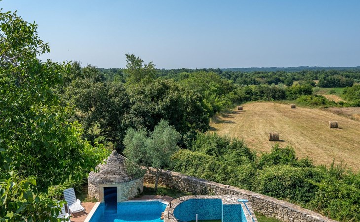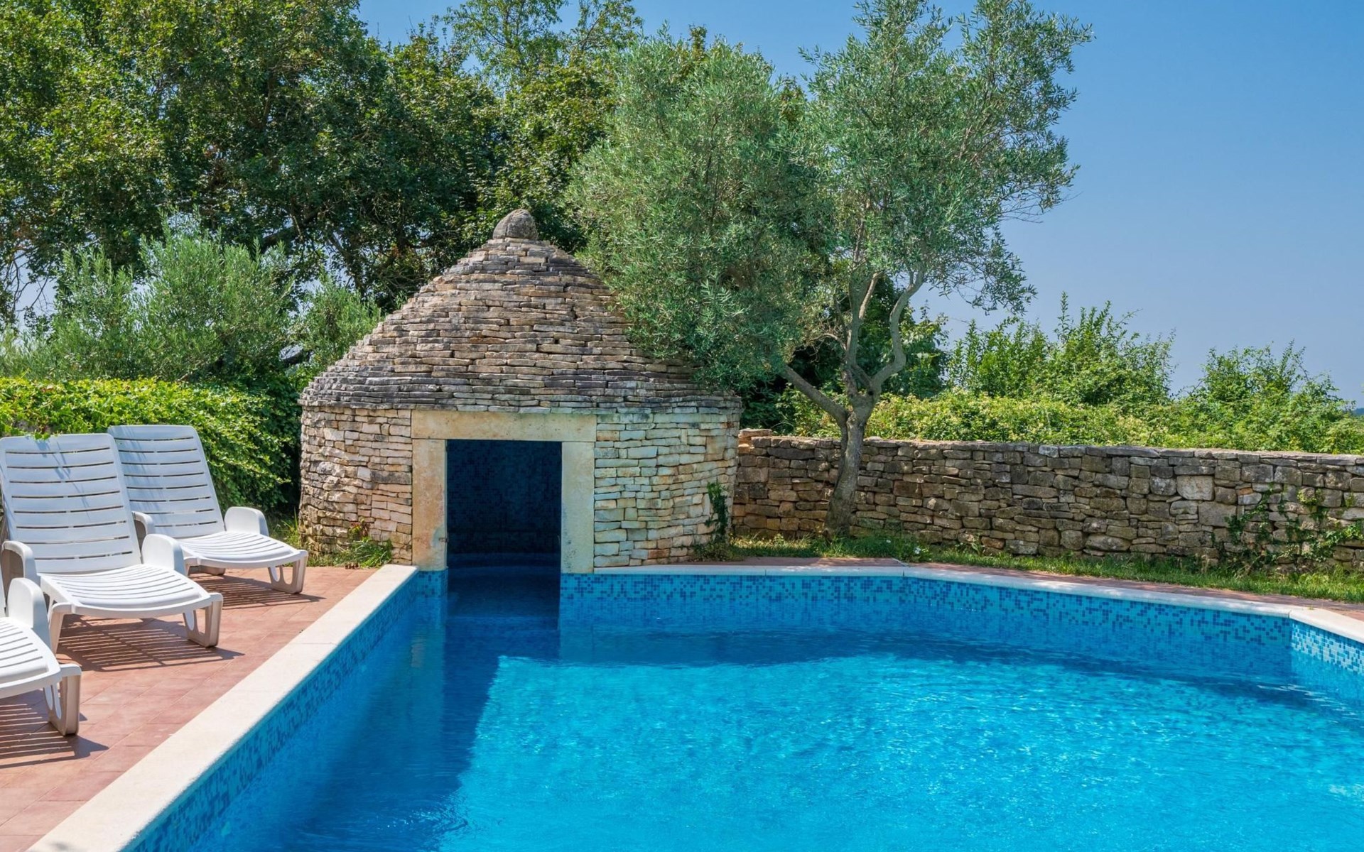 The outdoor area is a true highlight, centered around a private swimming pool surrounded by sunbeds. A traditional Istrian kažun stone hut adds rustic charm to the property, while the covered terrace and charcoal barbecue create the perfect setting for outdoor meals.